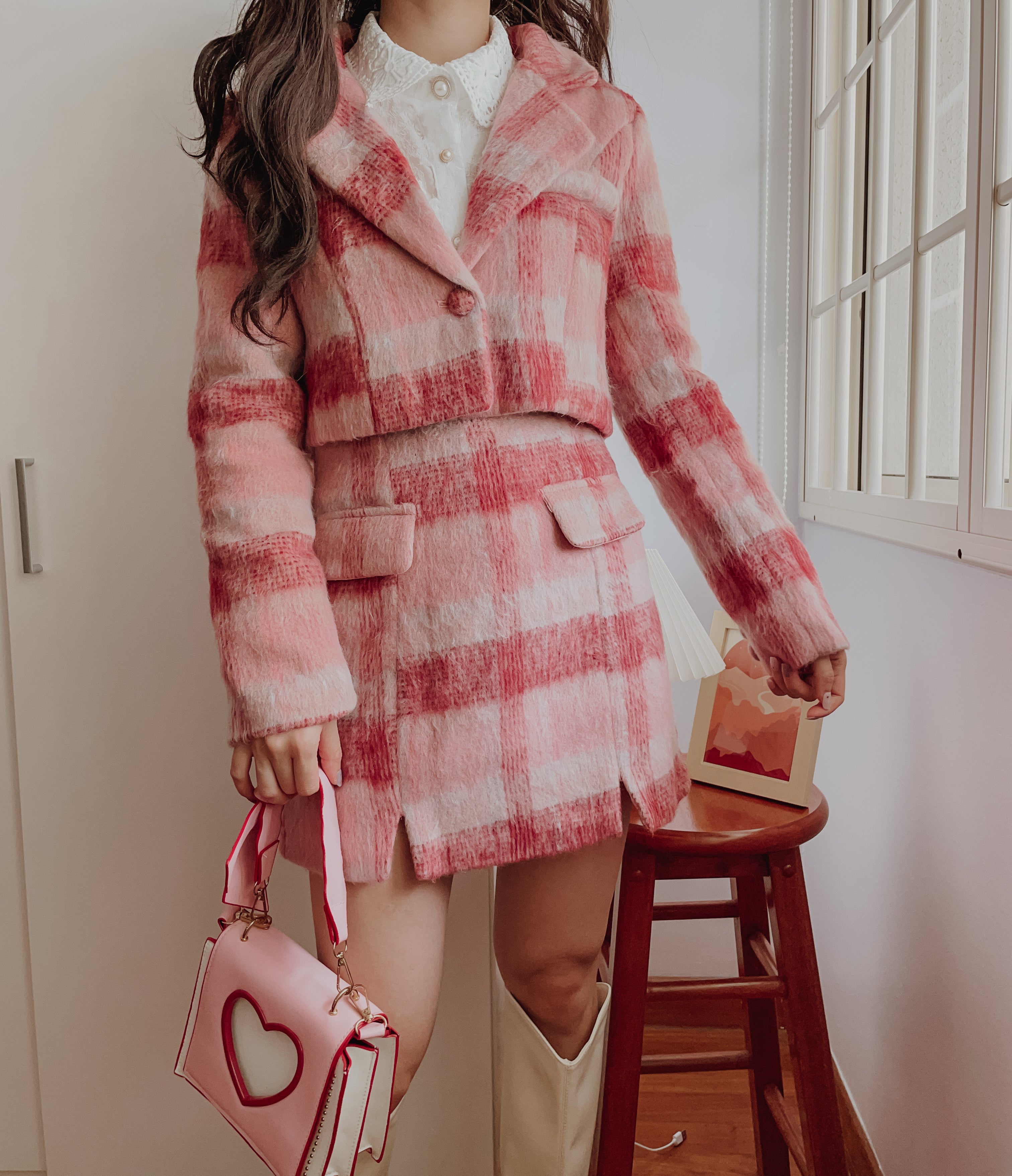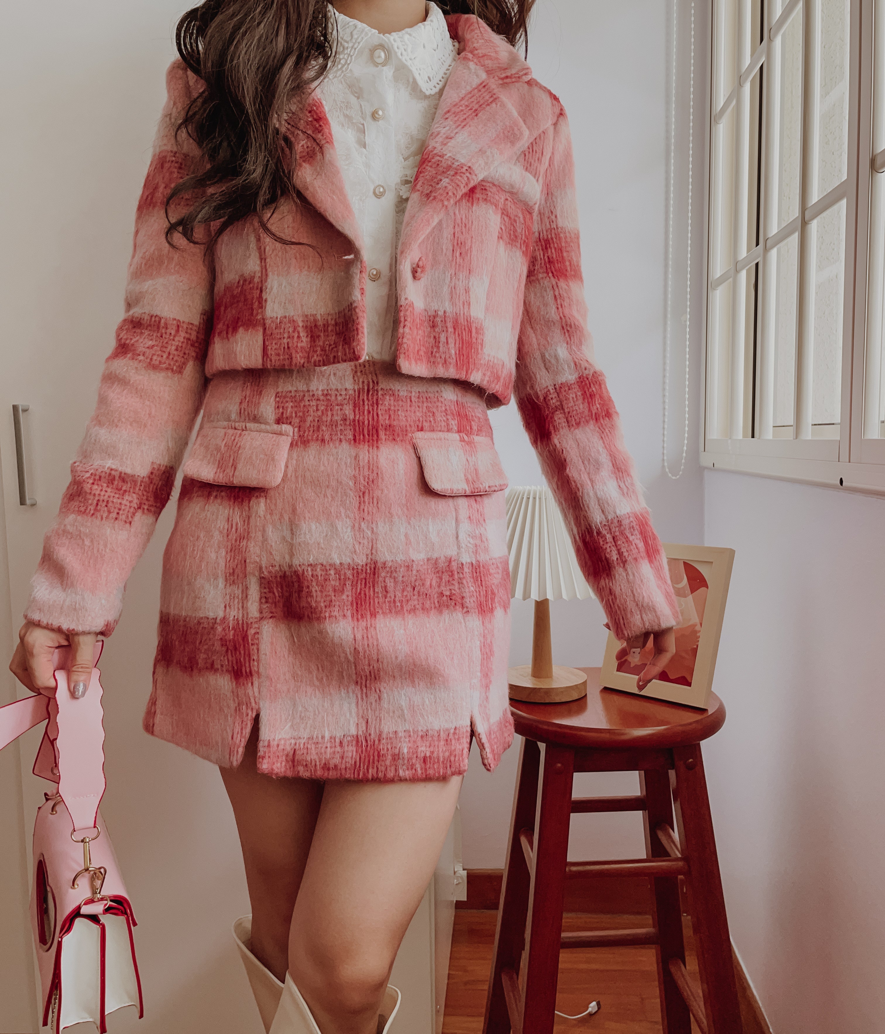 Passendes Set aus kurzem Blazer und Minirock mit Doppelschlitzen aus flauschigem Karostoff. Leicht wattiert. Verdeckter seitlicher Reißverschluss.