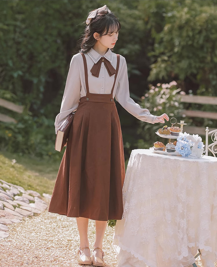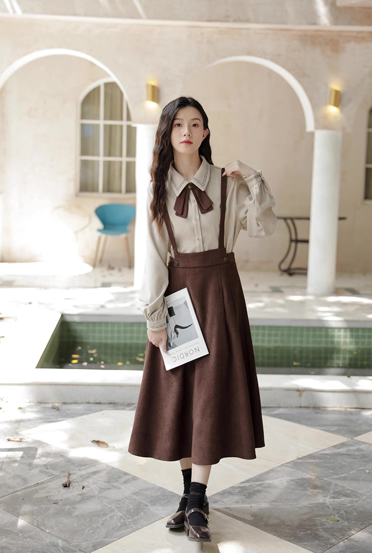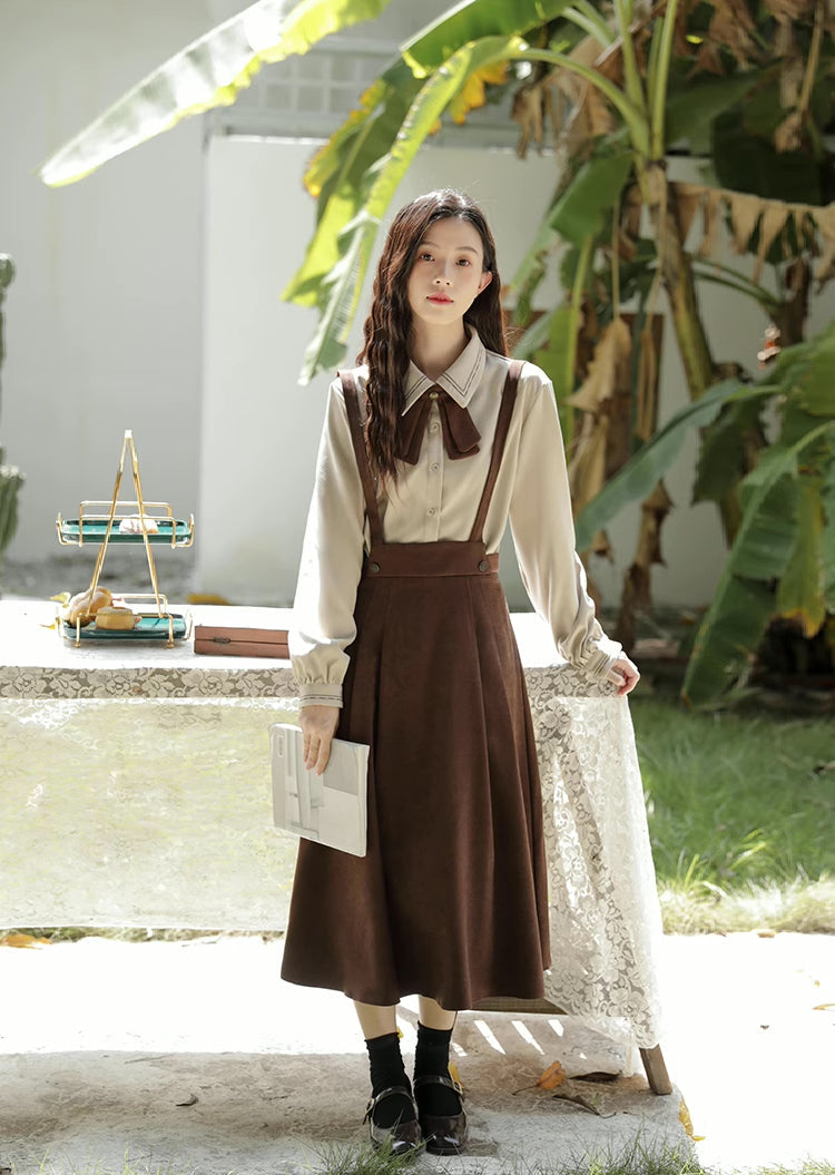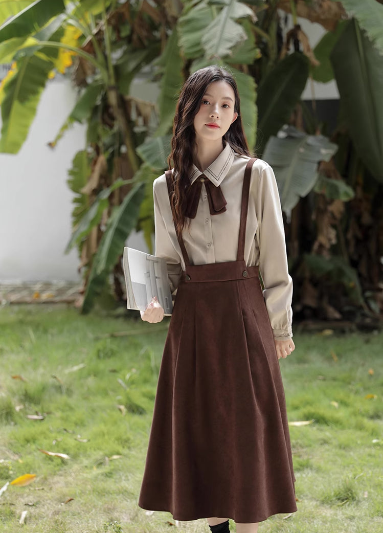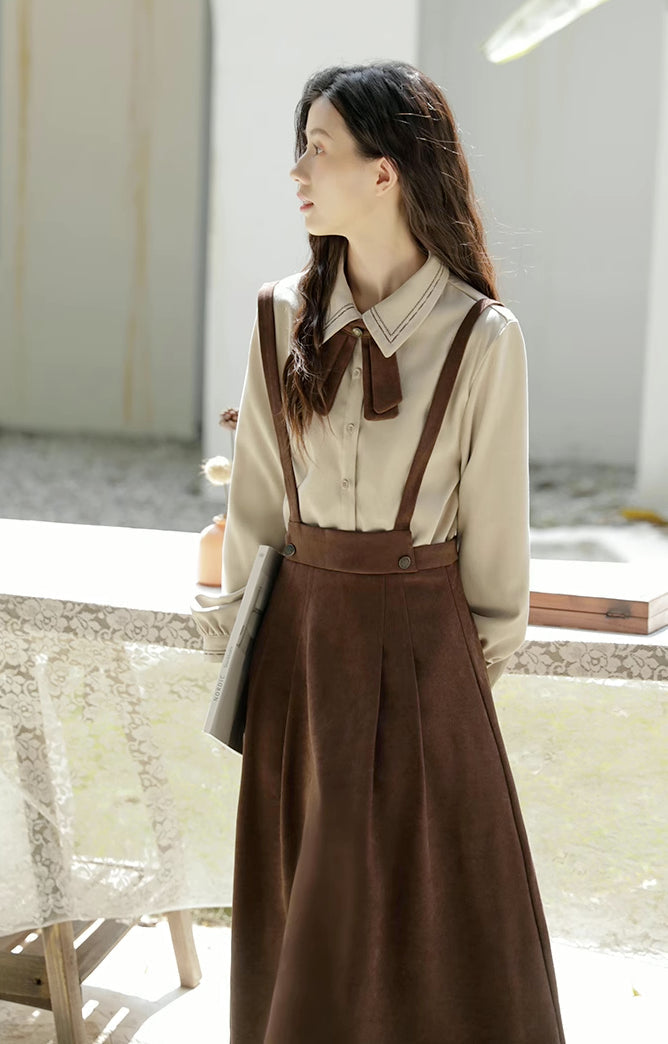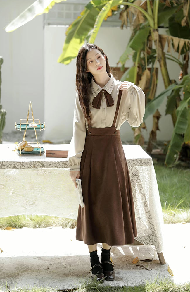 Midirock aus Wildledercord mit angenähten Strumpfhaltern, Falten und verdecktem Reißverschluss hinten. Passende Bluse aus Wildledercord mit gestickten Liniendetails und Nackenstück erhältlich.