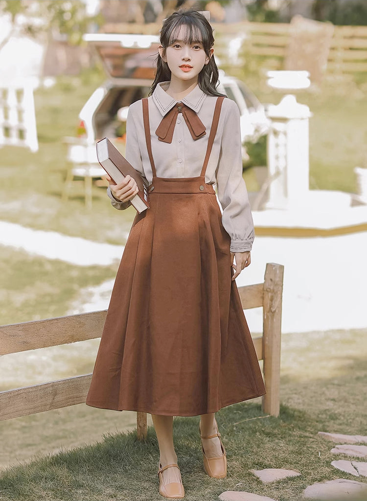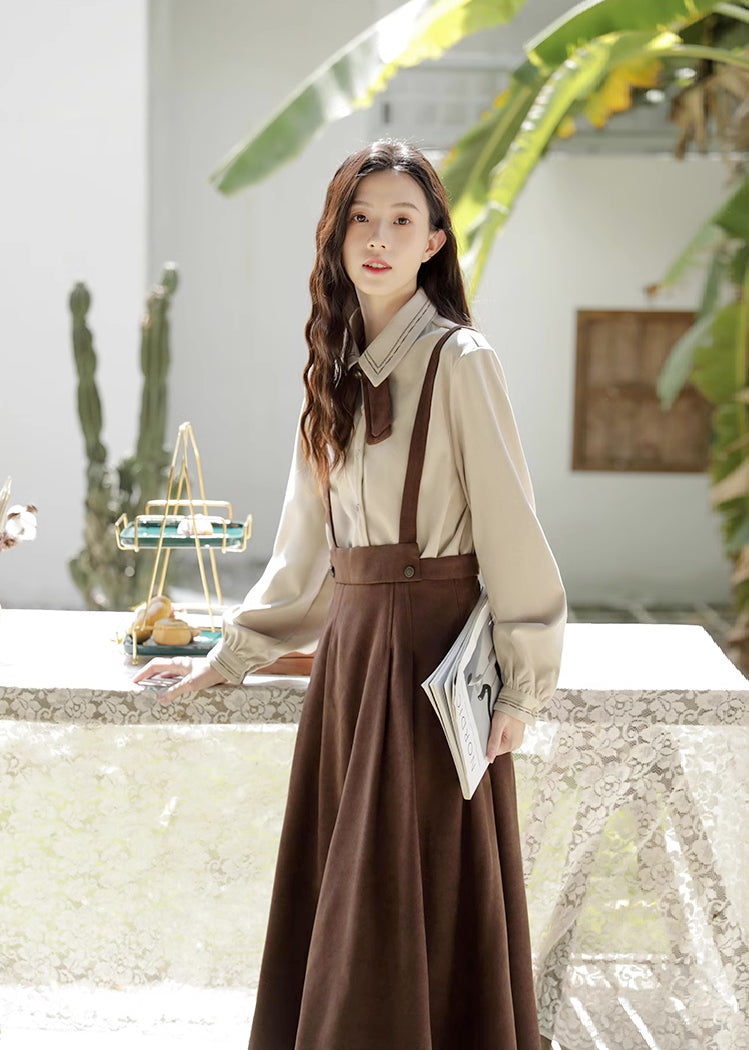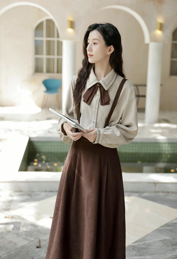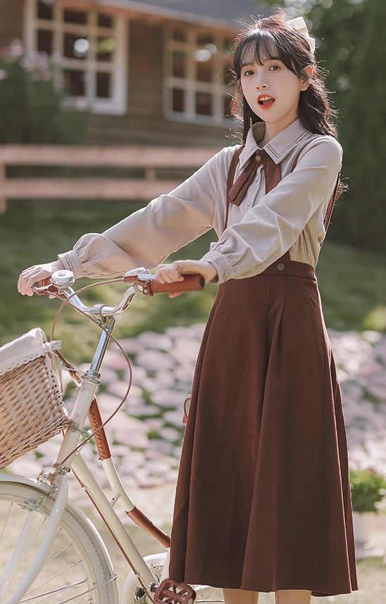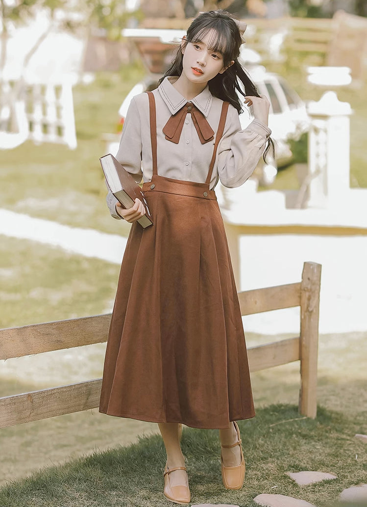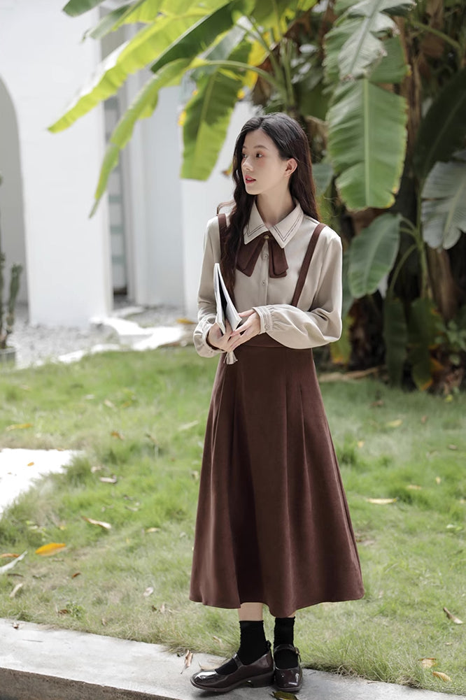 Midirock aus Wildledercord mit angenähten Strumpfhaltern, Falten und verdecktem Reißverschluss hinten. Passende Bluse aus Wildledercord mit gestickten Liniendetails und Nackenstück erhältlich.
