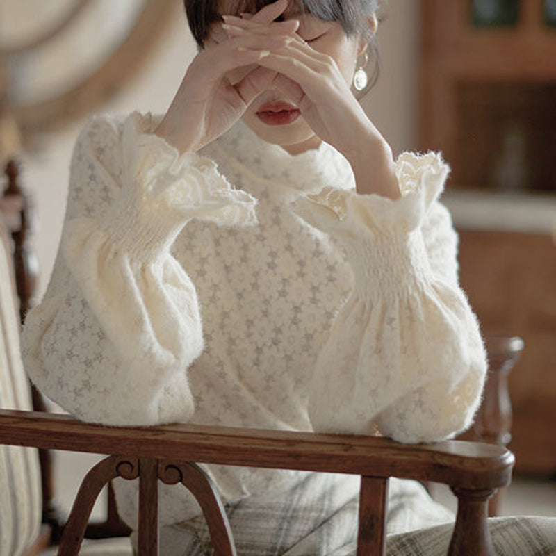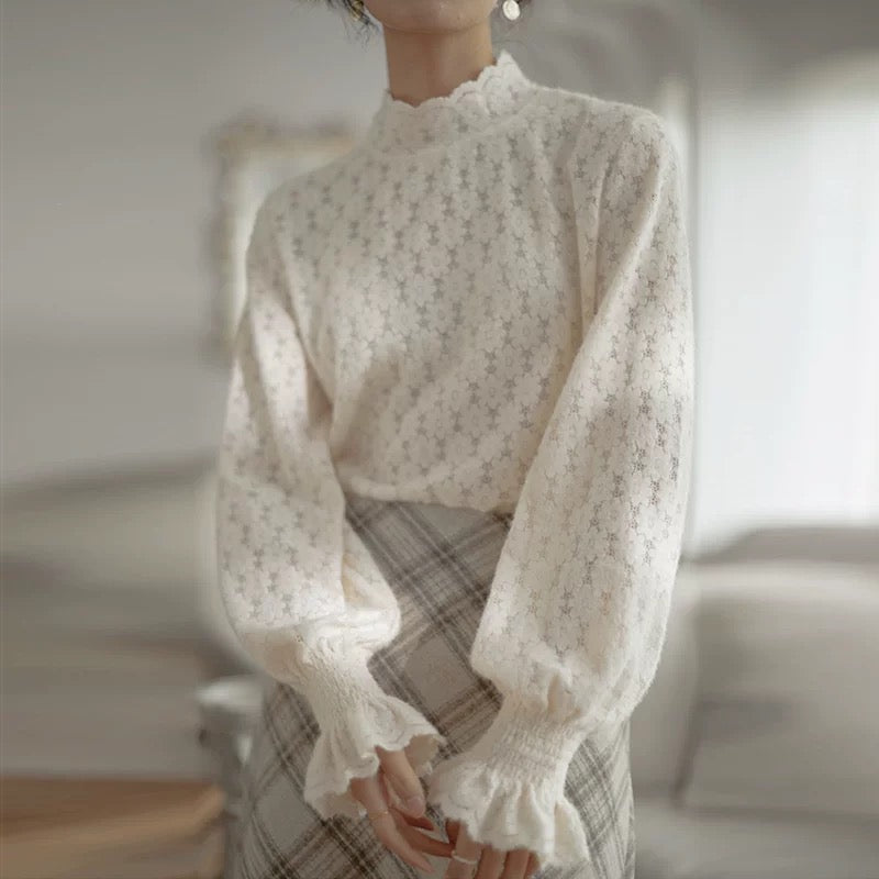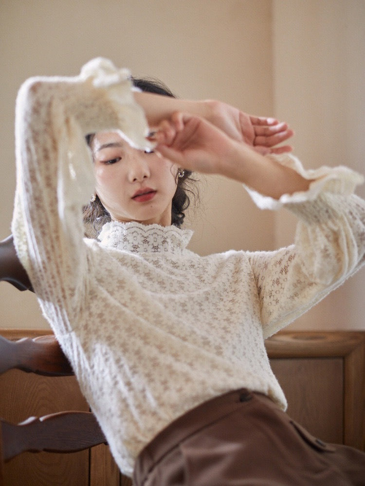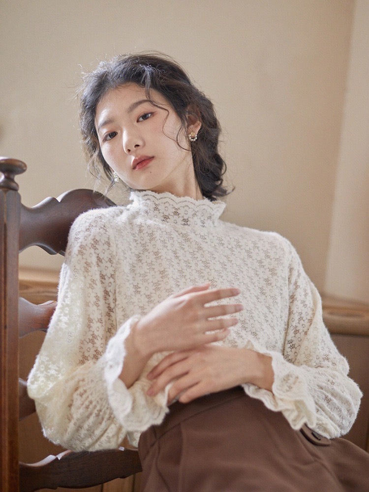 Transparente Spitzenbluse, perfekt zum Kombinieren mit Kleidern. Trägertops oder -westen verleihen dem Kleid einen besonders zarten Touch. Halber Rollkragen mit langen Blousonärmeln, Rüschenmanschetten und floralem Spitzenmieder. Das Material ist sehr dehnbar.