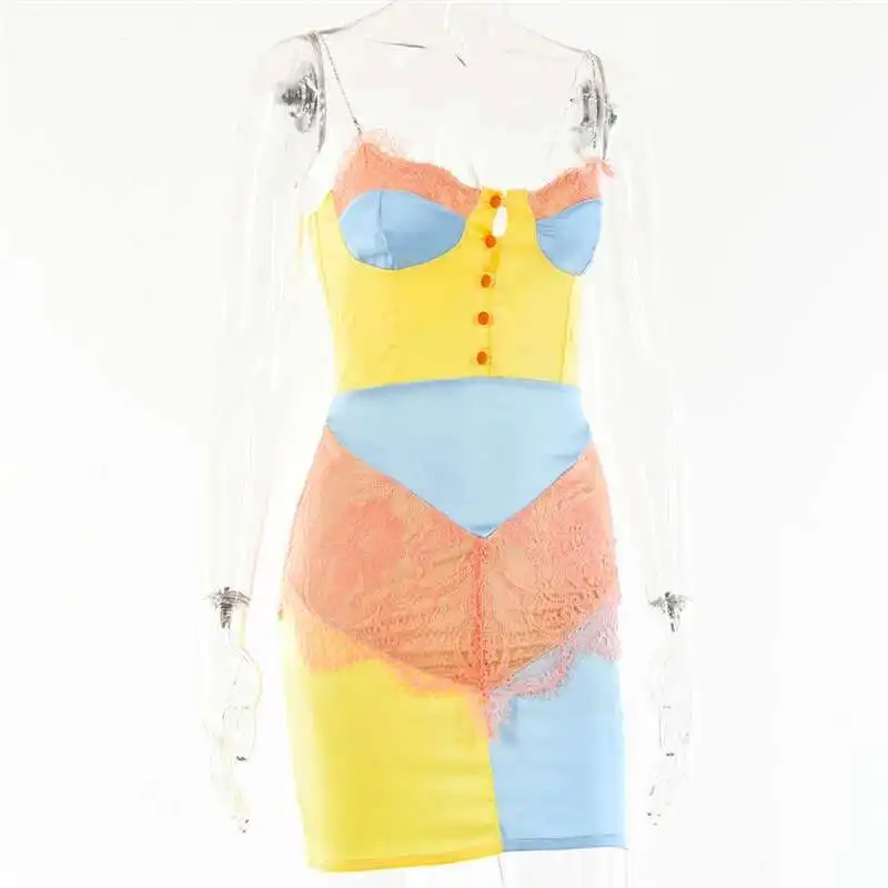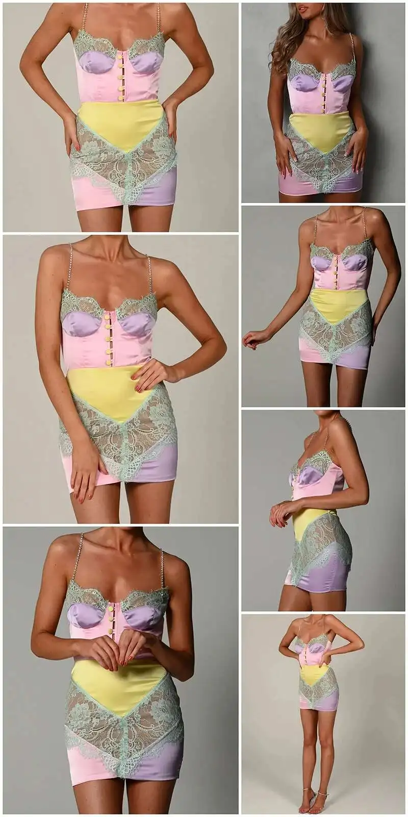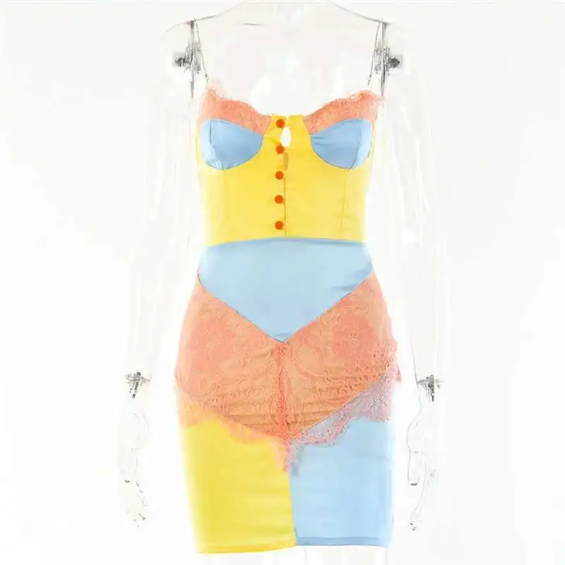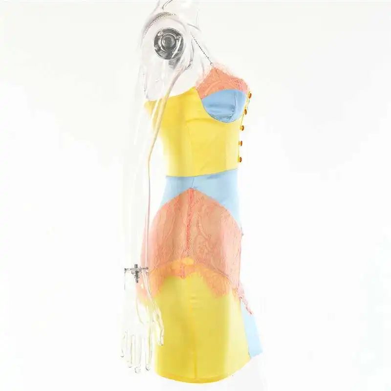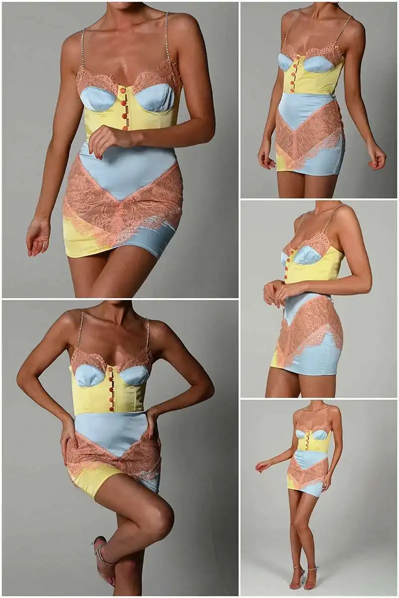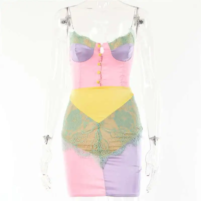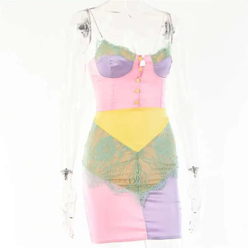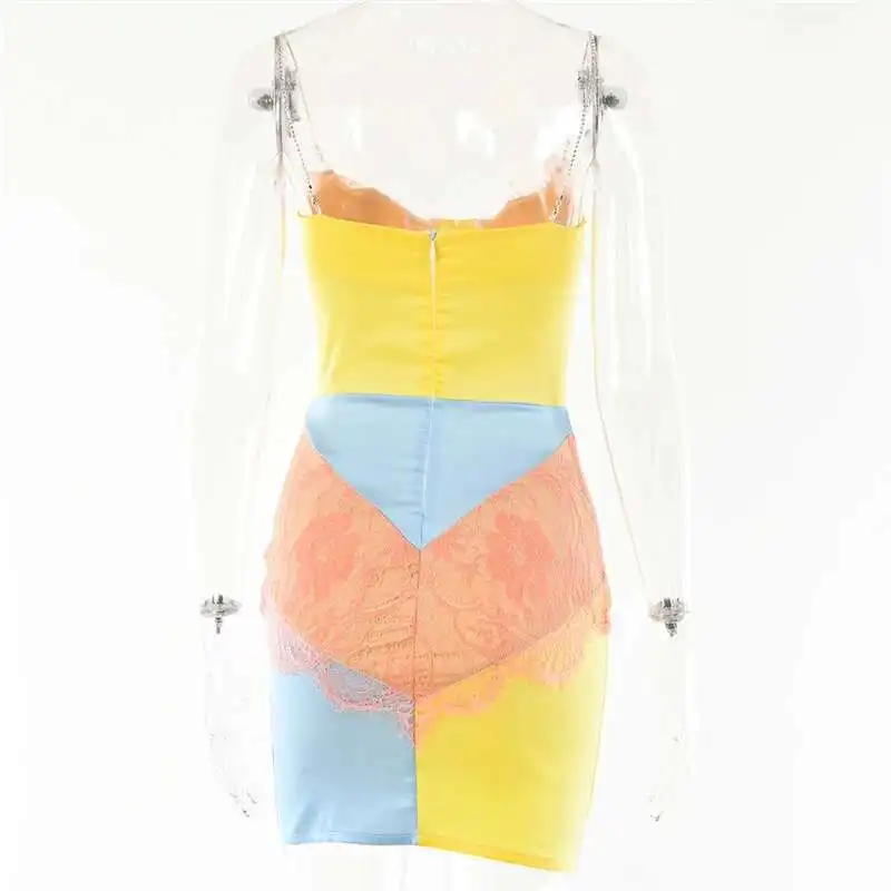 Diamond Chain Patchwork Print Mini Dress Women Fashion Y2K Summer Lace Sleeveless Backless Bodycon Dress Elegant
