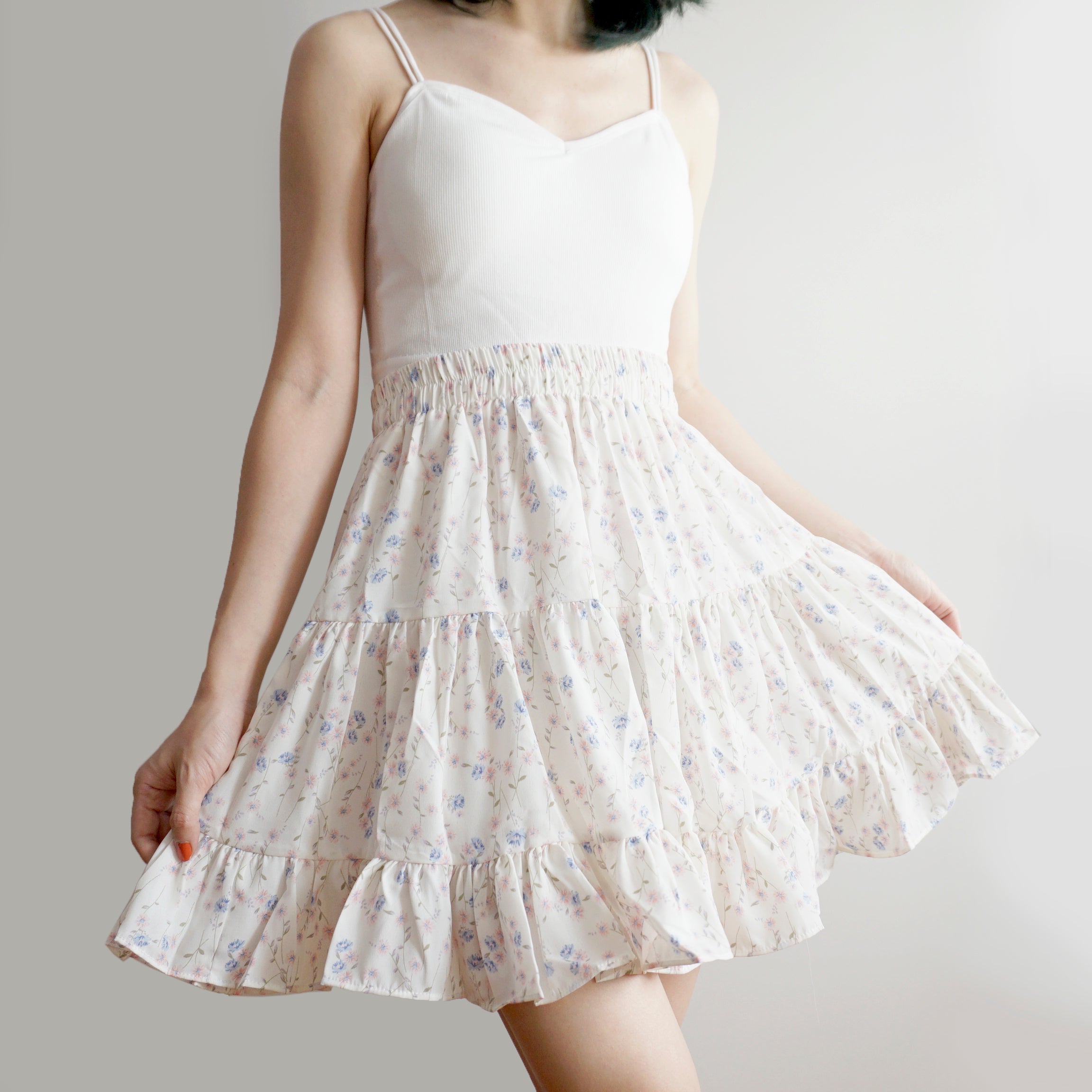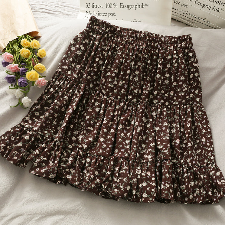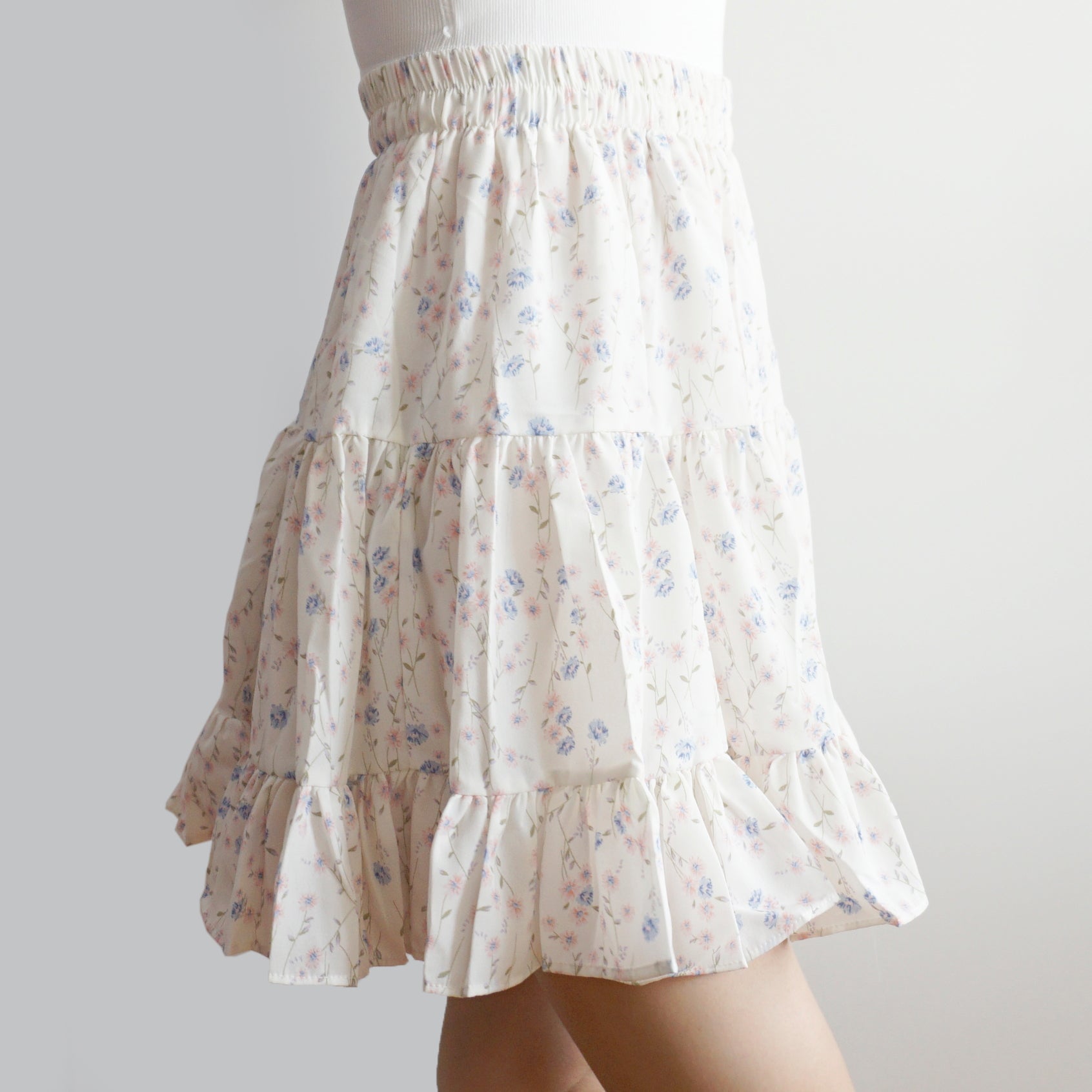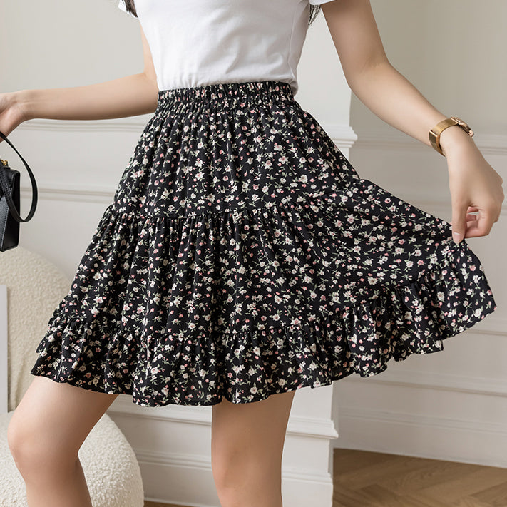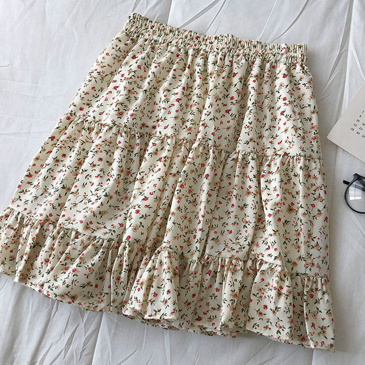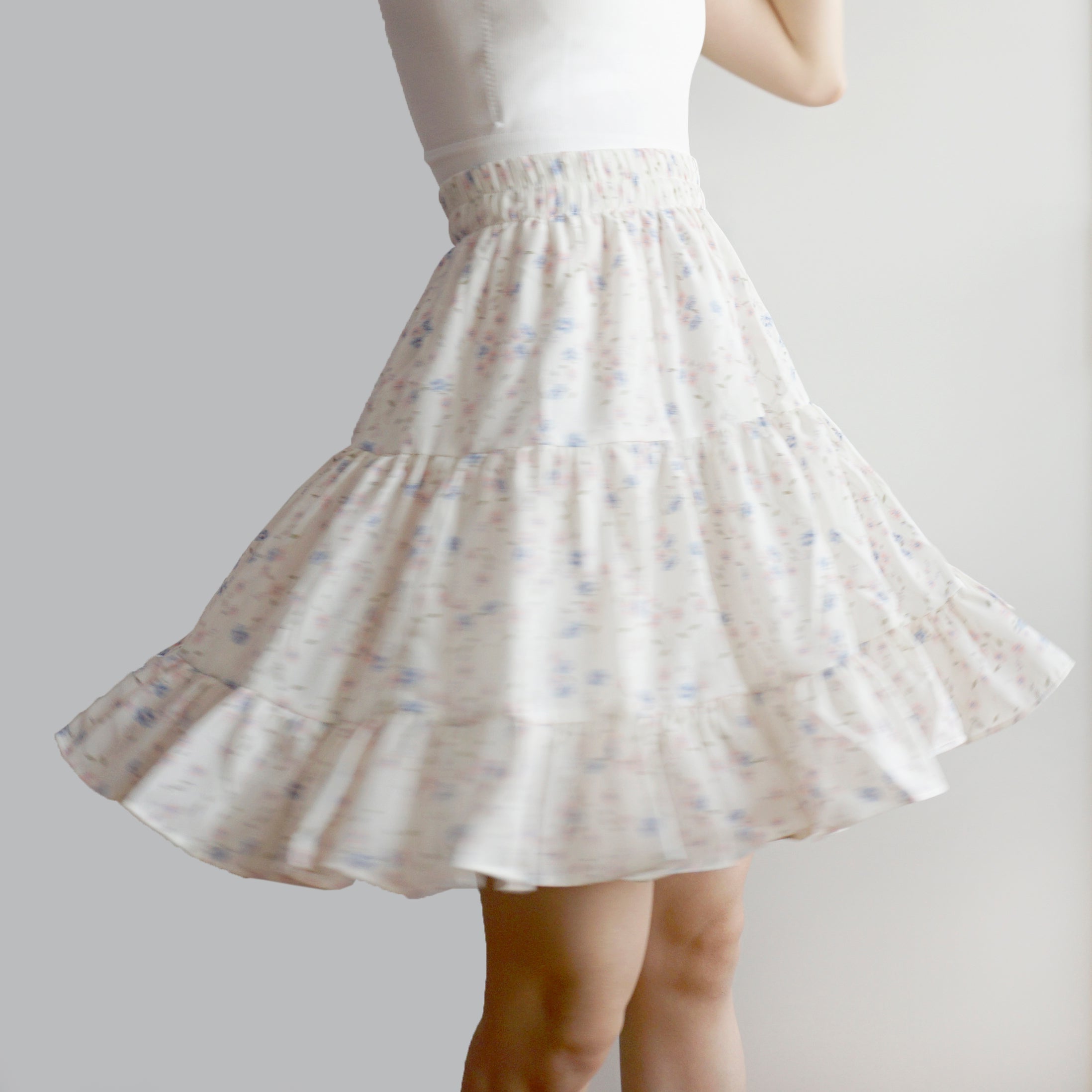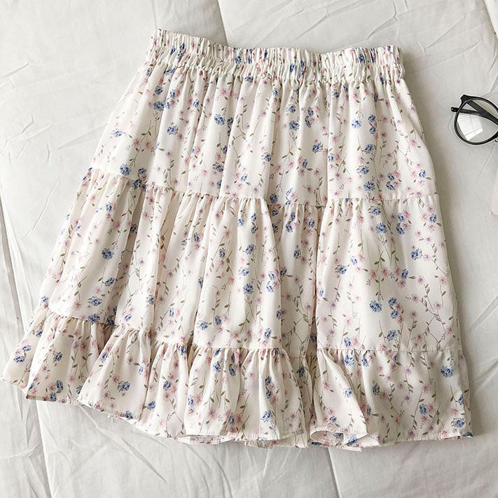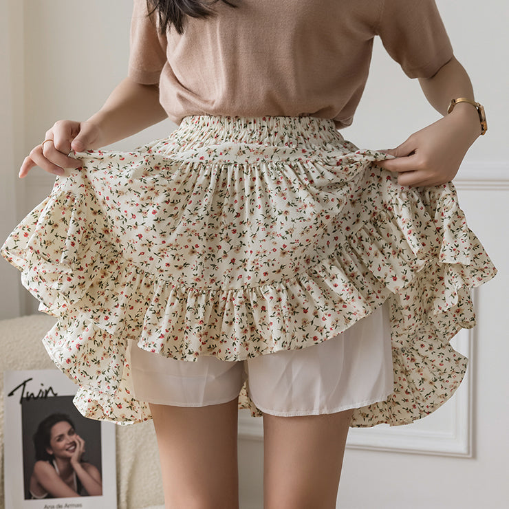 Fließender Chiffon-Minirock mit elastischem Bund und Stufen. Perfekt zum Kombinieren mit Hemden oder Pullovern. Lässt sich super wirbeln! Gefüttert mit Sicherheitsshorts.
