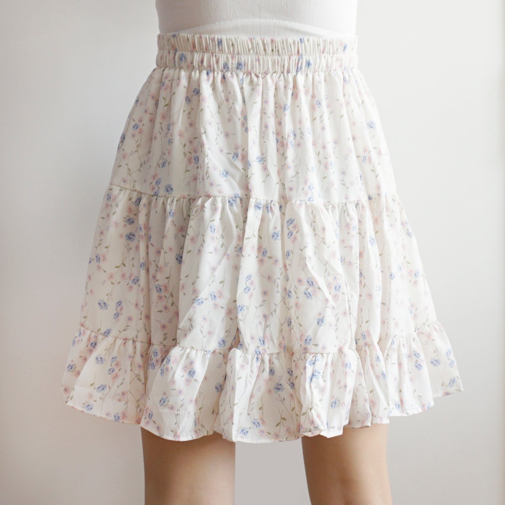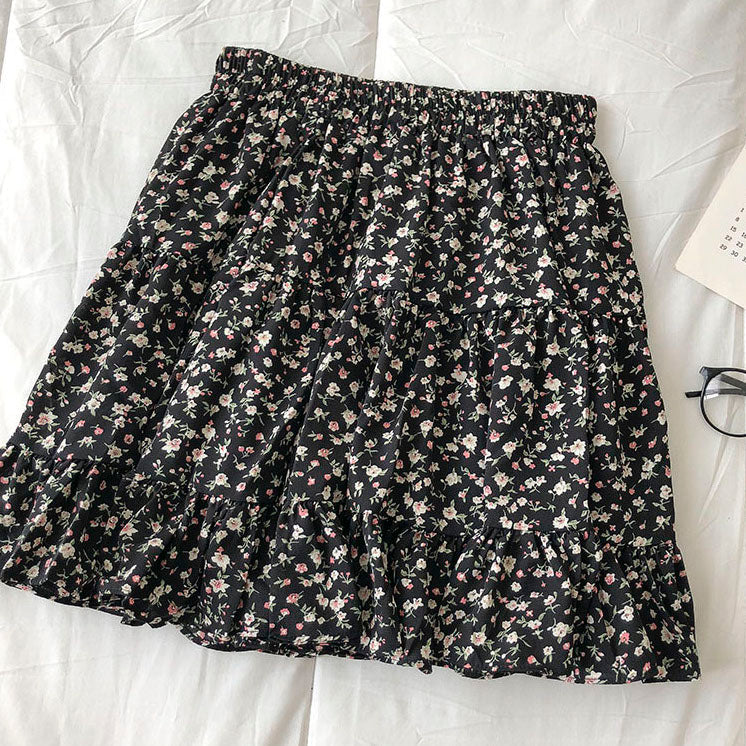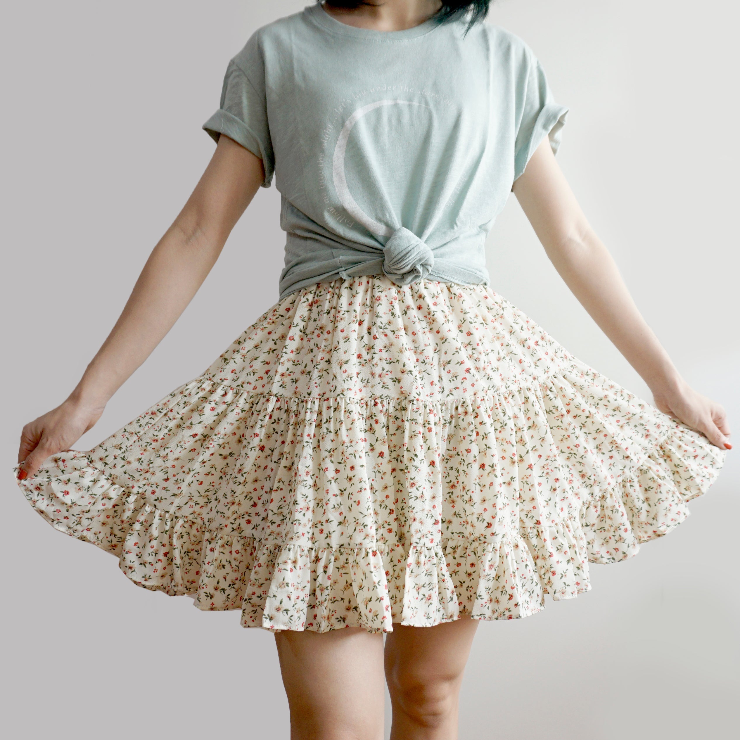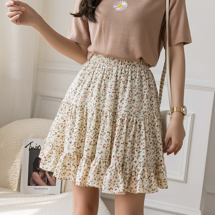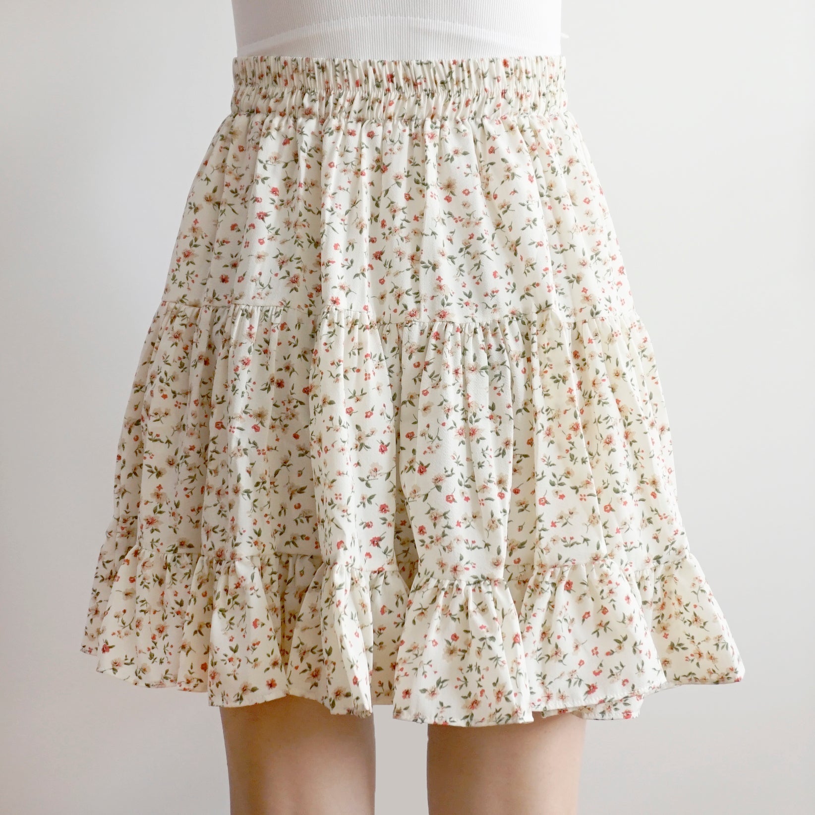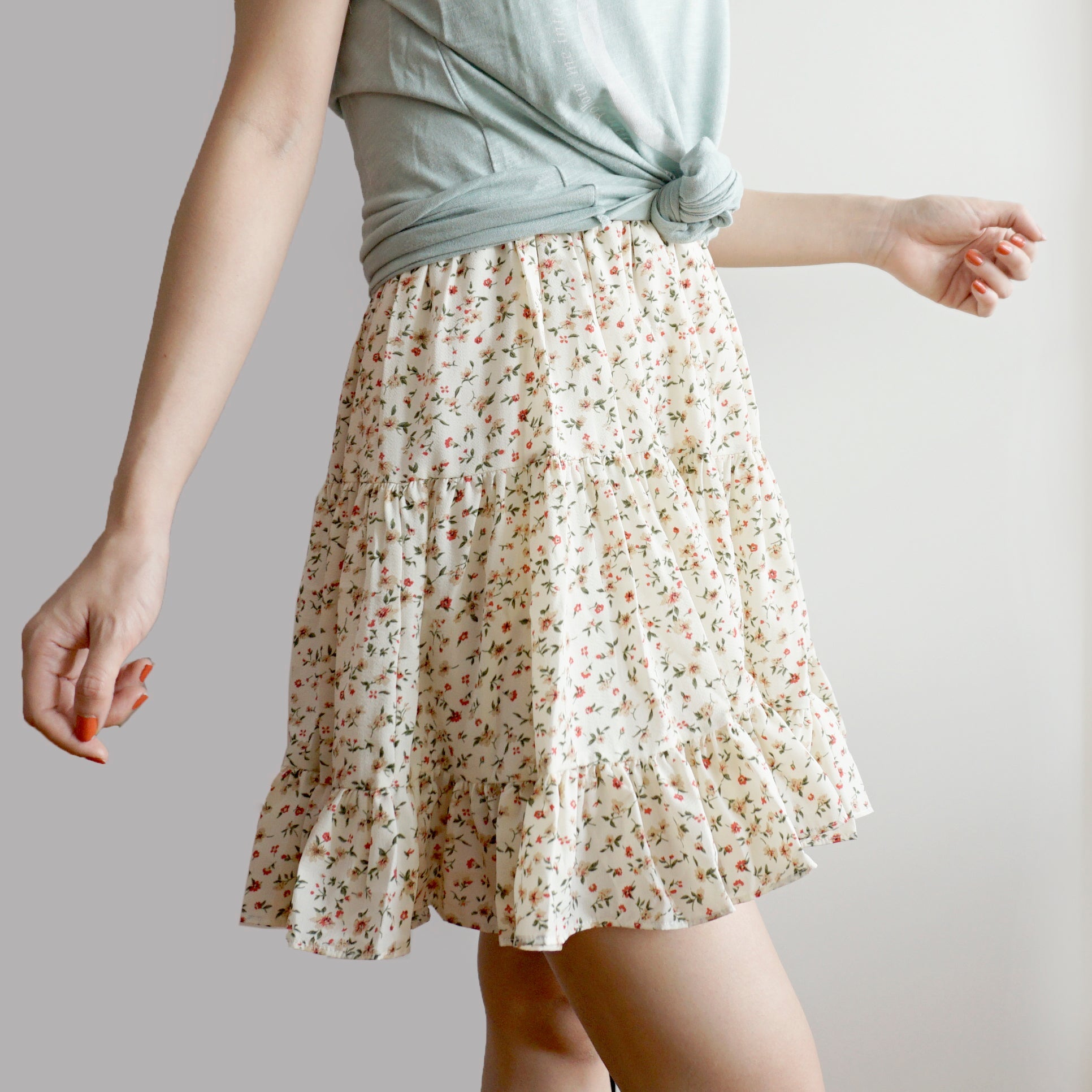 Fließender Chiffon-Minirock mit elastischem Bund und Stufen. Perfekt zum Kombinieren mit Hemden oder Pullovern. Lässt sich super wirbeln! Gefüttert mit Sicherheitsshorts.