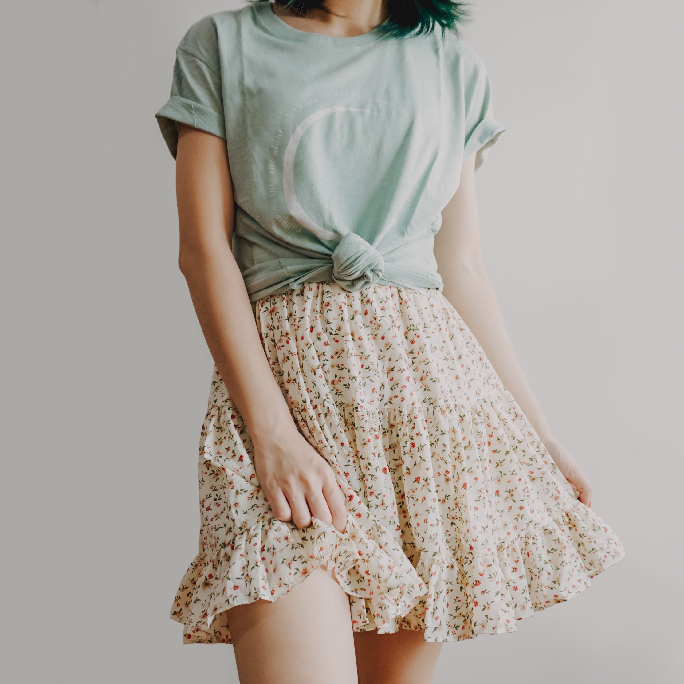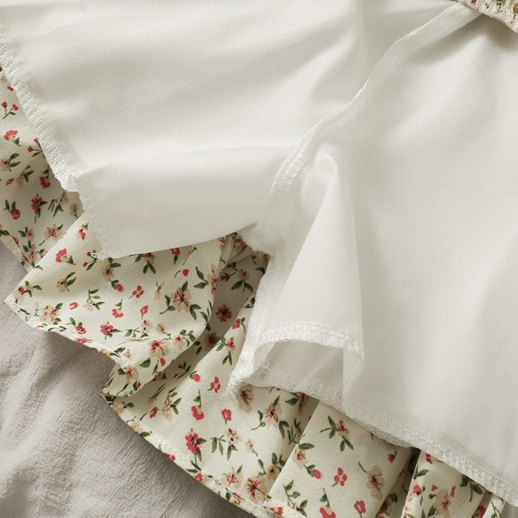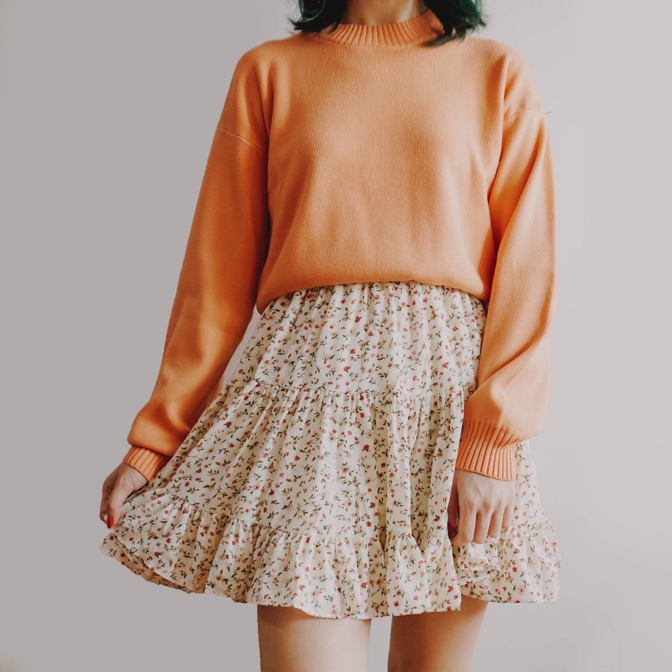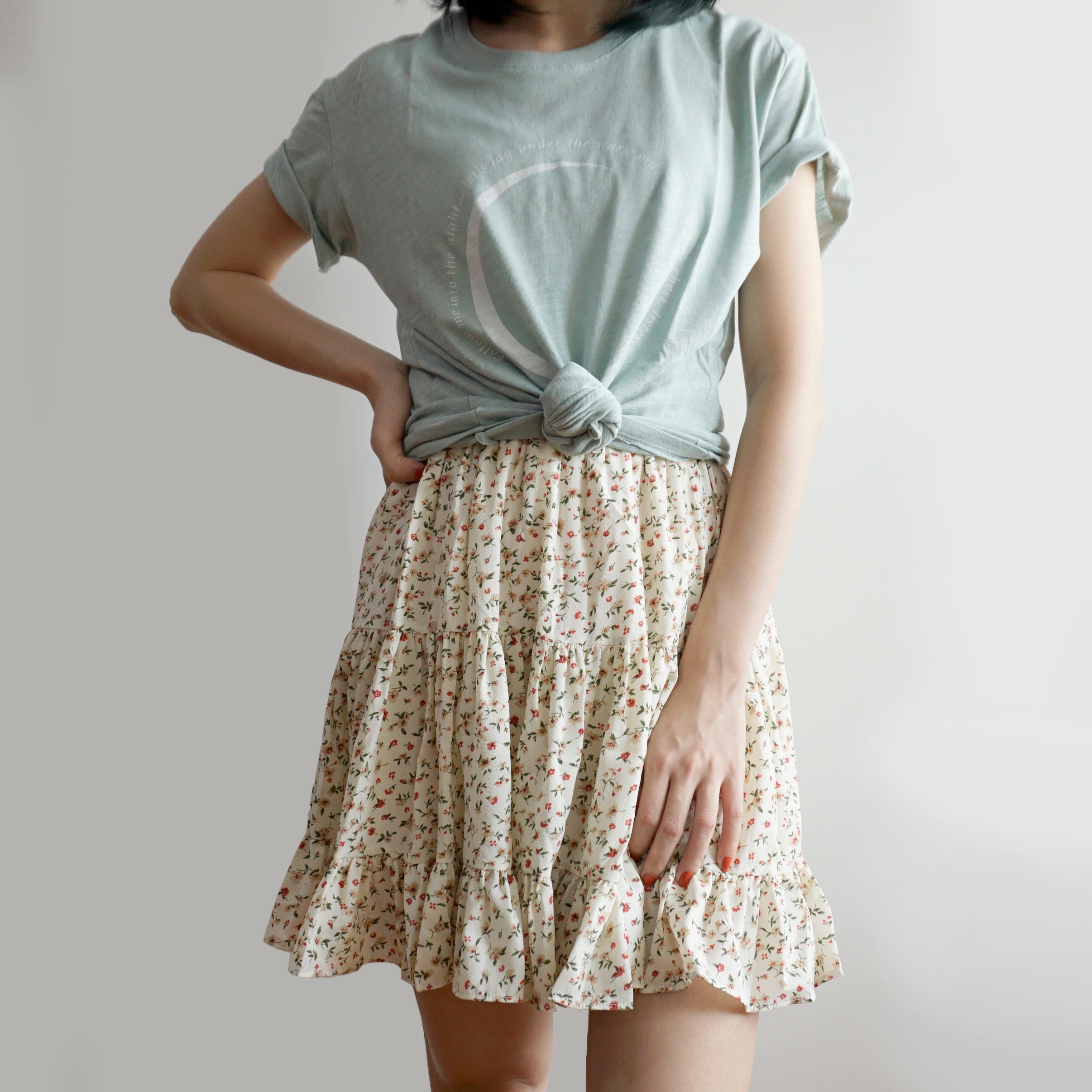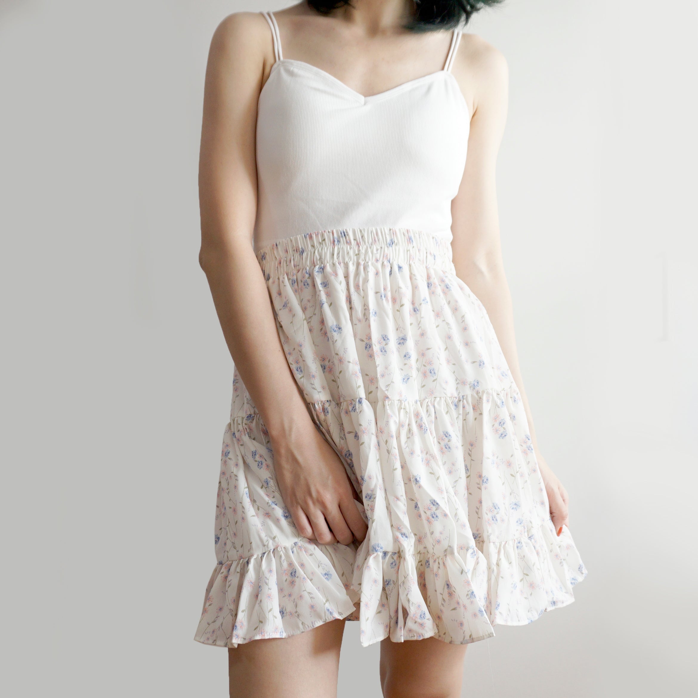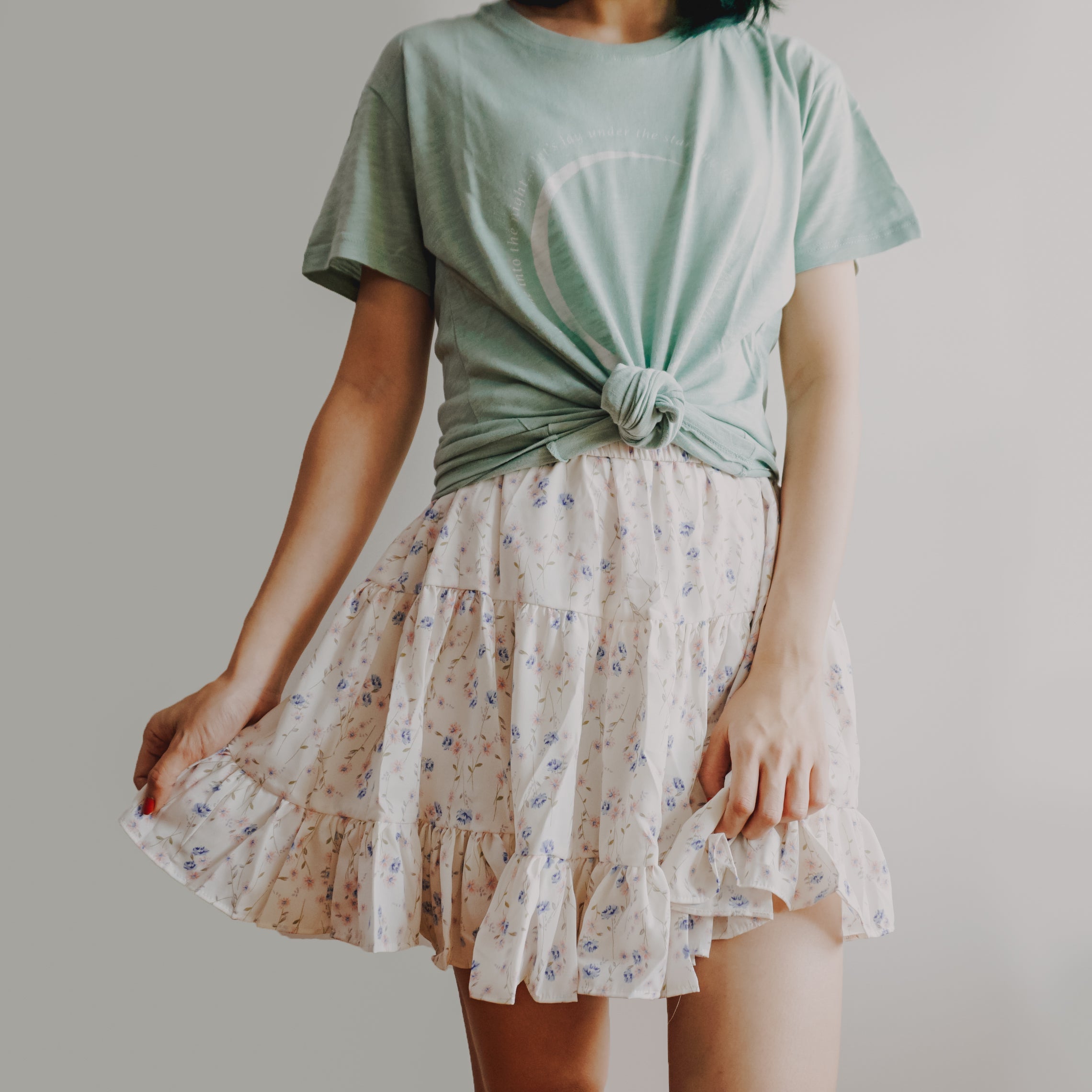Fließender Chiffon-Minirock mit elastischem Bund und Stufen. Perfekt zum Kombinieren mit Hemden oder Pullovern. Lässt sich super wirbeln! Gefüttert mit Sicherheitsshorts.