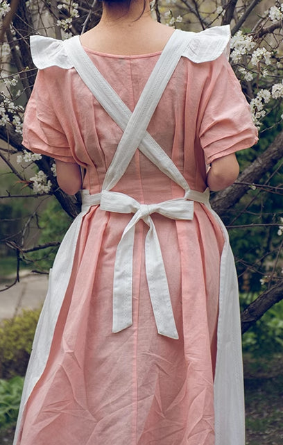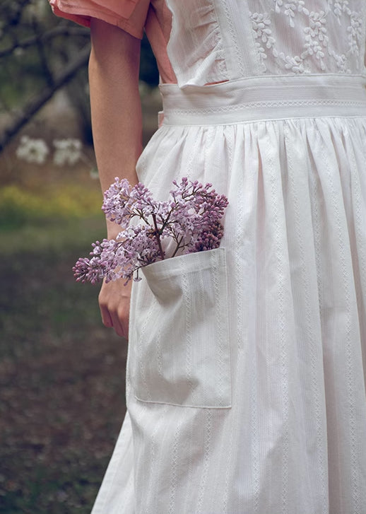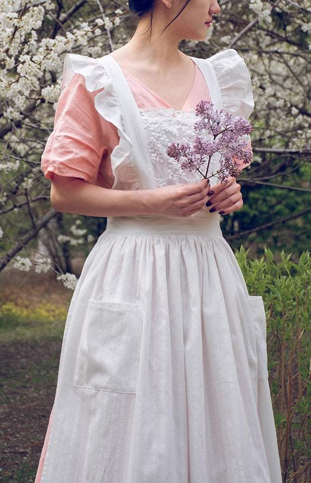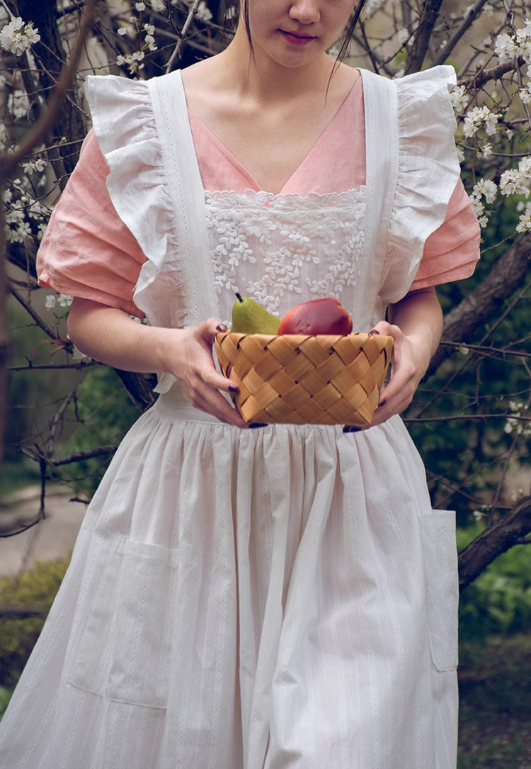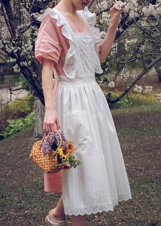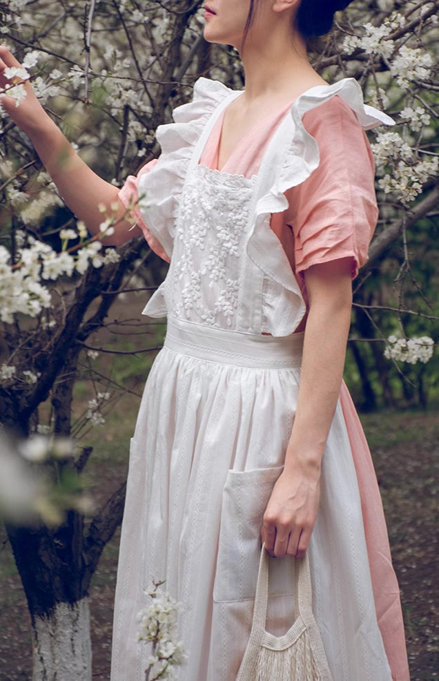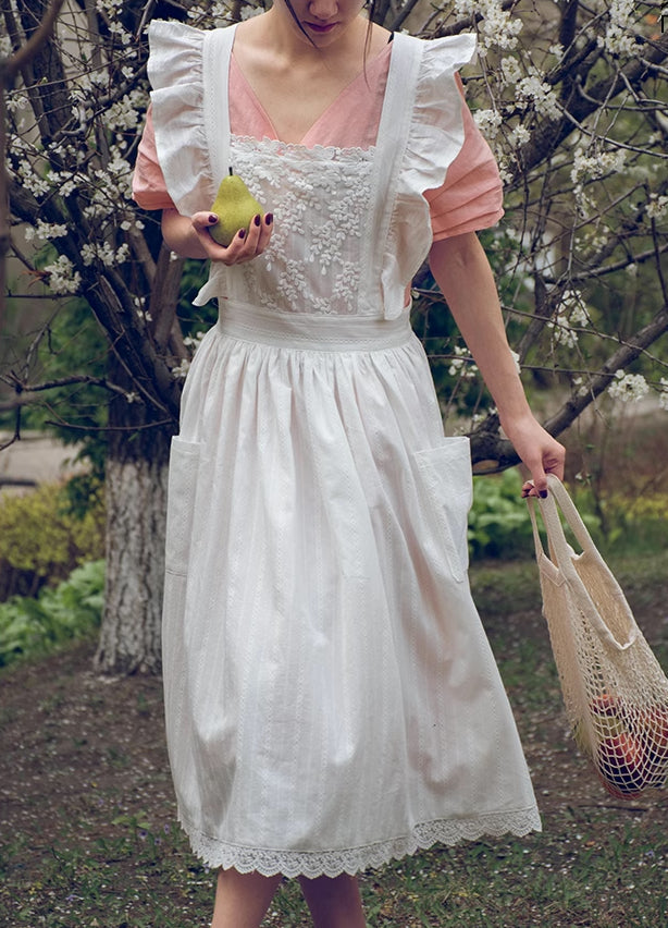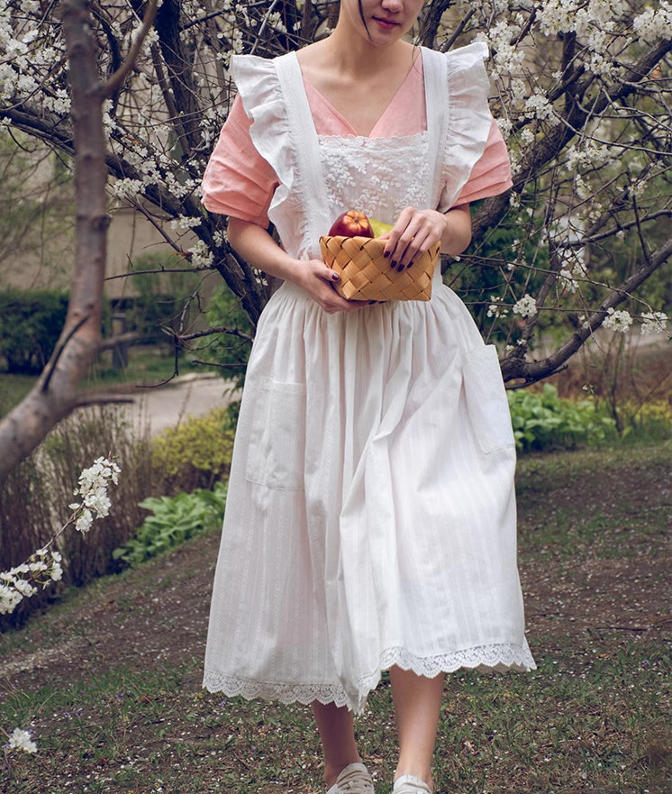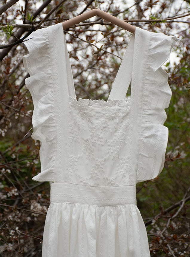 Verleihen Sie Ihrem Outfit mit einer Schürze einen Hauch von Cottagecore! Diese hier hat Rüschen an den Seiten, einen quadratischen Ausschnitt, Blätterranken und einen geblümten Latz. Der Midirock hat Seitentaschen und verstellbare Träger zum Binden.