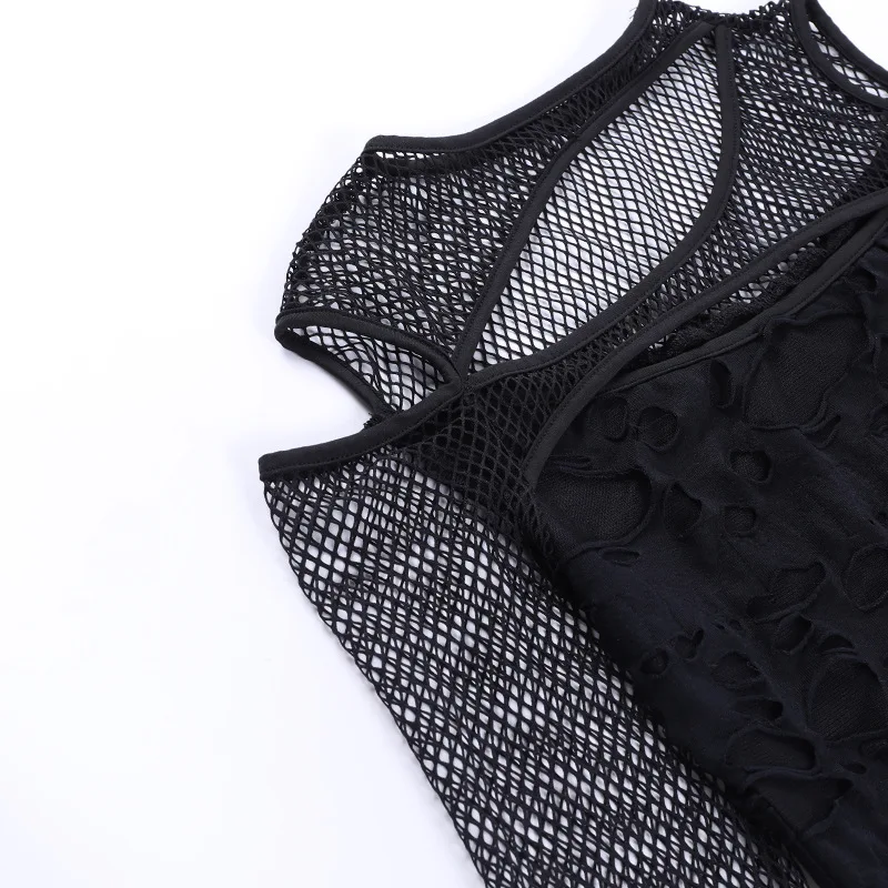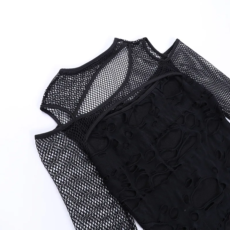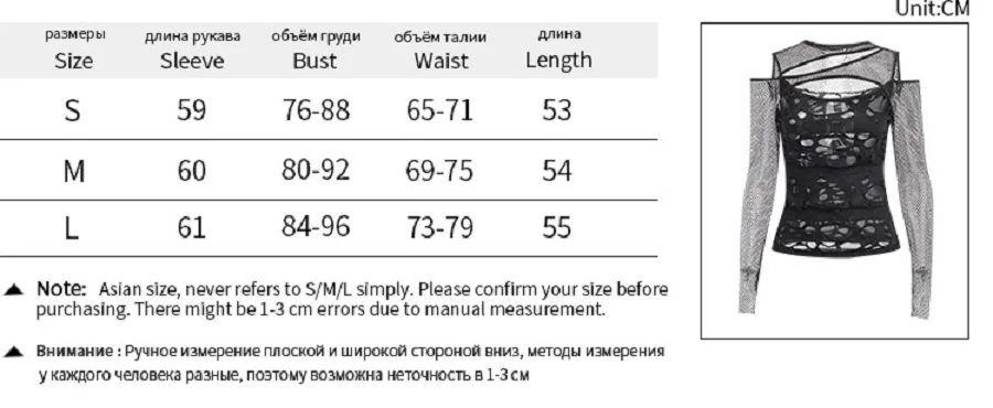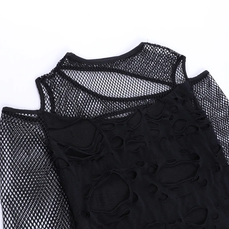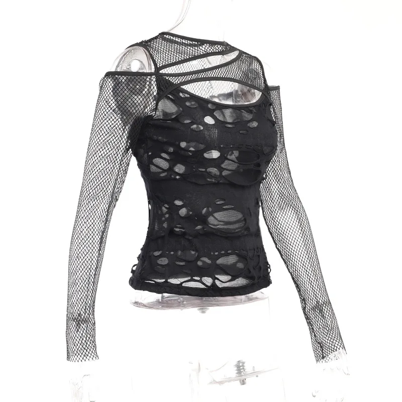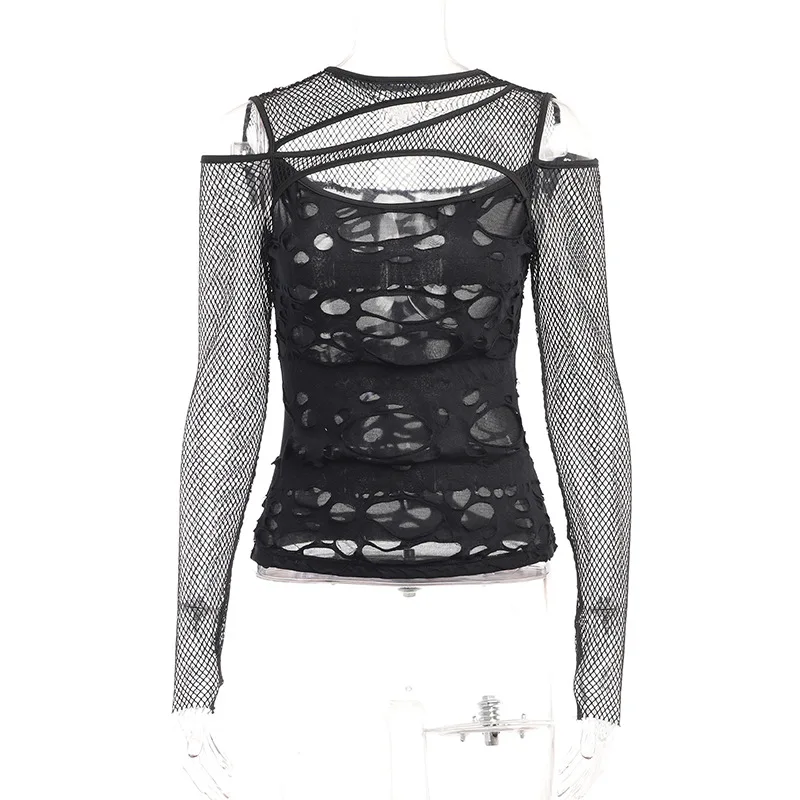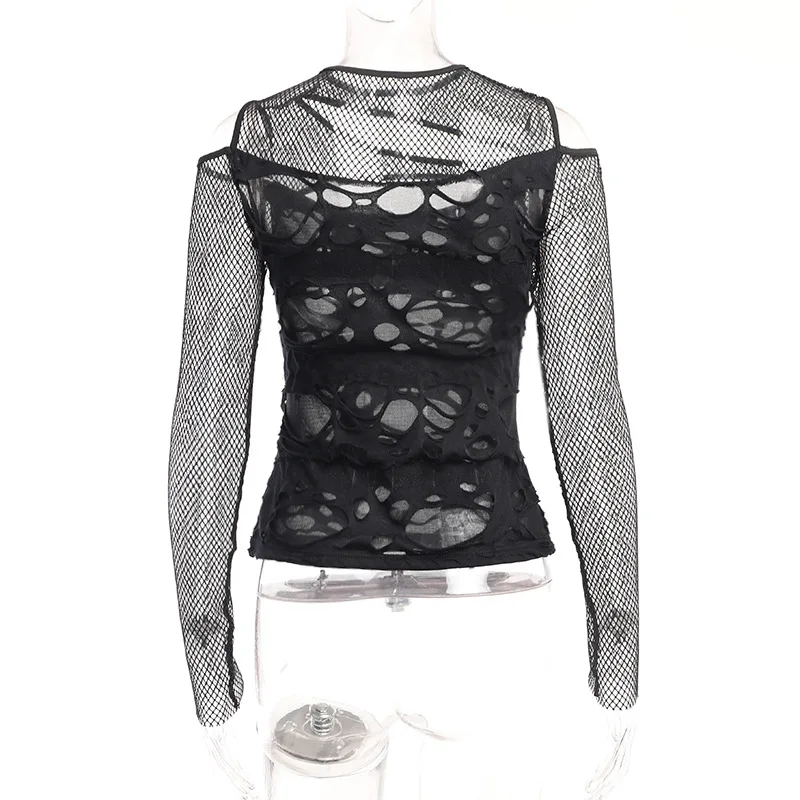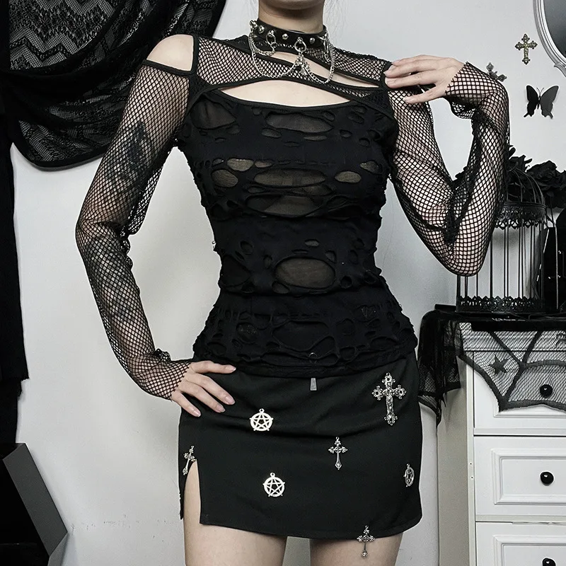 Women's Gothic Hot Chick Tops Y2k Autumn New Personalized Women's Dark Wind Slim Grid Hole Breaking Long Sleeve Tops Female Tide
