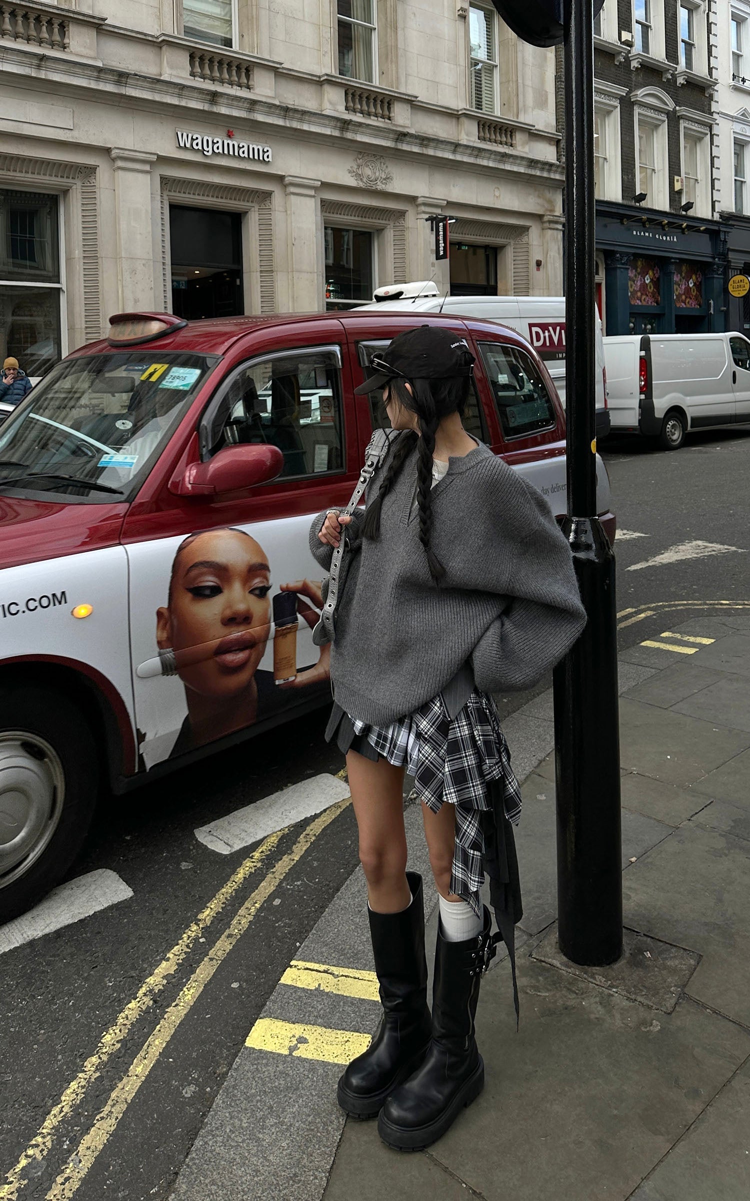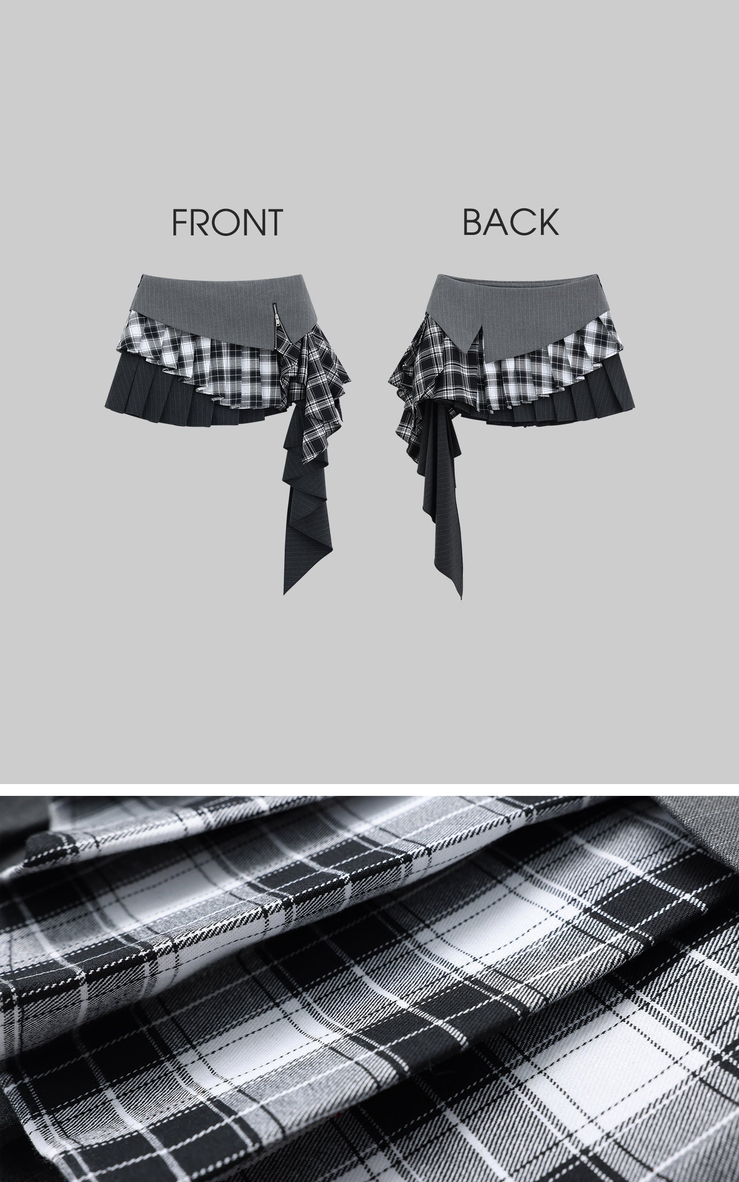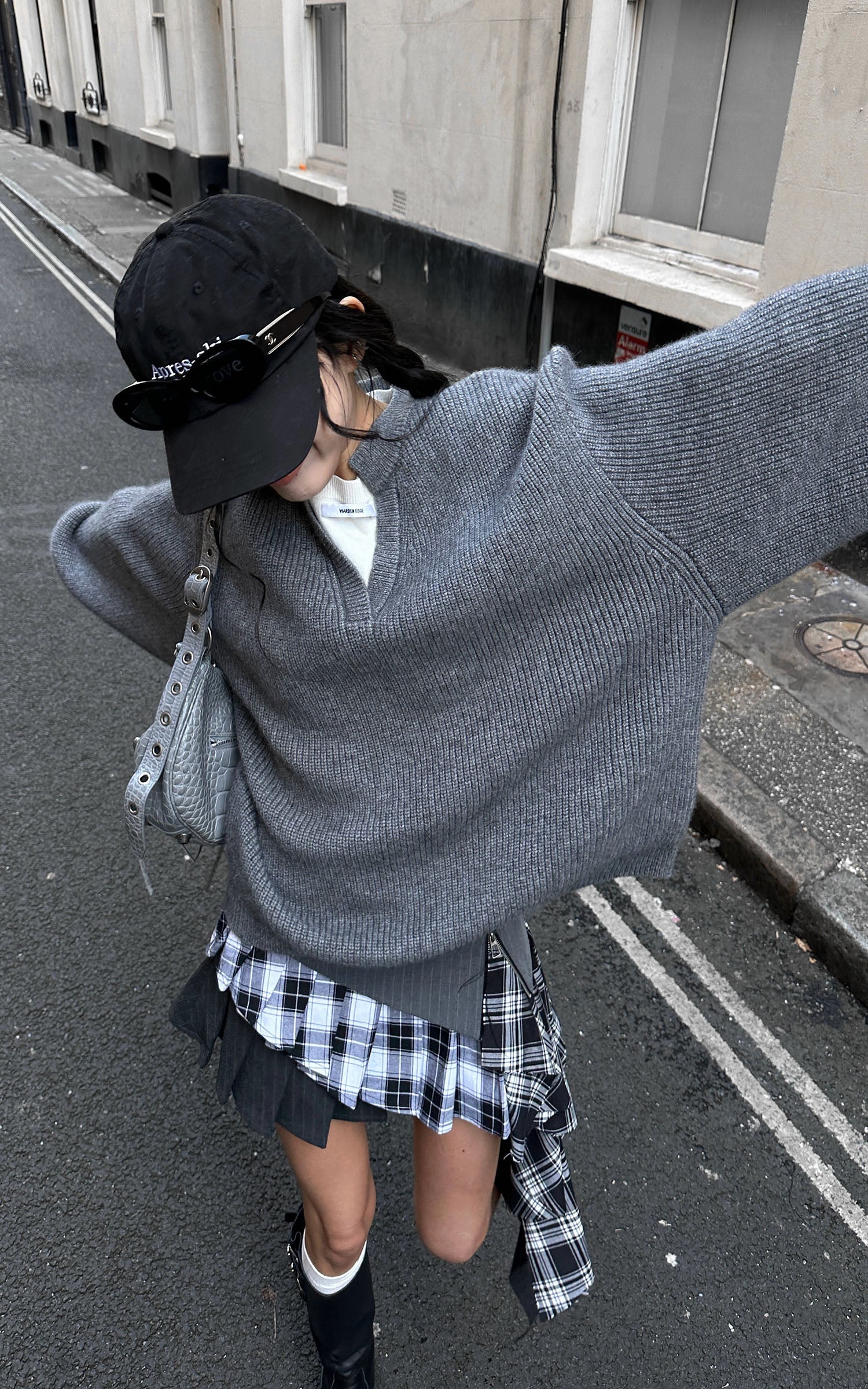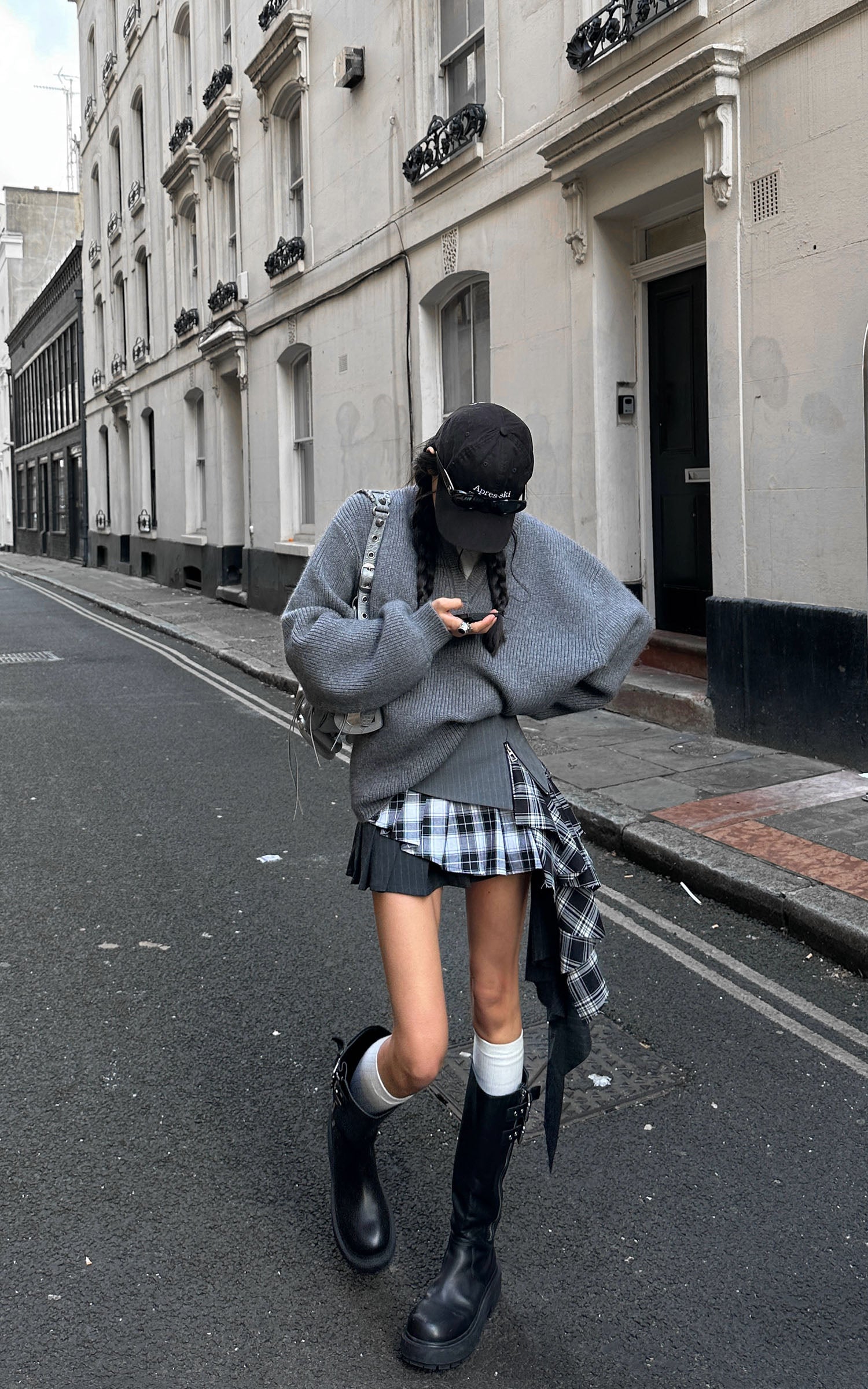 Effortlessly fuse comfort with edge in this contemporary ensemble. The oversized knit pullover exudes casual sophistication. featuring a deep V-neck and ribbed textures for an elevated tactile feel. Paired with an asymmetrical plaid skirt that reimagines classic tailoring. this set delivers striking contrast with layered ruffles and precise zipper details. Perfect for those seeking bold. layered streetwear aesthetics. this outfit ensures a dynamic yet polished look for urban adventures.