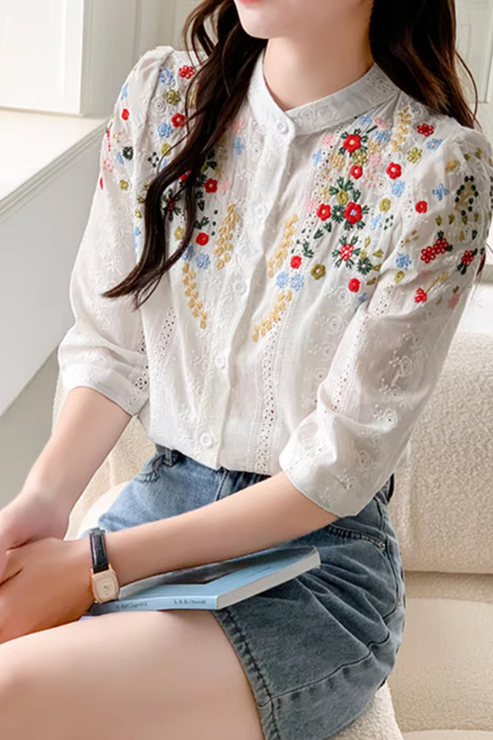 Buy Long Sleeve Stand Collar Flower Embroidered Blouse Shirt from Omcne for your outfit of the day. This item is in stock and ready to order. World Wide Shipping Service. Check our Shop for more trendy fashion.