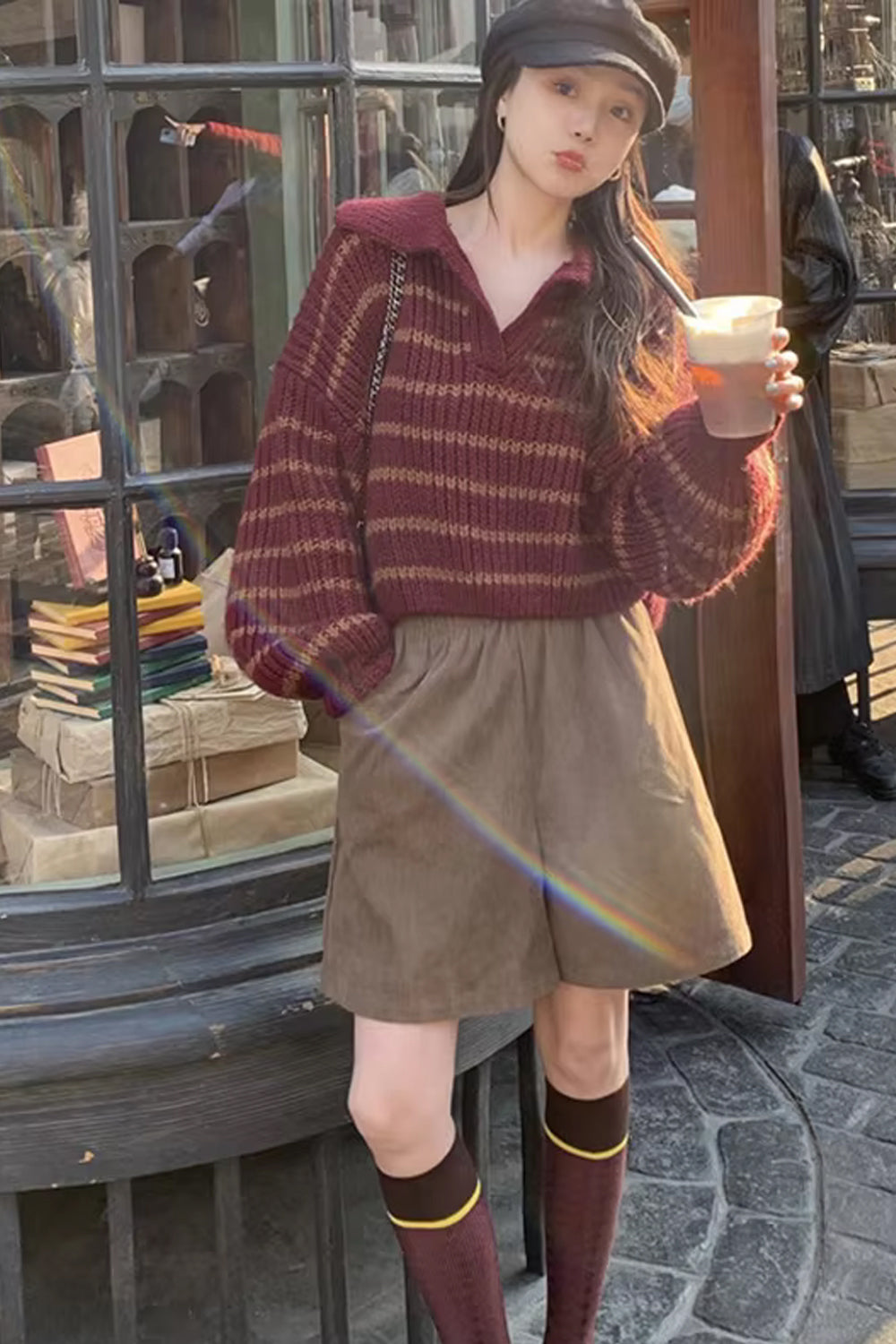 Buy Long Sleeve Turn Down Collar Striped Cropped Sweater from Omcne for your outfit of the day. This item is in stock and ready to order. World Wide Shipping Service. Check our Shop for more trendy fashion.