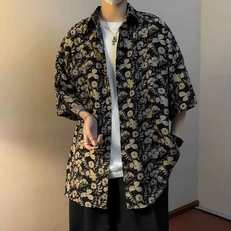 Summer new loose casual retro Hong Kong style design niche floral shirt men short sleeved ins handsome casual t shirts trend y2k