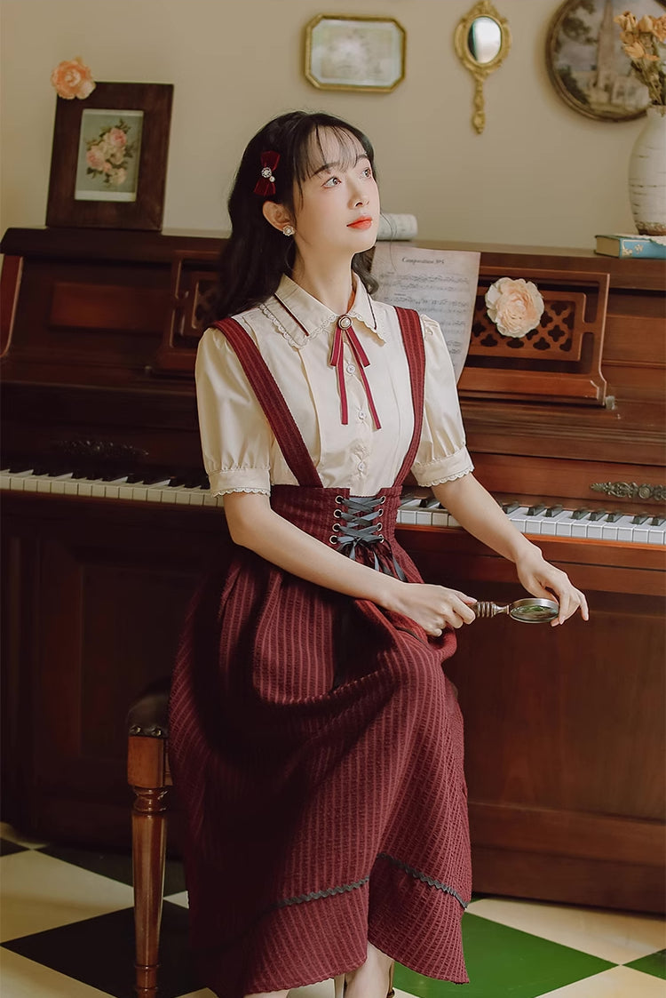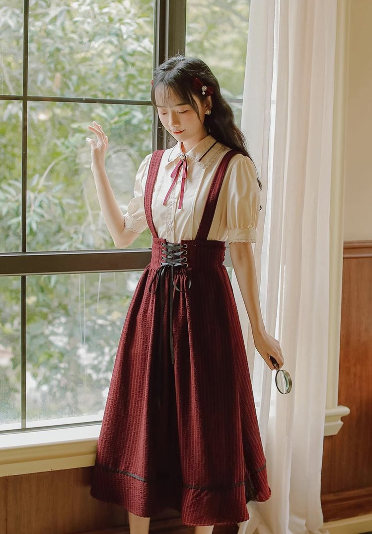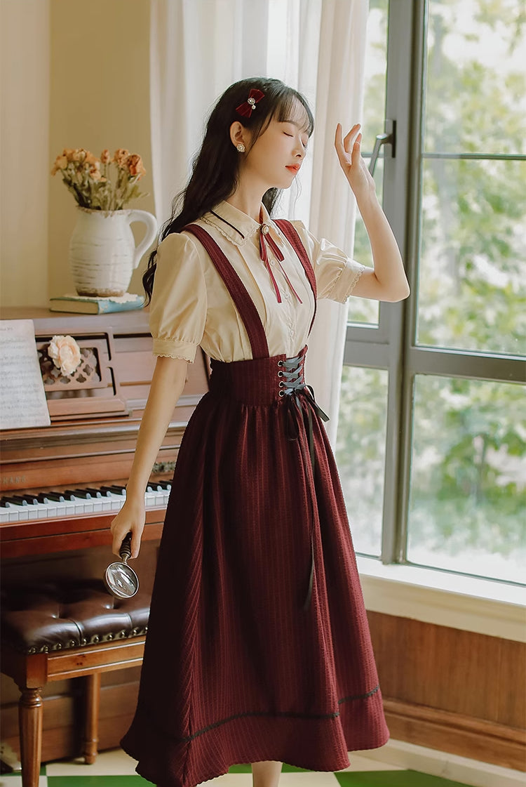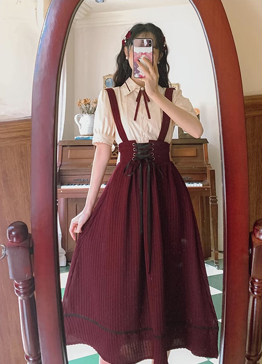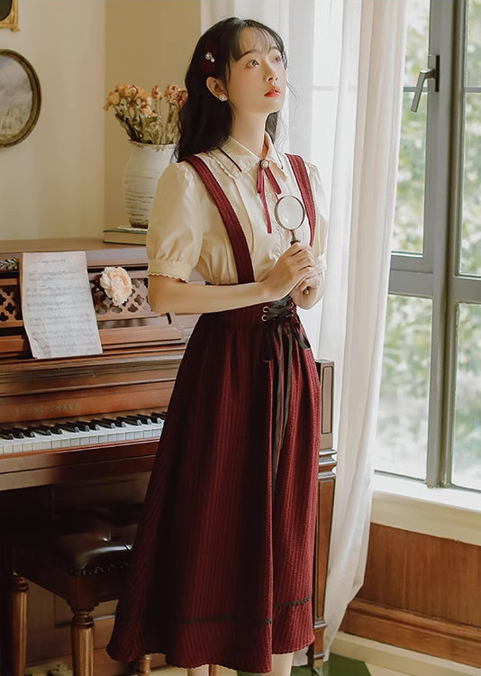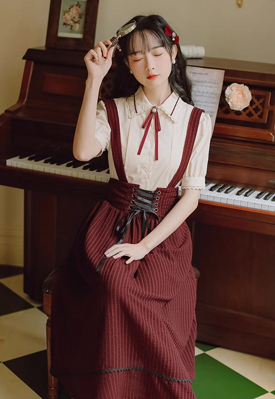 Gestreifter Midirock aus Crêpe-Chiffon mit elastischem Bund und Hosenträgern. Dazu passt eine Kurzarmbluse mit spitzem Kragen, Manschettenärmeln und einer abnehmbaren, passenden Krawatte.