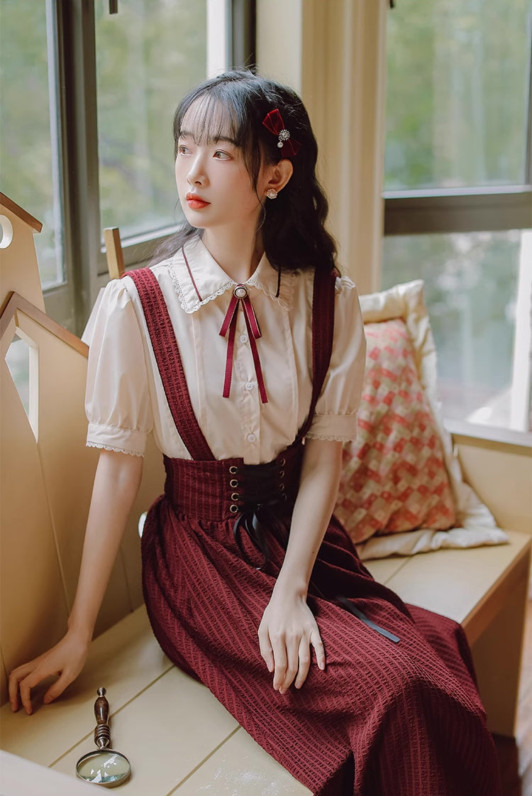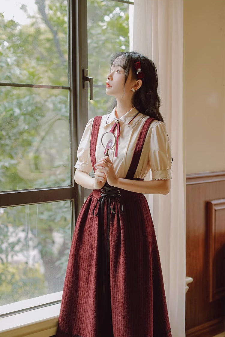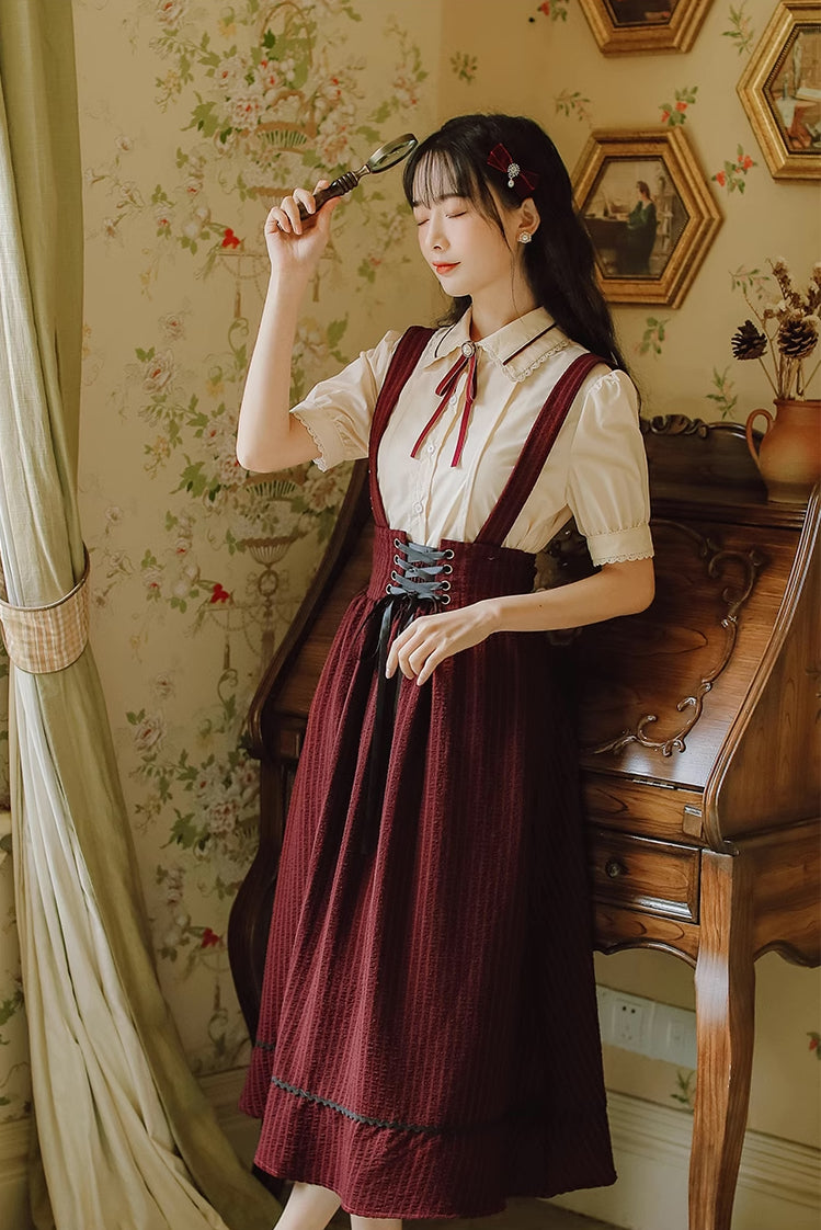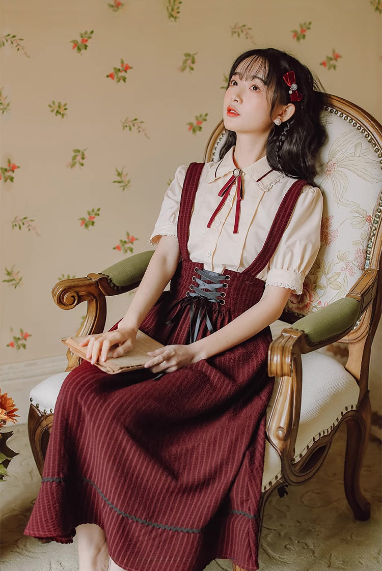 Gestreifter Midirock aus Crêpe-Chiffon mit elastischem Bund und Hosenträgern. Dazu passt eine Kurzarmbluse mit spitzem Kragen, Manschettenärmeln und einer abnehmbaren, passenden Krawatte.
