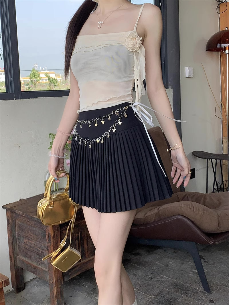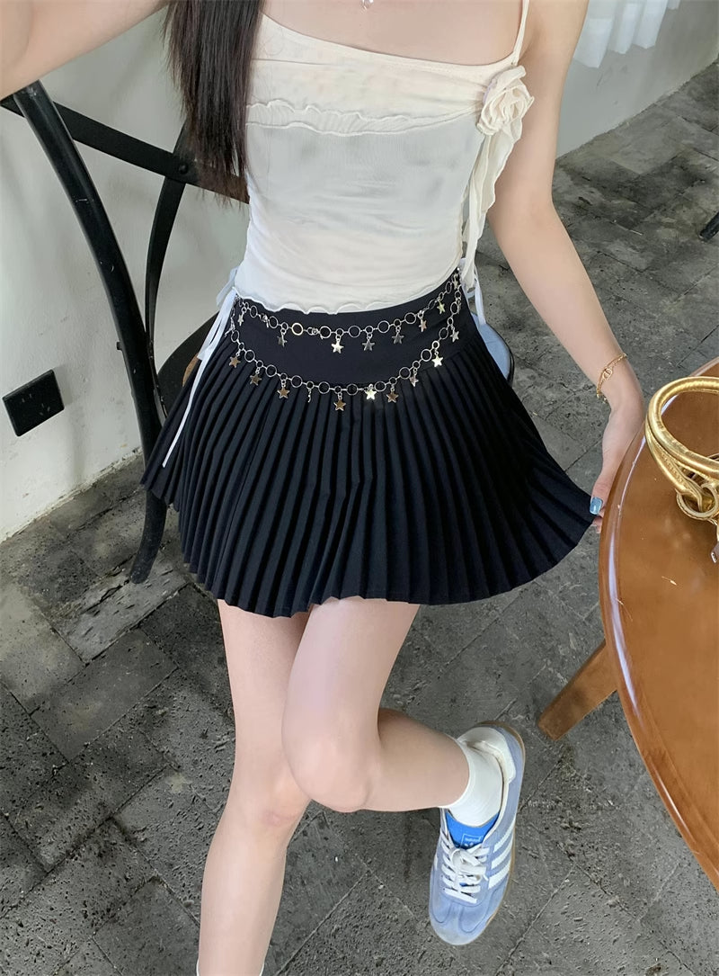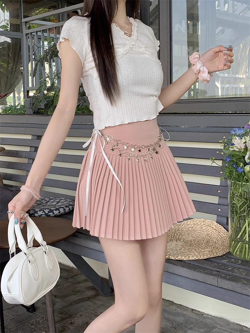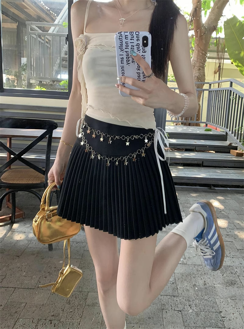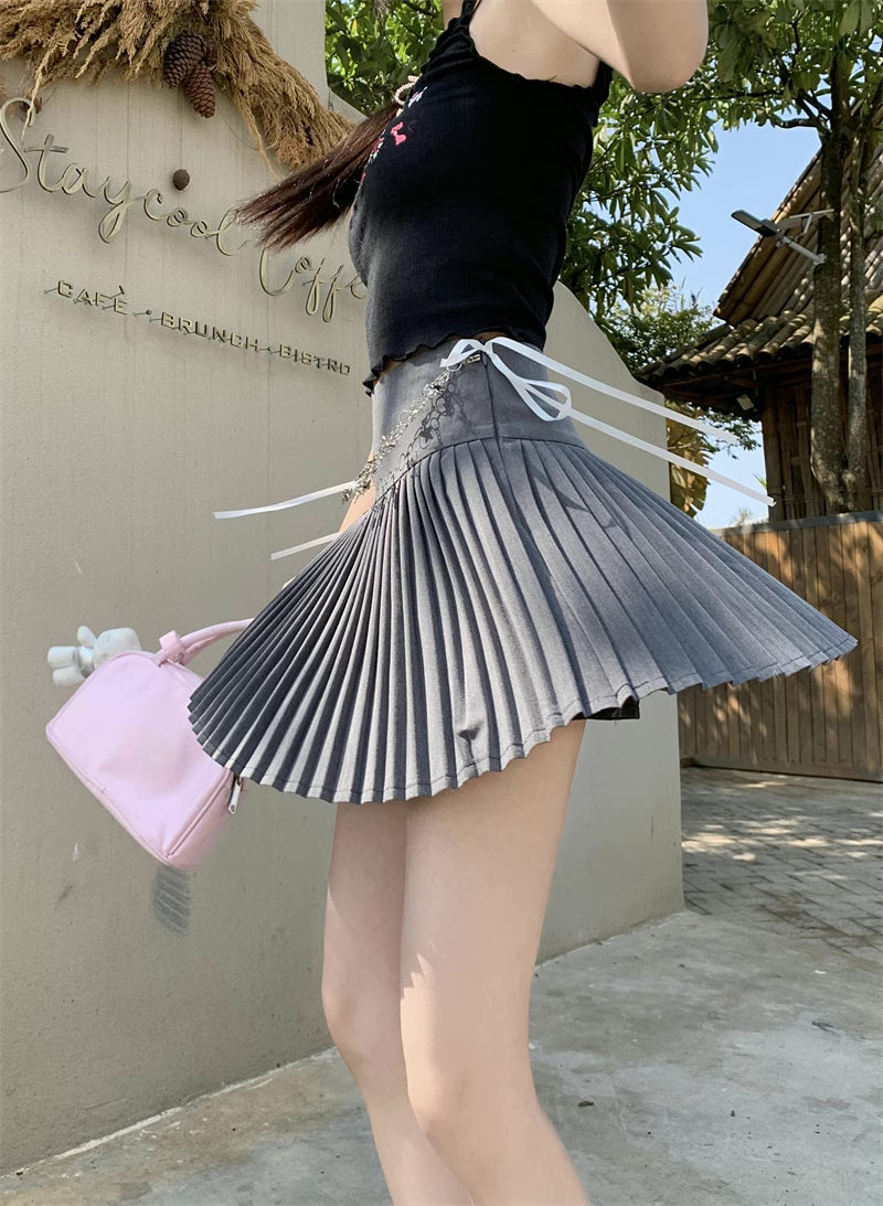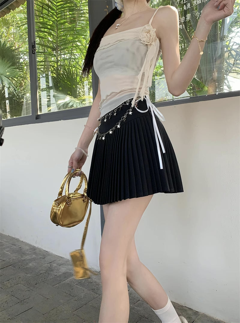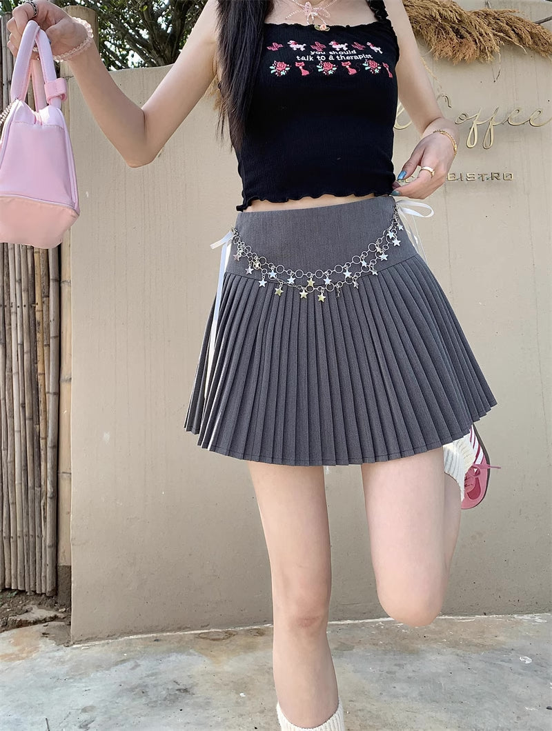 Minirock mit festen Falten, seitlichen Bindebändern und einer sternförmigen Kette, die darüber baumelt. Gefüttert mit Sicherheitsshorts und mit einem verdeckten seitlichen Reißverschluss.