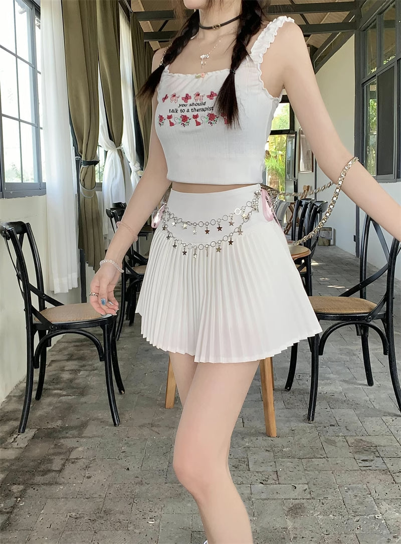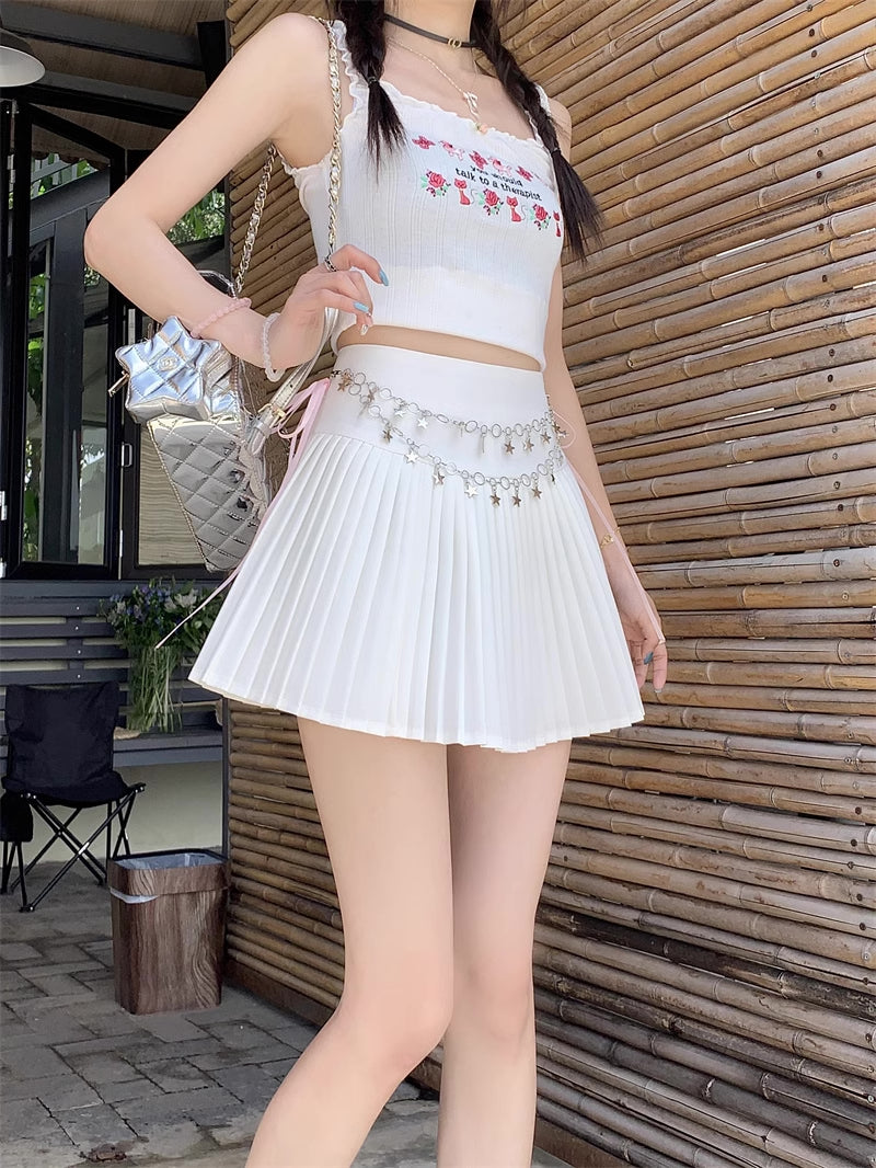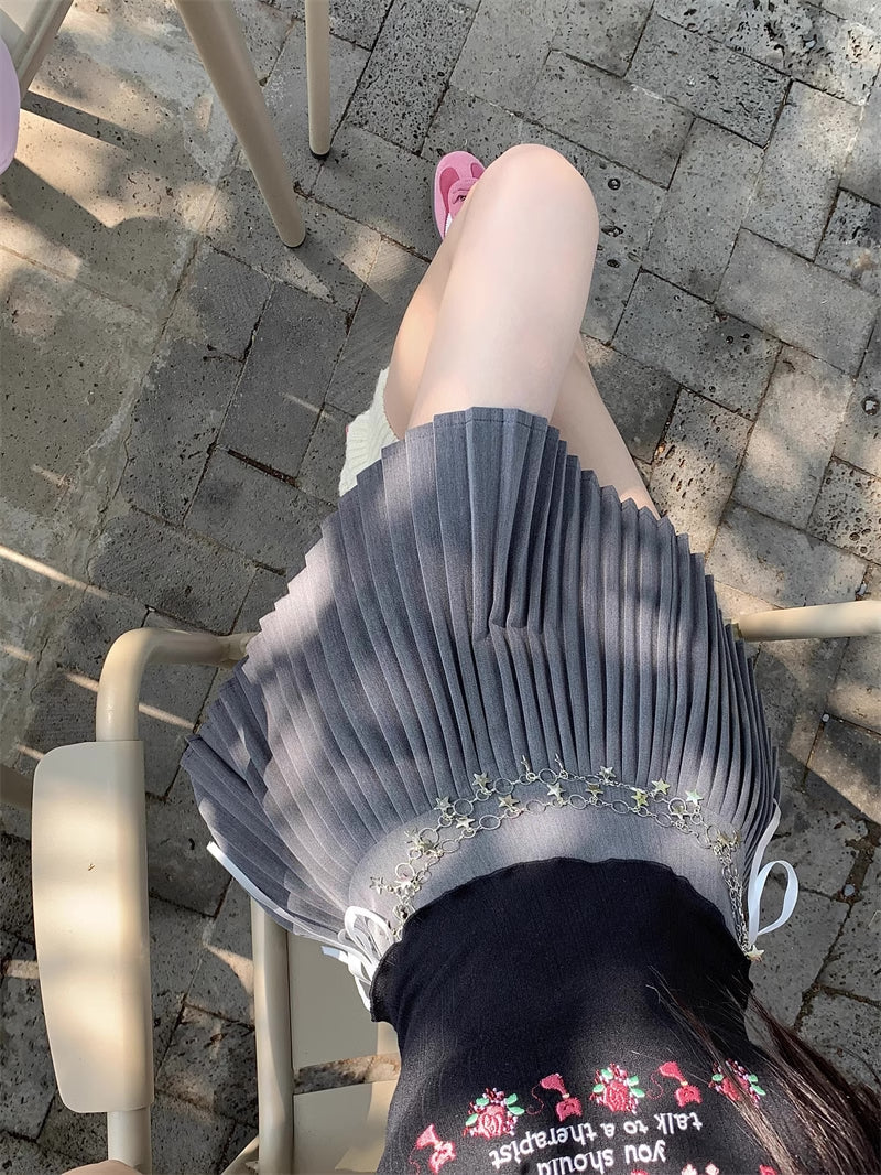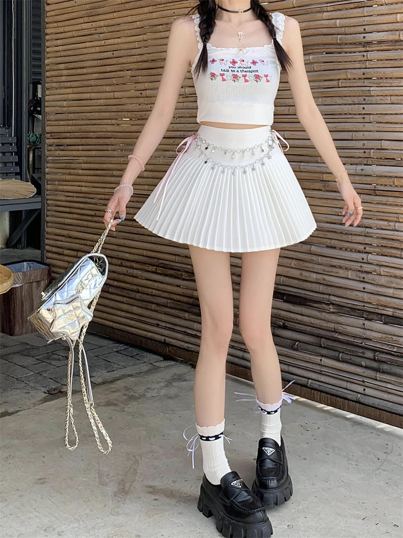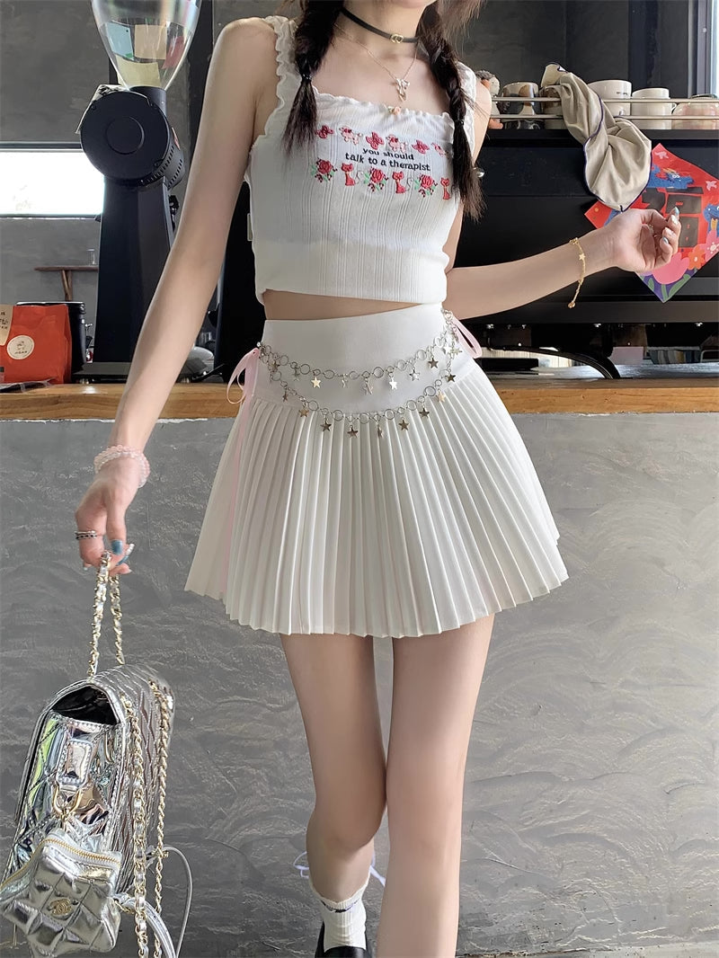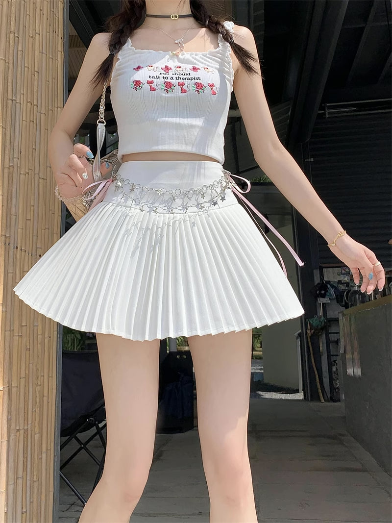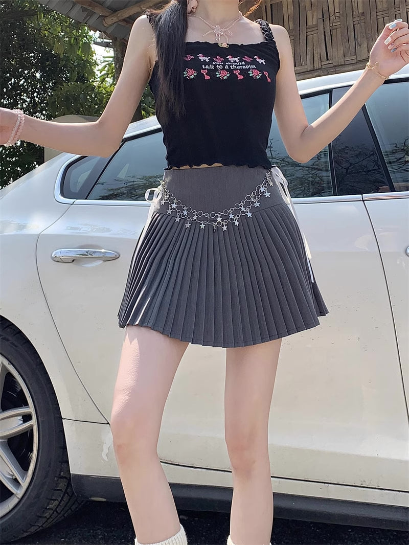 Minirock mit festen Falten, seitlichen Bindebändern und einer sternförmigen Kette, die darüber baumelt. Gefüttert mit Sicherheitsshorts und mit einem verdeckten seitlichen Reißverschluss.