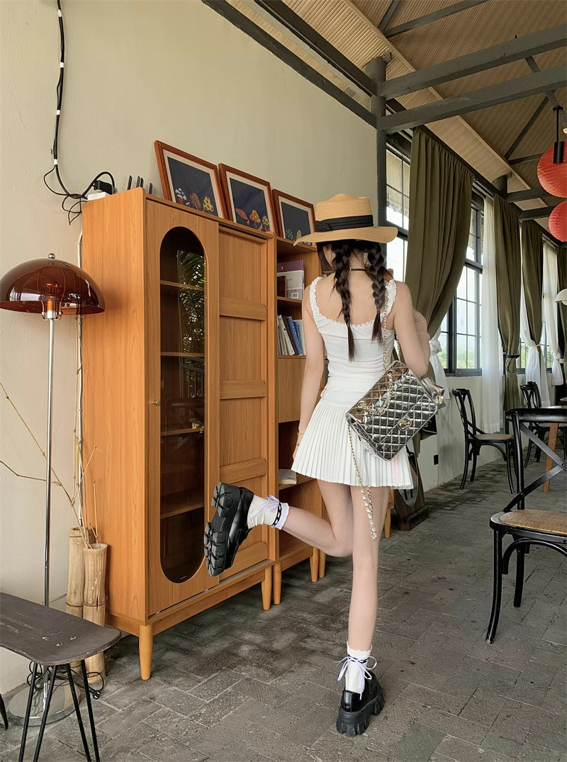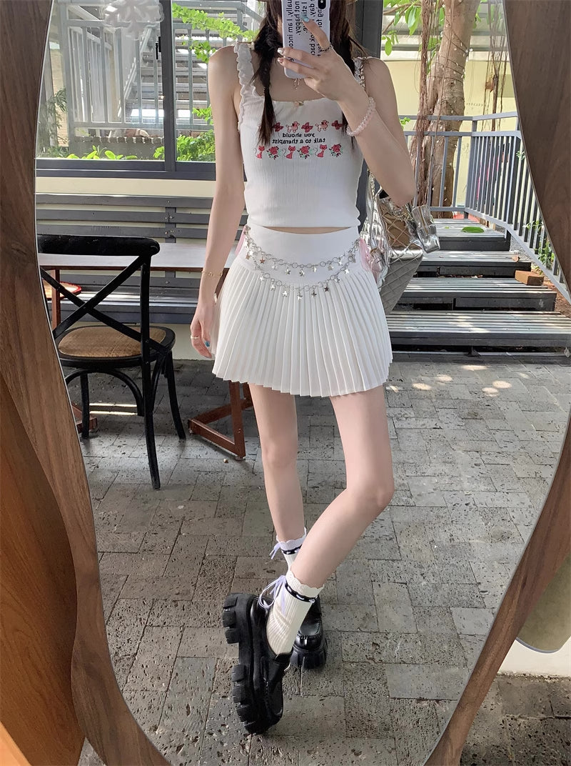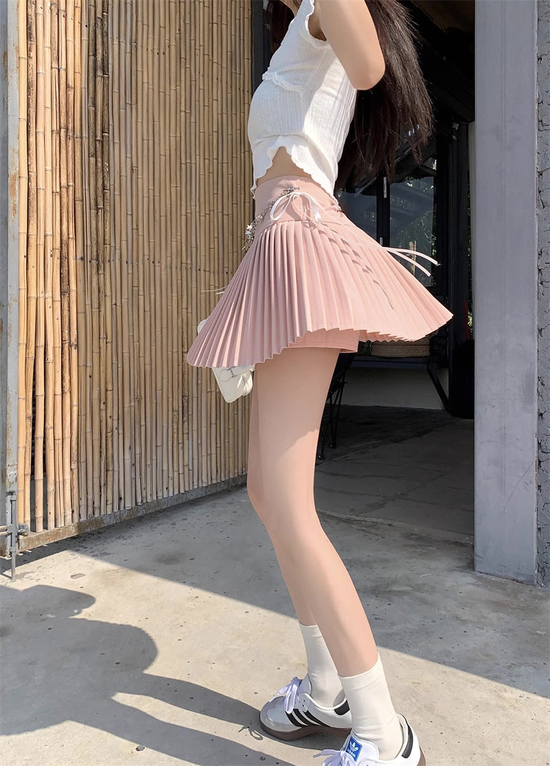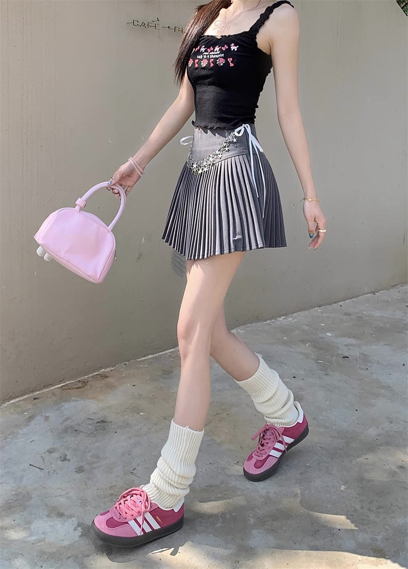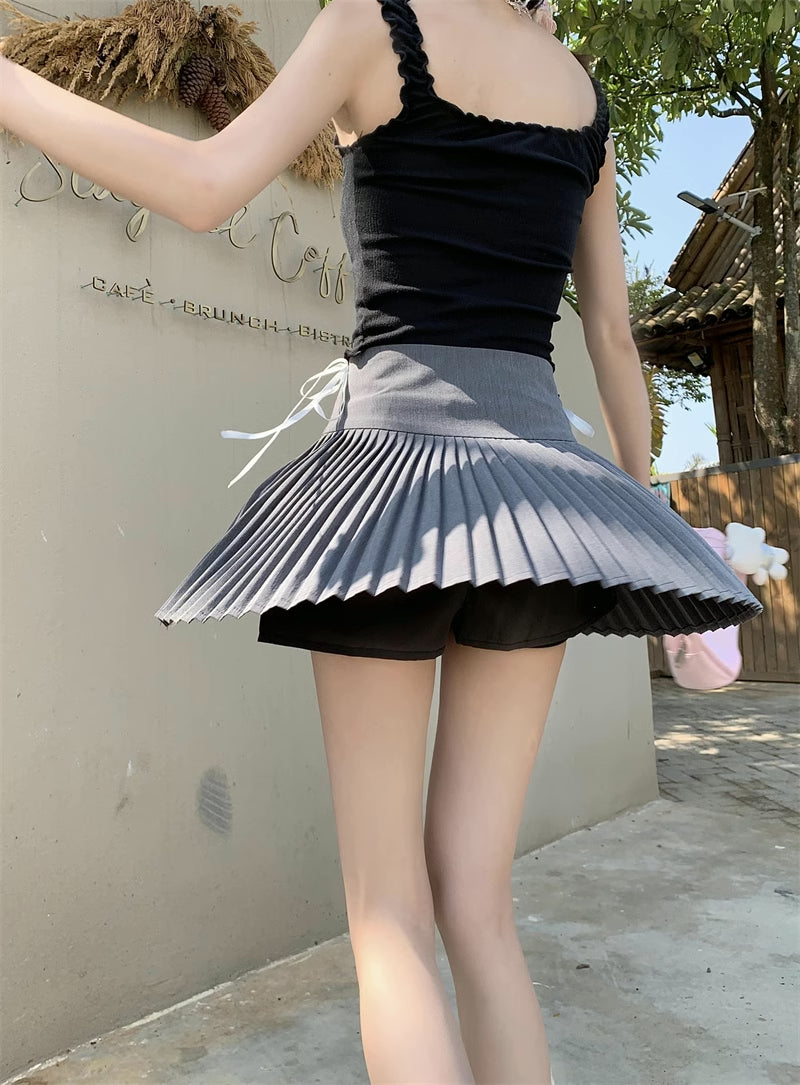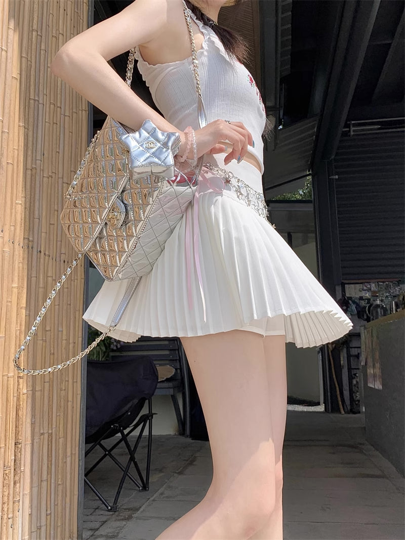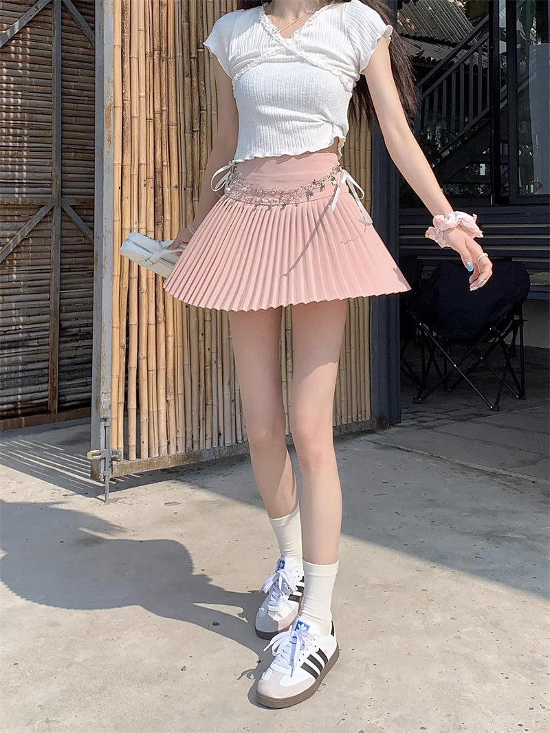 Minirock mit festen Falten, seitlichen Bindebändern und einer sternförmigen Kette, die darüber baumelt. Gefüttert mit Sicherheitsshorts und mit einem verdeckten seitlichen Reißverschluss.