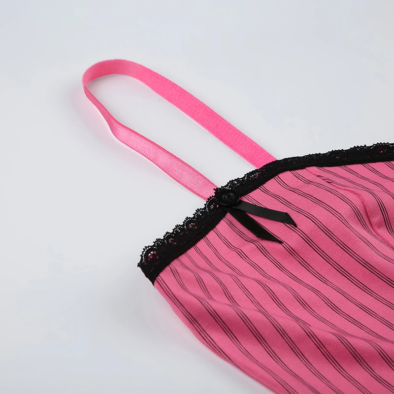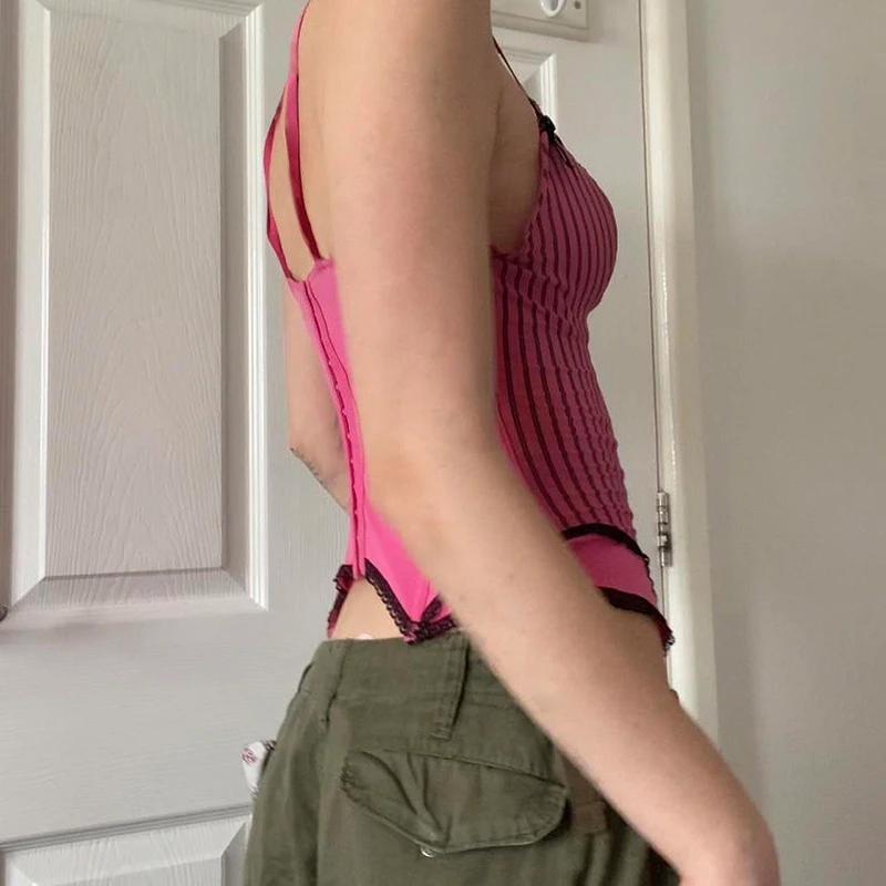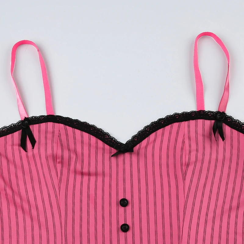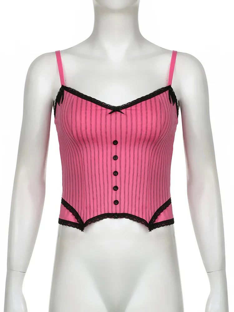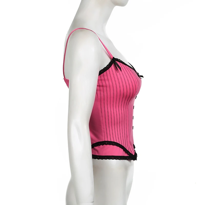 Sweet Bow Stitched Pink Crop Top Vintage y2k Patchwork Sleeveless Striped Print Tees Casual Basic Camisole Kawaii