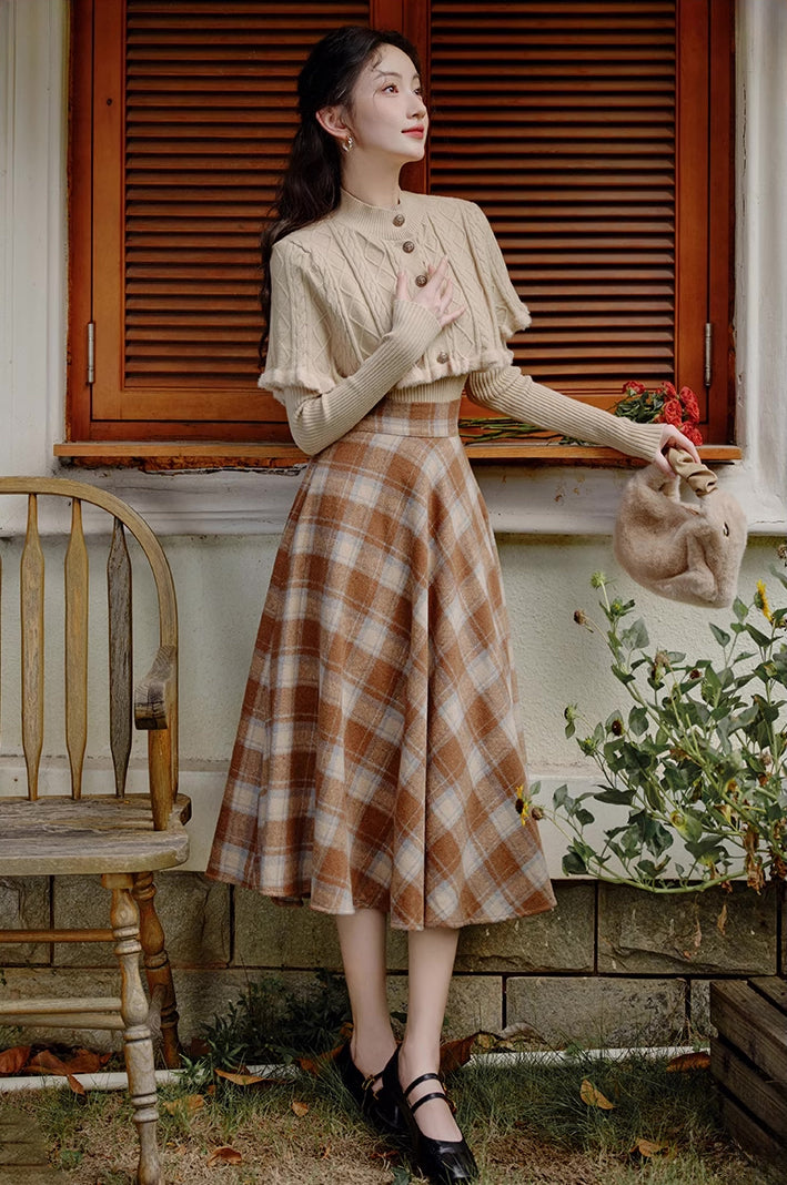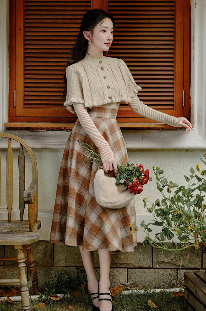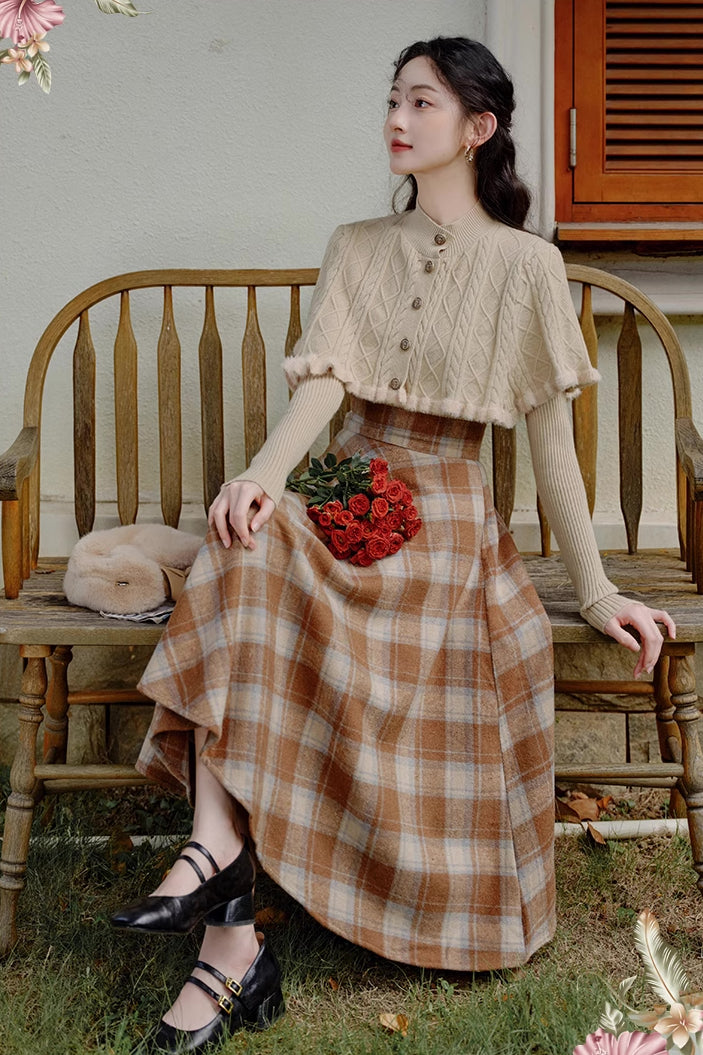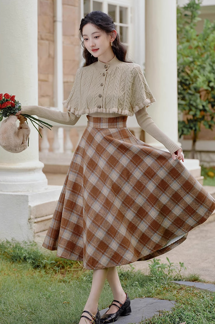 Ein Pullover- und Rock-Set zum einfachen Kombinieren. Bestehend aus einem Rippenstrickpullover mit geknöpftem Capelet und einem karierten Tellerrock in Midilänge mit Knopf und verdecktem seitlichen Reißverschluss. Gefüttert.