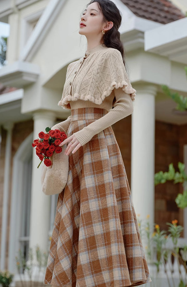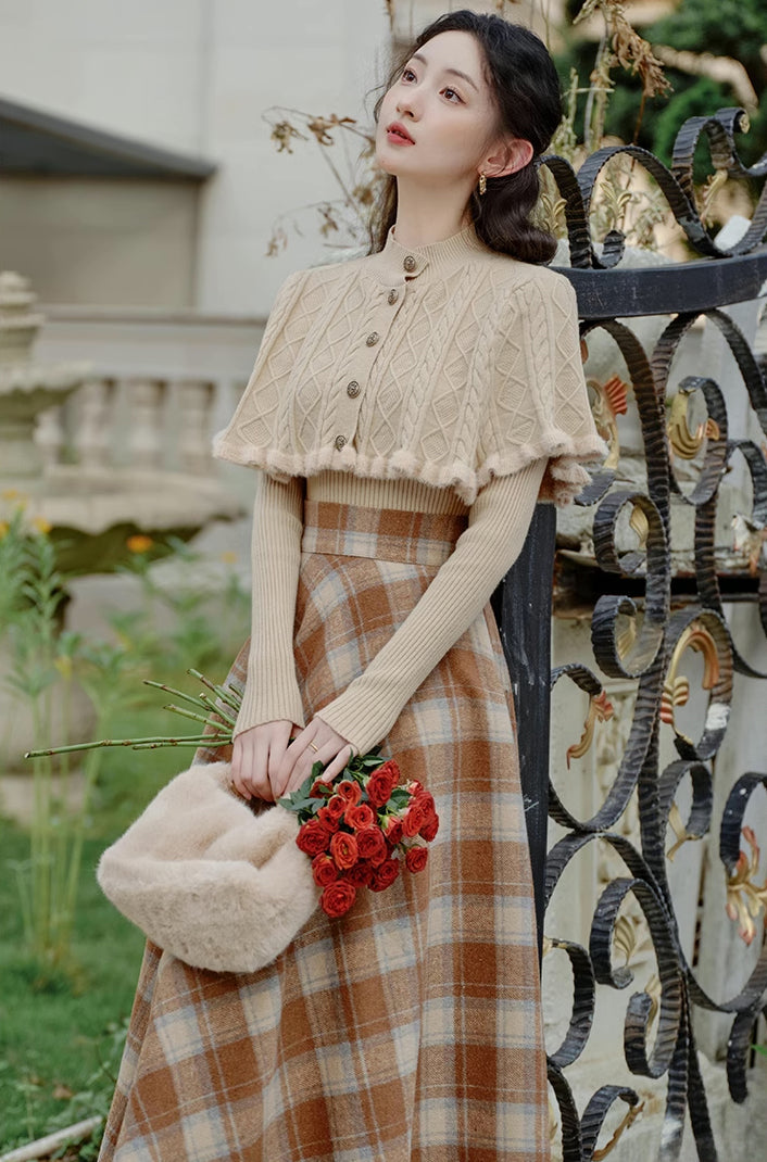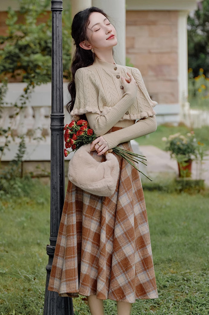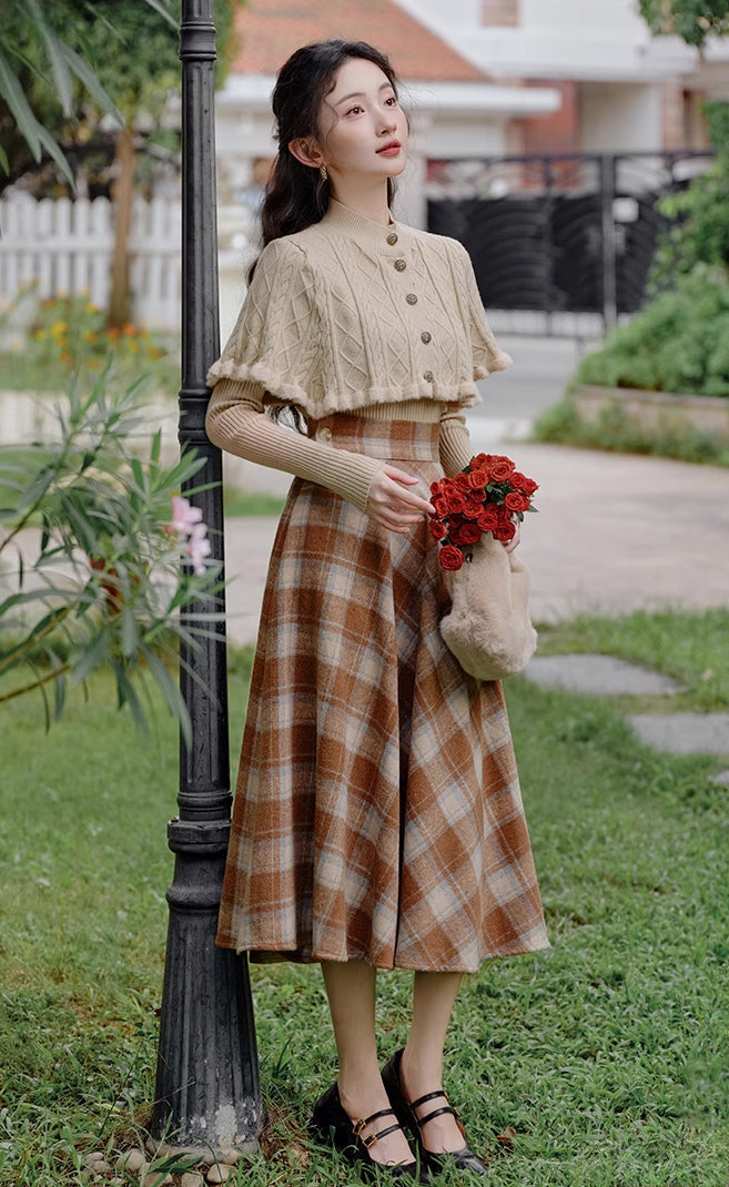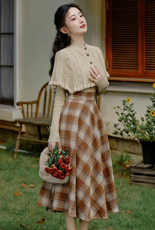 Ein Pullover- und Rock-Set zum einfachen Kombinieren. Bestehend aus einem Rippenstrickpullover mit geknöpftem Capelet und einem karierten Tellerrock in Midilänge mit Knopf und verdecktem seitlichen Reißverschluss. Gefüttert.