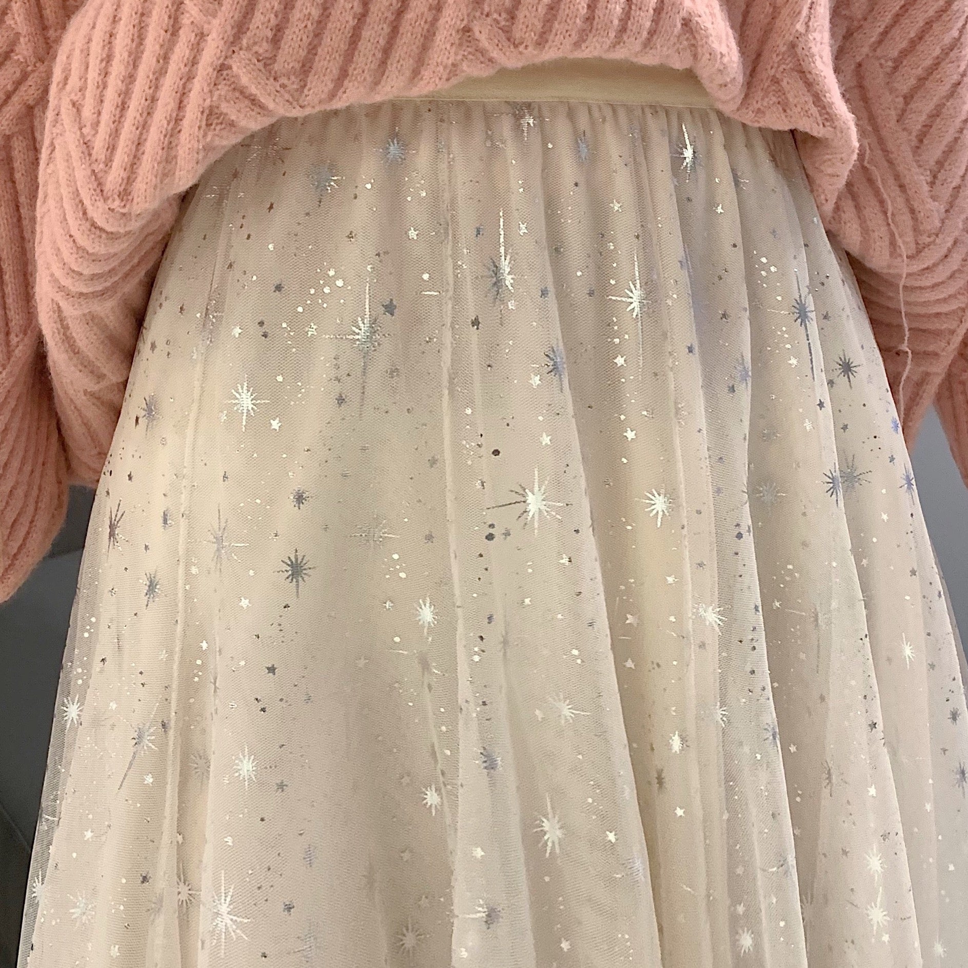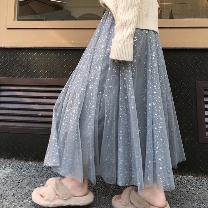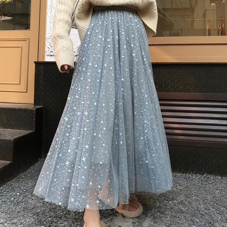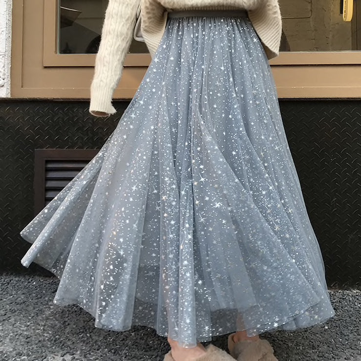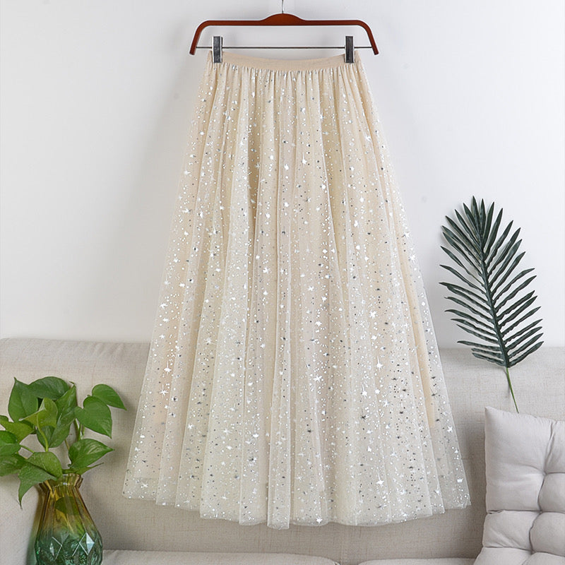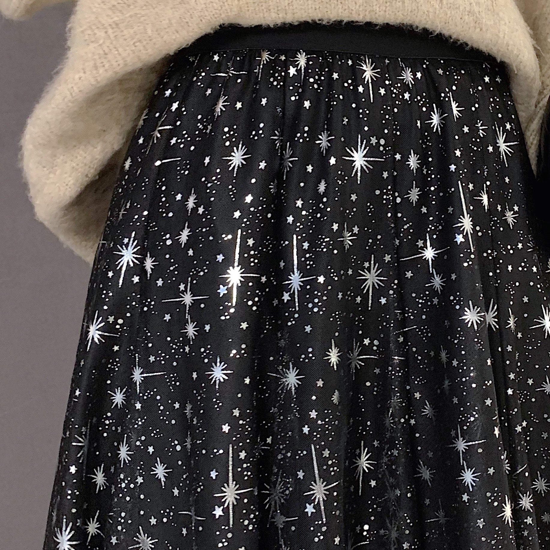 Funkeln und funkeln Sie wie eine Sternschnuppe in diesem zauberhaften Tüllrock in Midilänge mit glitzernden Sternen aus metallischem Silber! Elastischer Bund. Gefüttert.