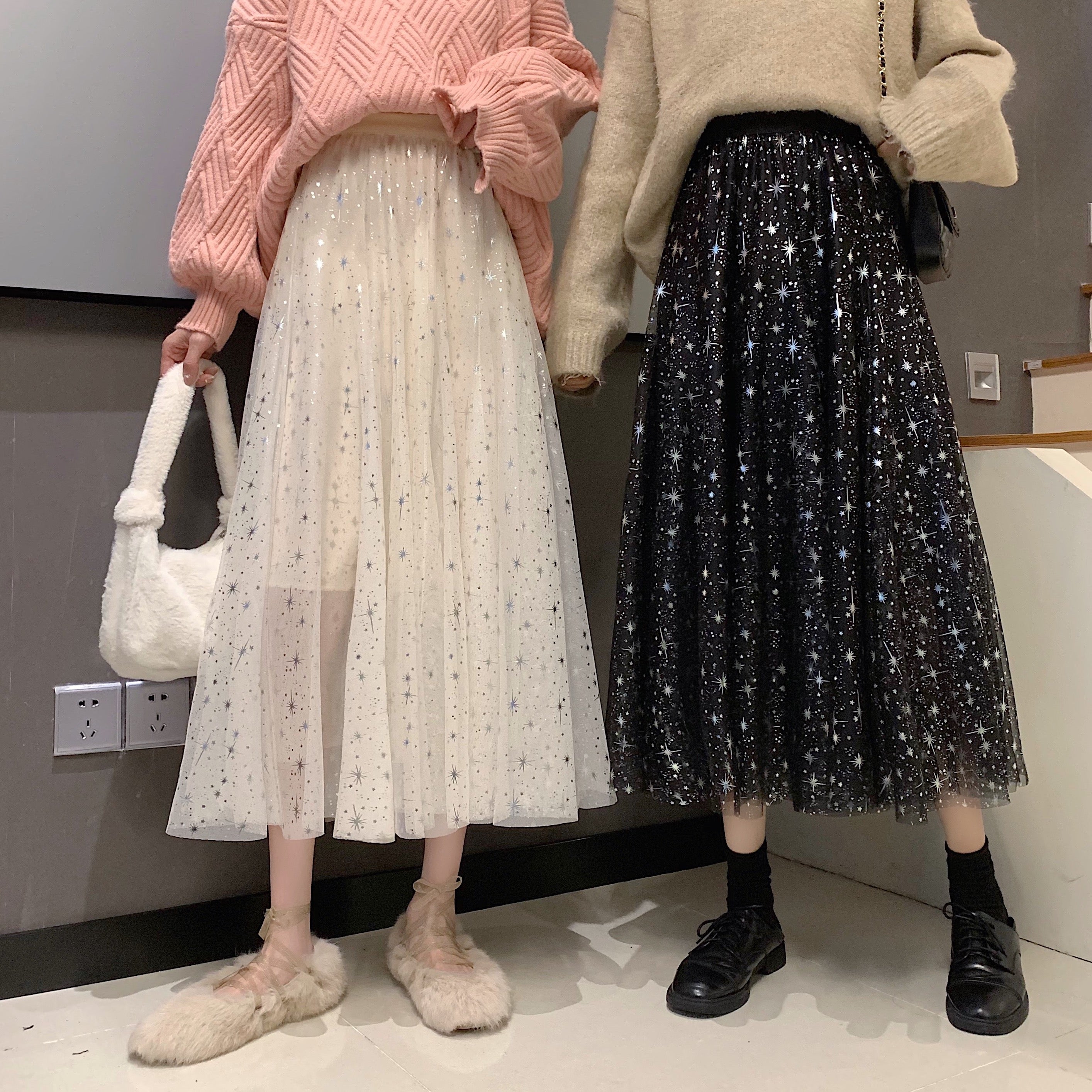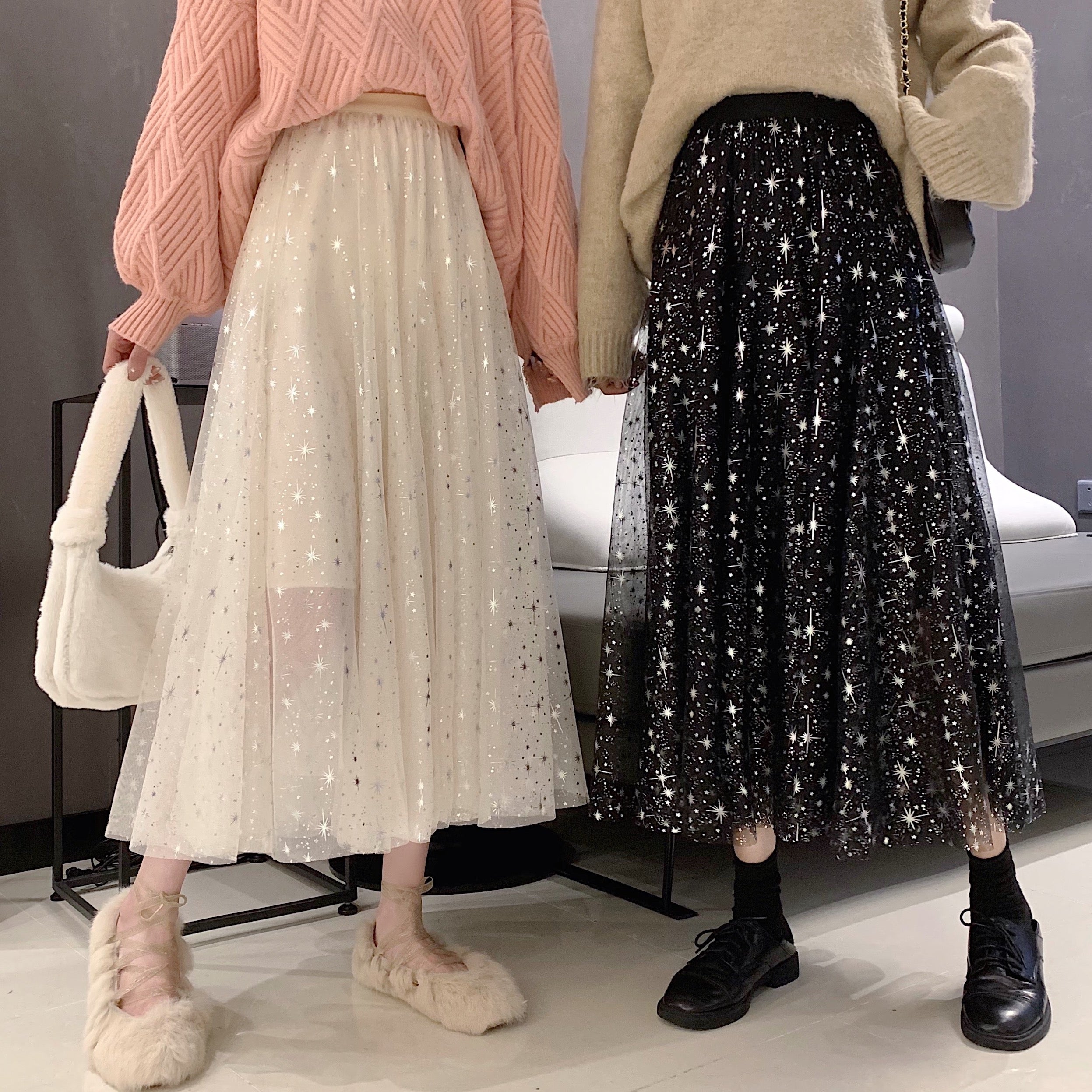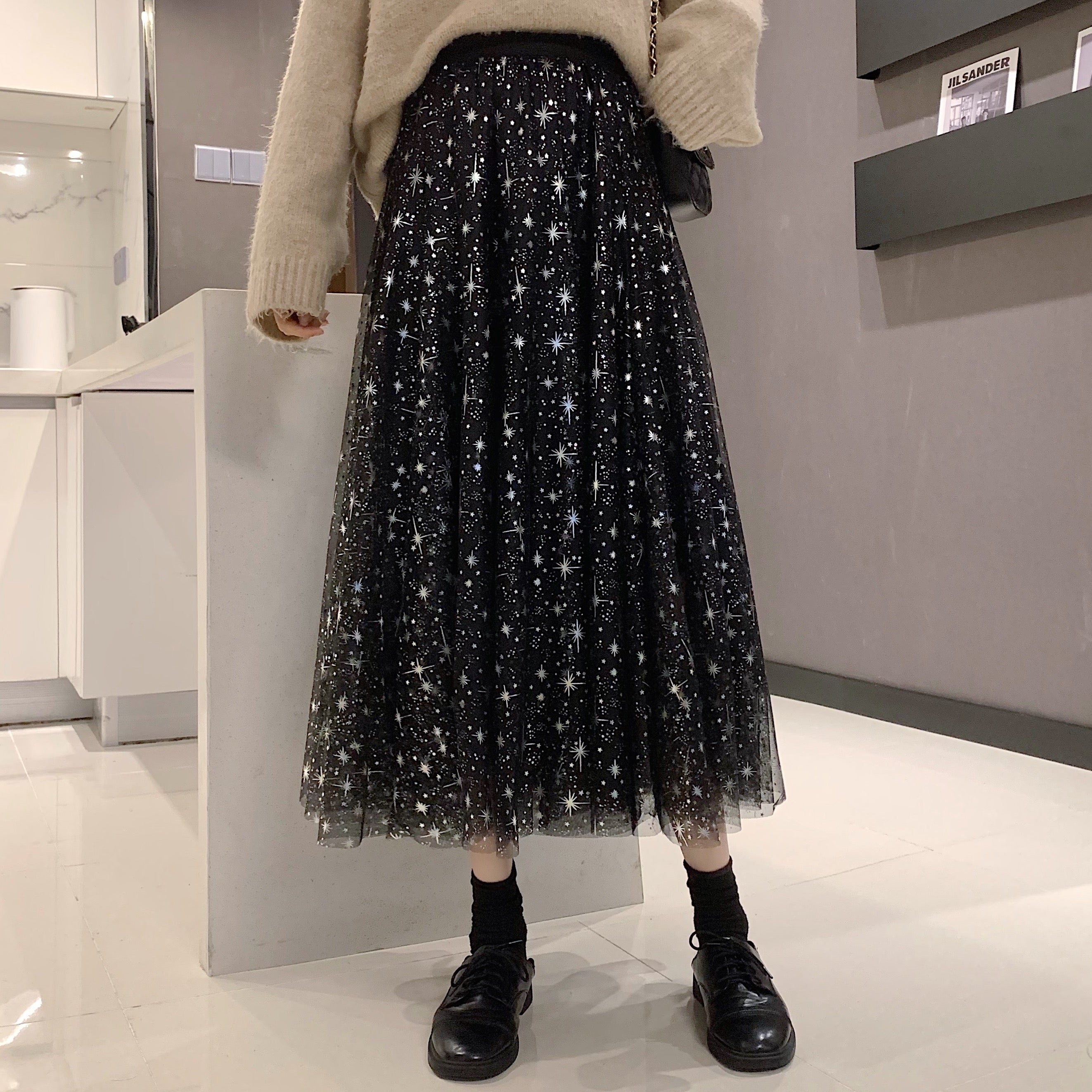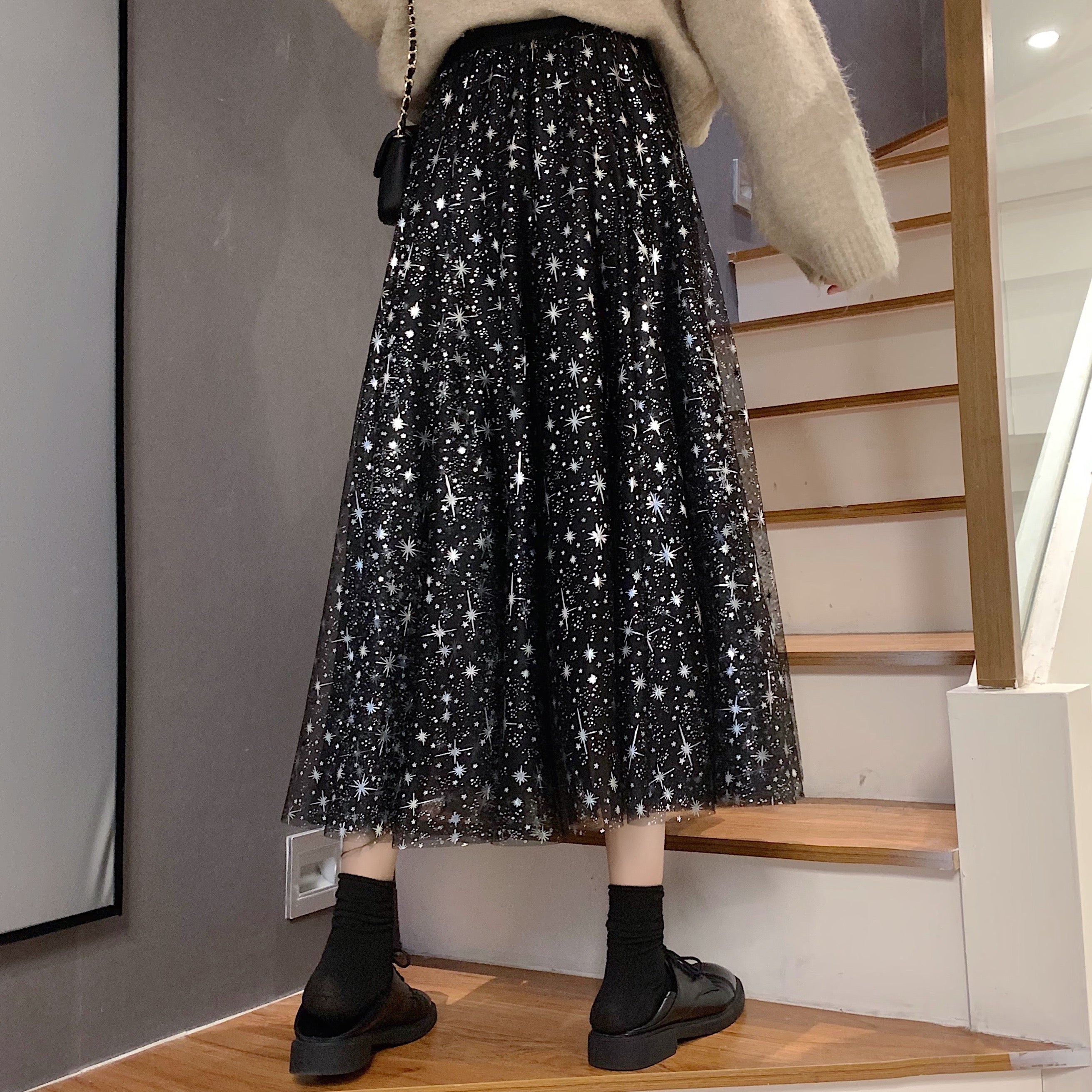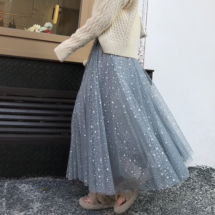 Funkeln und funkeln Sie wie eine Sternschnuppe in diesem zauberhaften Tüllrock in Midilänge mit glitzernden Sternen aus metallischem Silber! Elastischer Bund. Gefüttert.