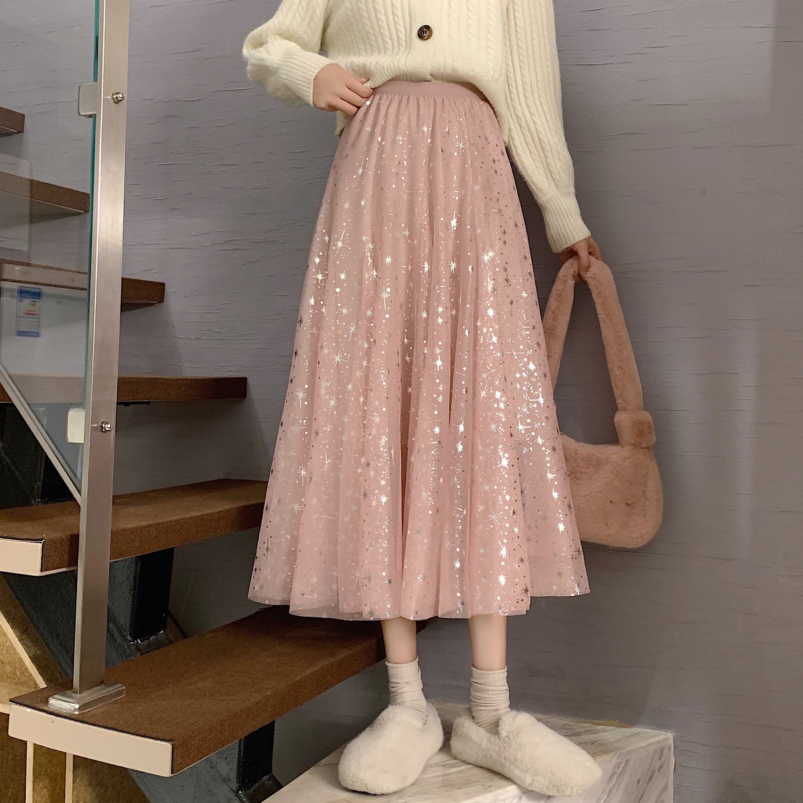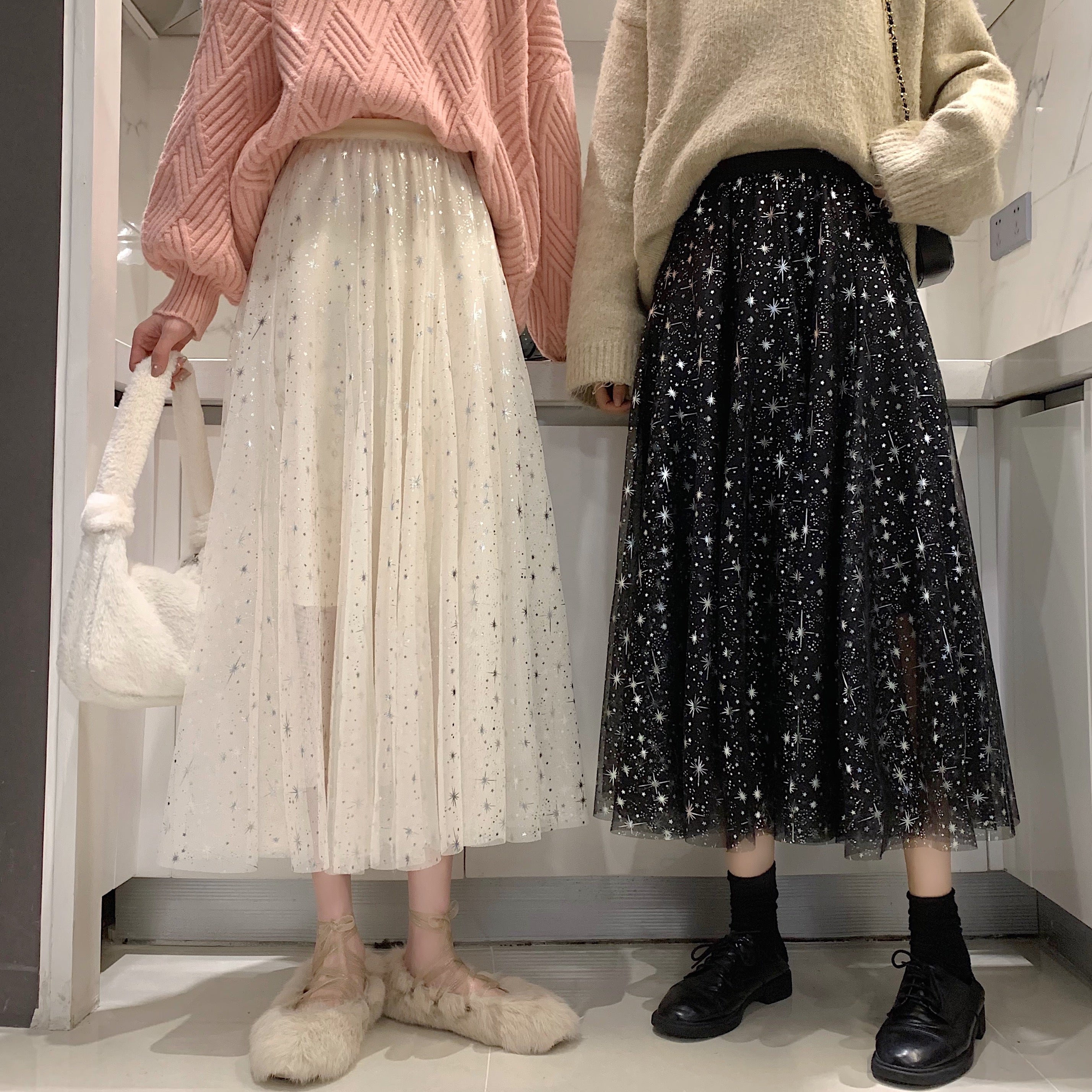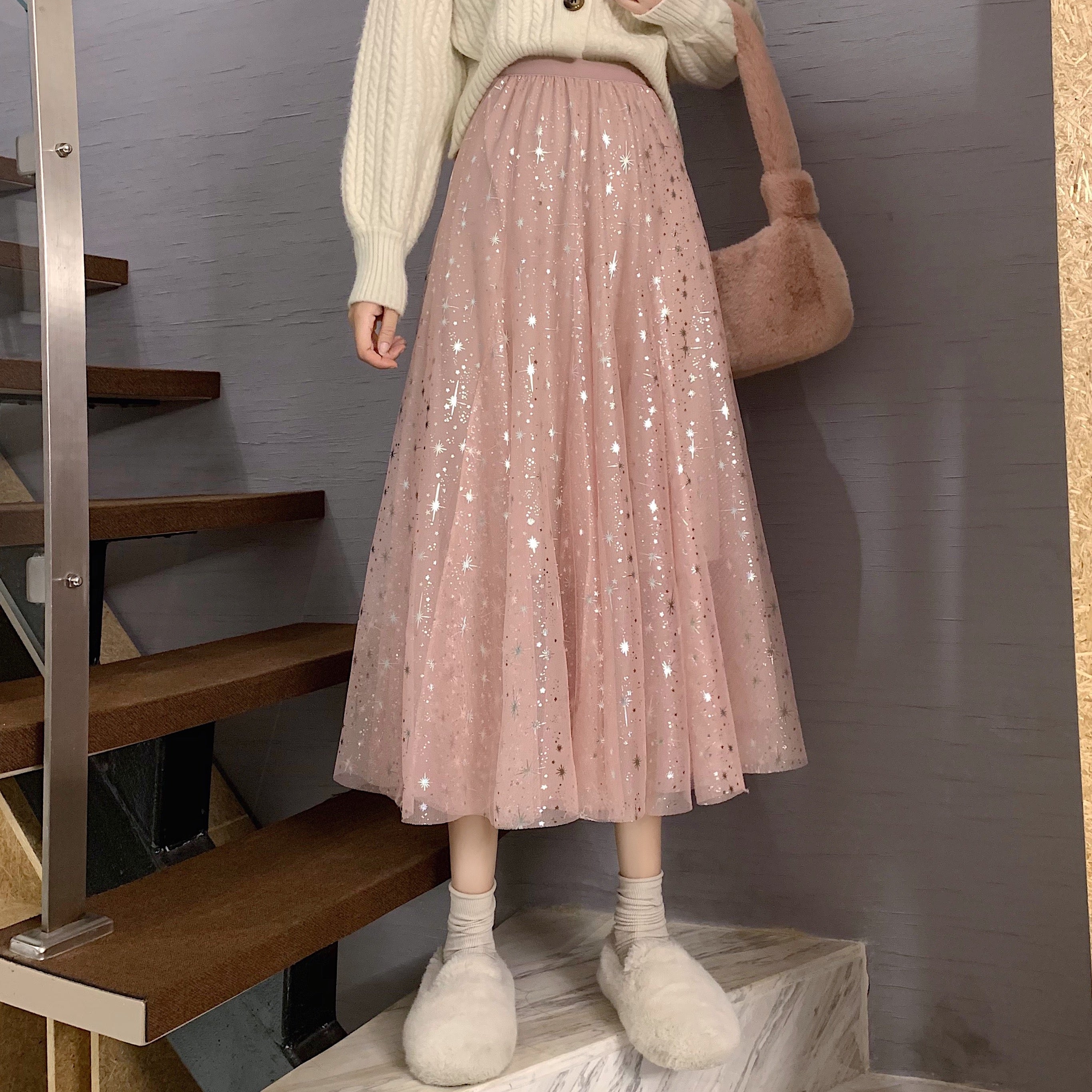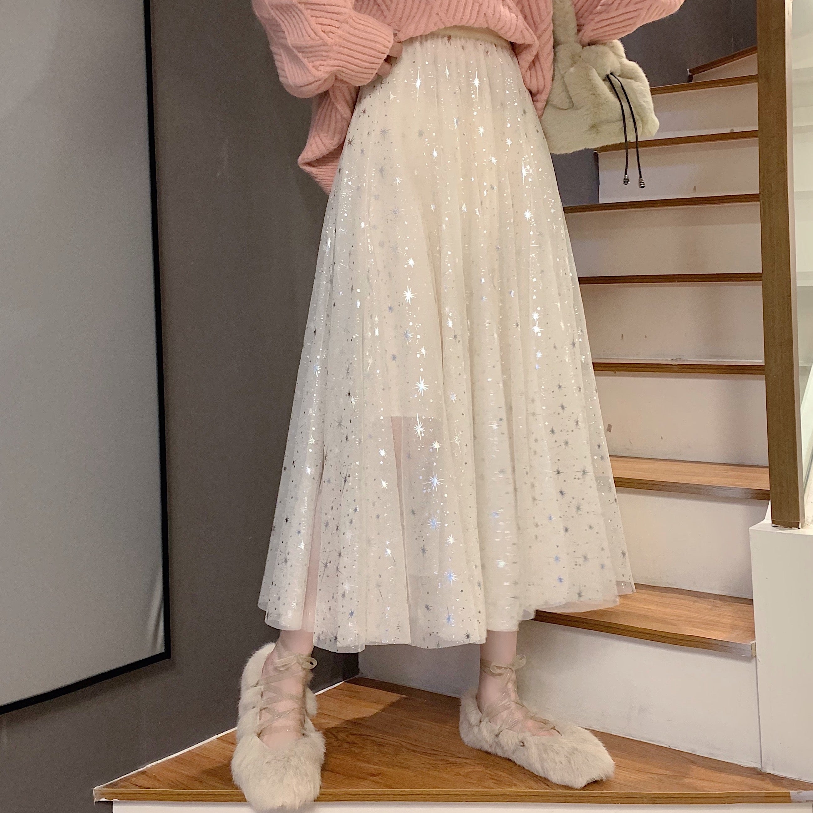 Funkeln und funkeln Sie wie eine Sternschnuppe in diesem zauberhaften Tüllrock in Midilänge mit glitzernden Sternen aus metallischem Silber! Elastischer Bund. Gefüttert.
