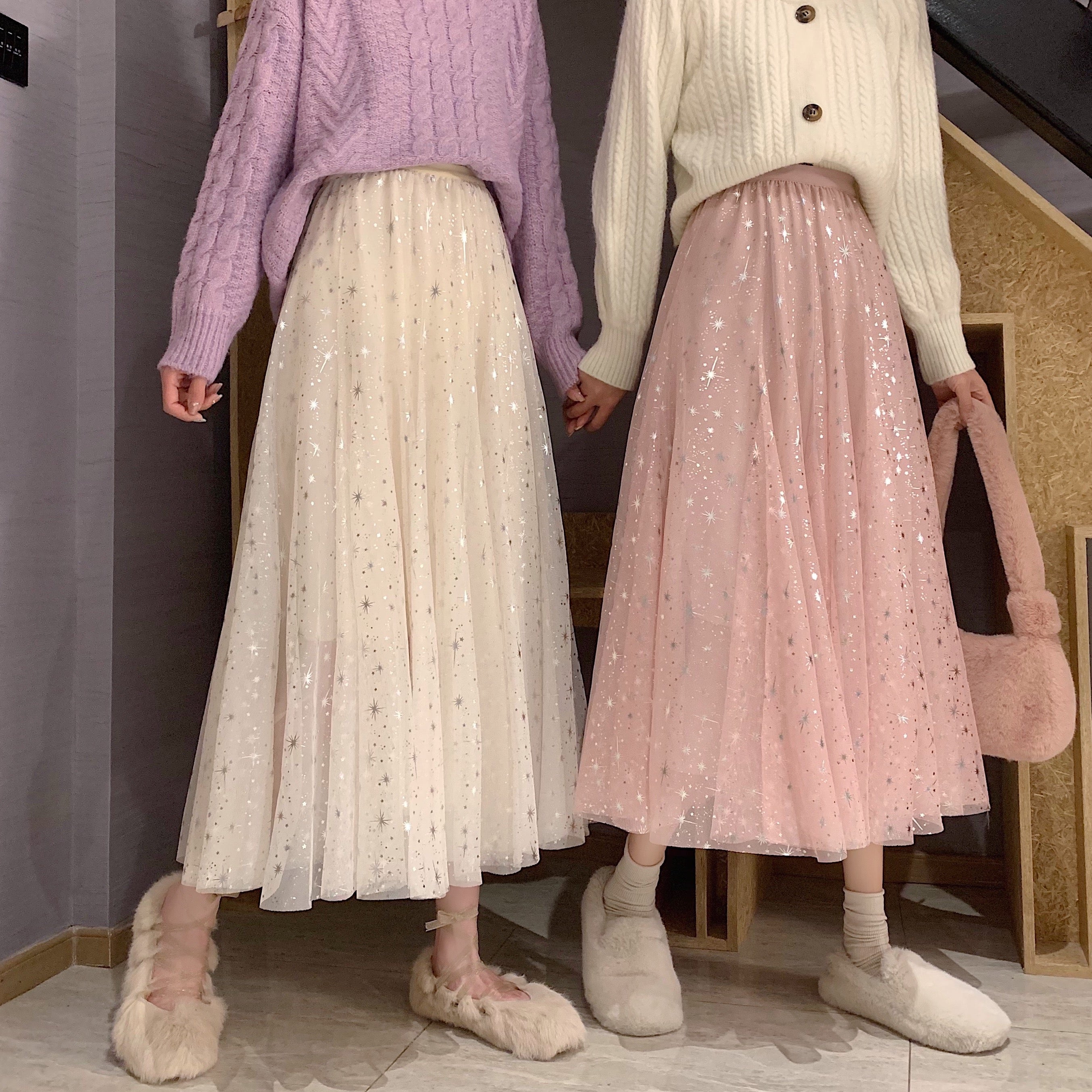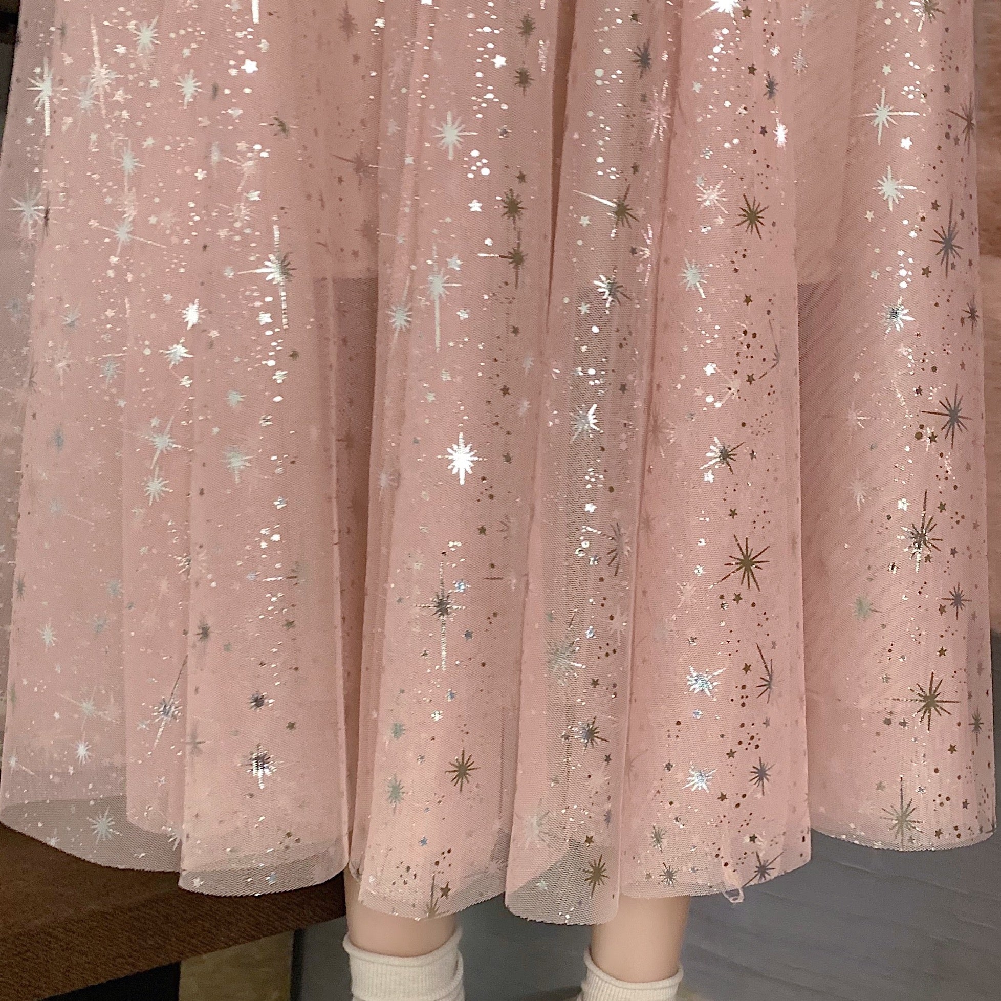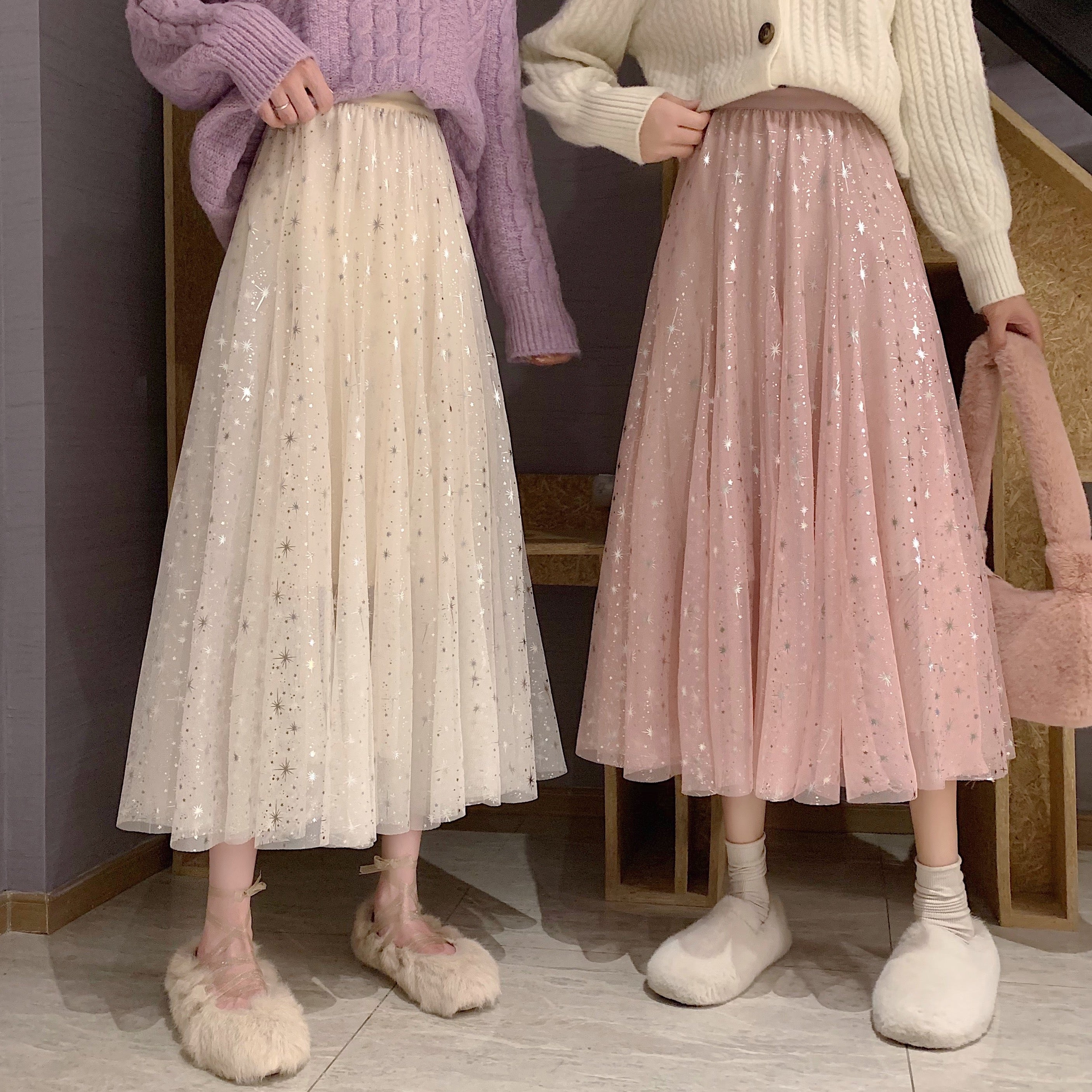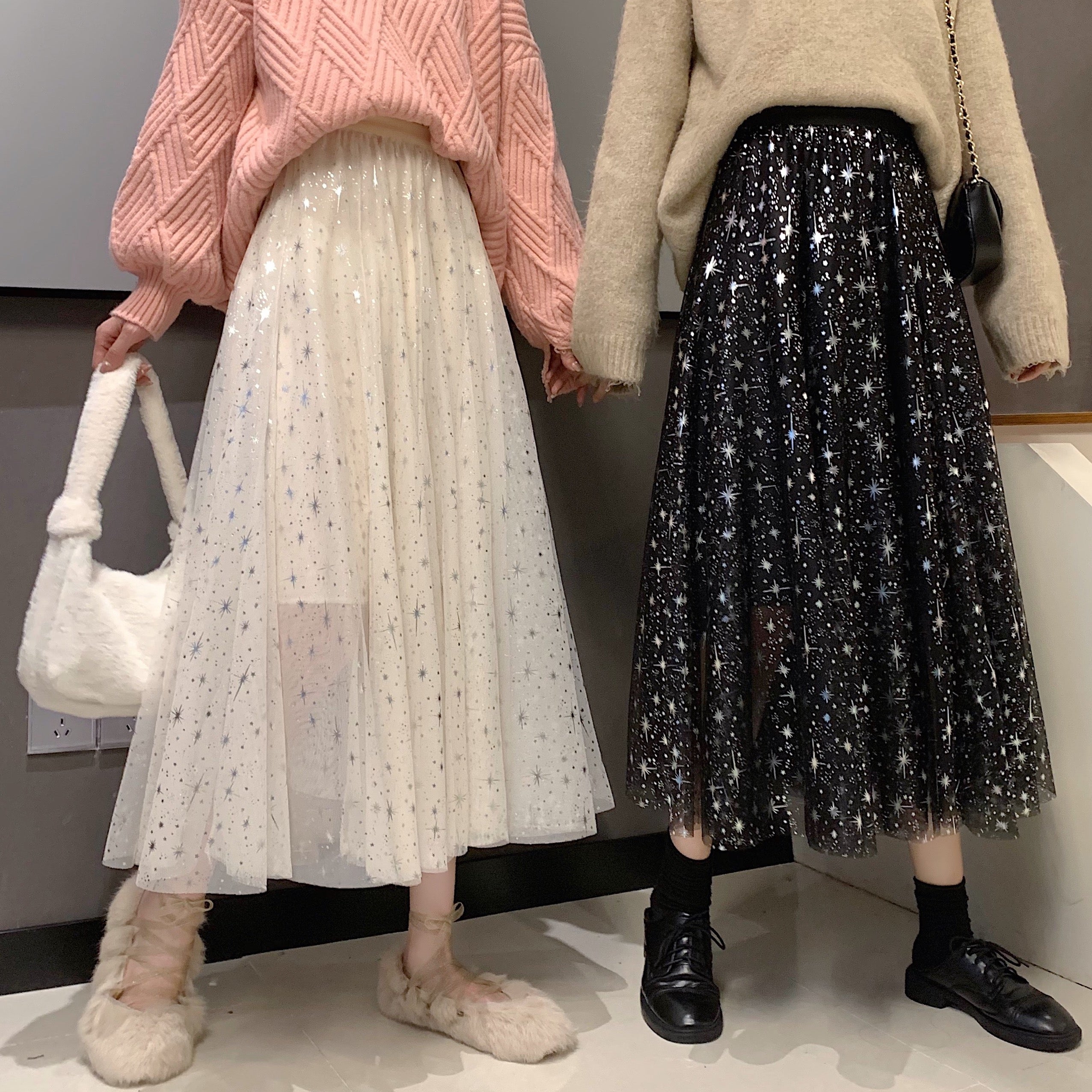 Funkeln und funkeln Sie wie eine Sternschnuppe in diesem zauberhaften Tüllrock in Midilänge mit glitzernden Sternen aus metallischem Silber! Elastischer Bund. Gefüttert.