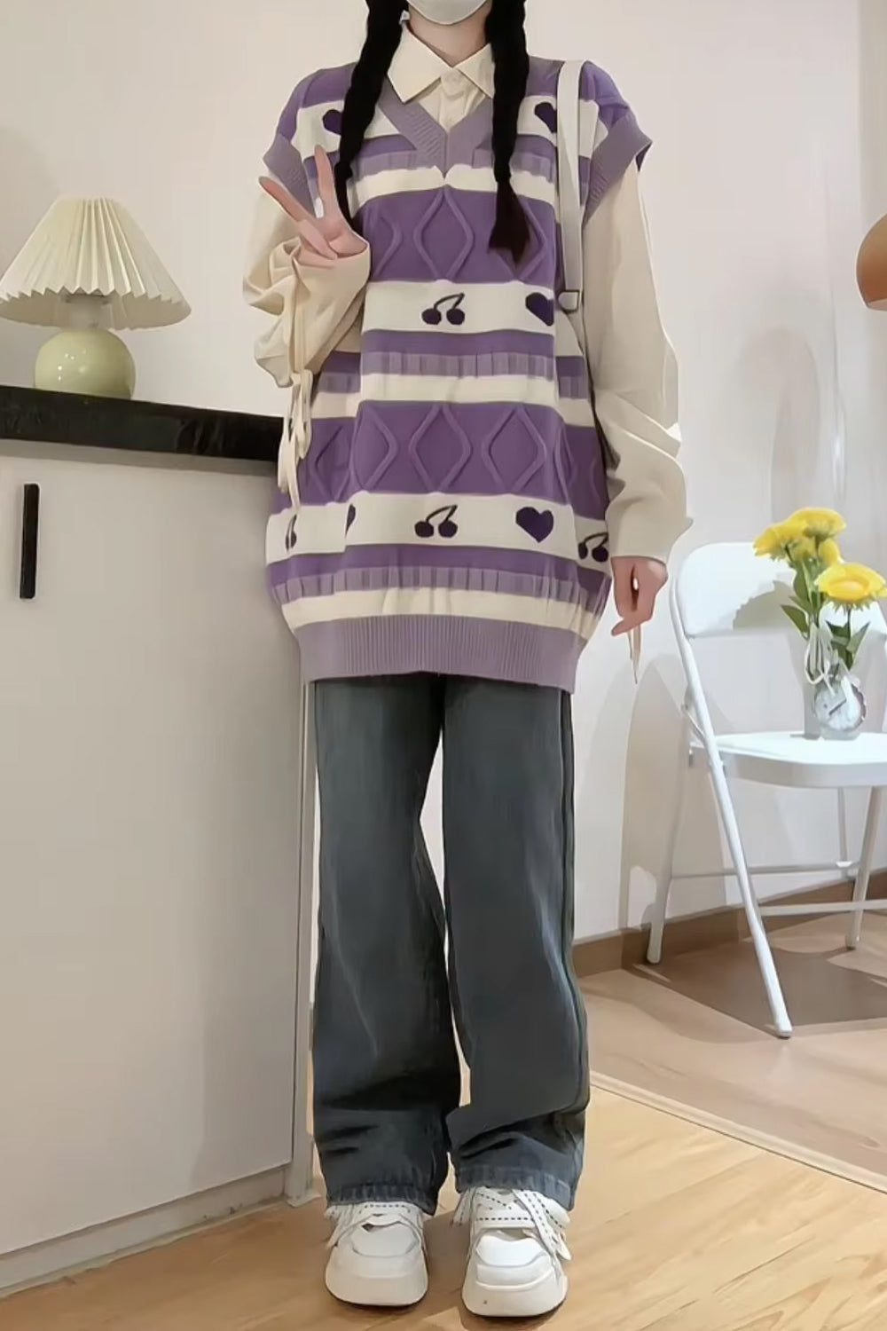 Buy V-Neck Cute Love Pattern Purple Vest Sweater from Omcne for your outfit of the day. This item is in stock and ready to order. World Wide Shipping Service. Check our Shop for more trendy fashion.