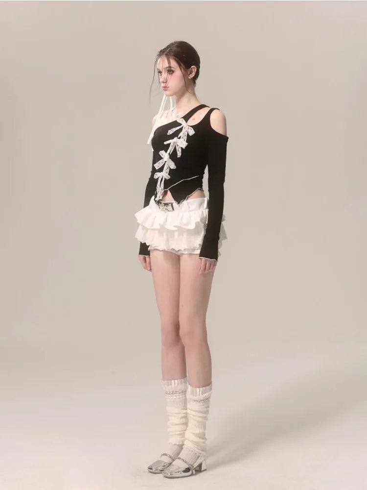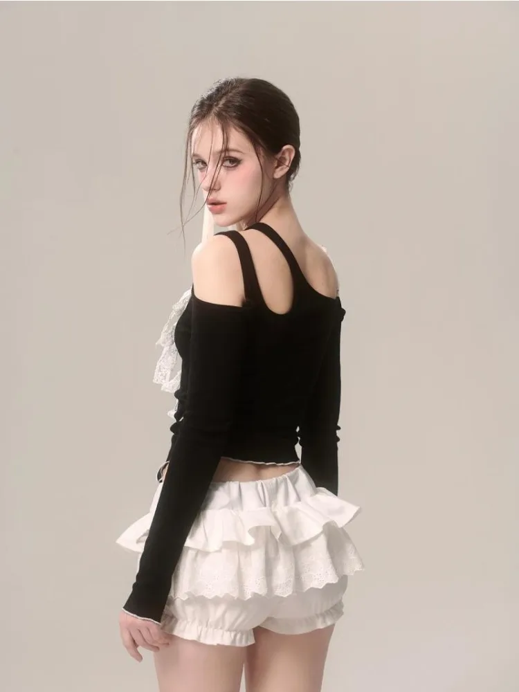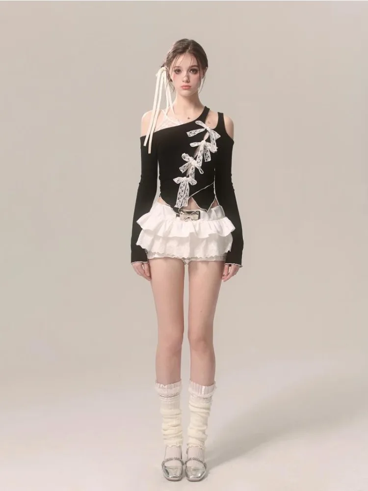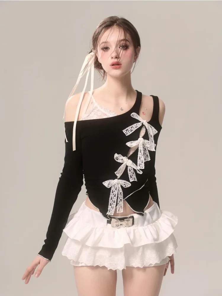Summer Women Lace Fake Two Piece Blouse Japanese Style Bow Kawaii Y2k T Shirt Spicy Girl Aesthetics Slim Fashion Tees Chic