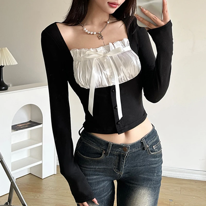 Sweet Contrast Pleated Satin Patchwork Cropped Top Women Coquette Slim-fit Knitted T-shirts Fall Spring Y2K Tops Kawaii