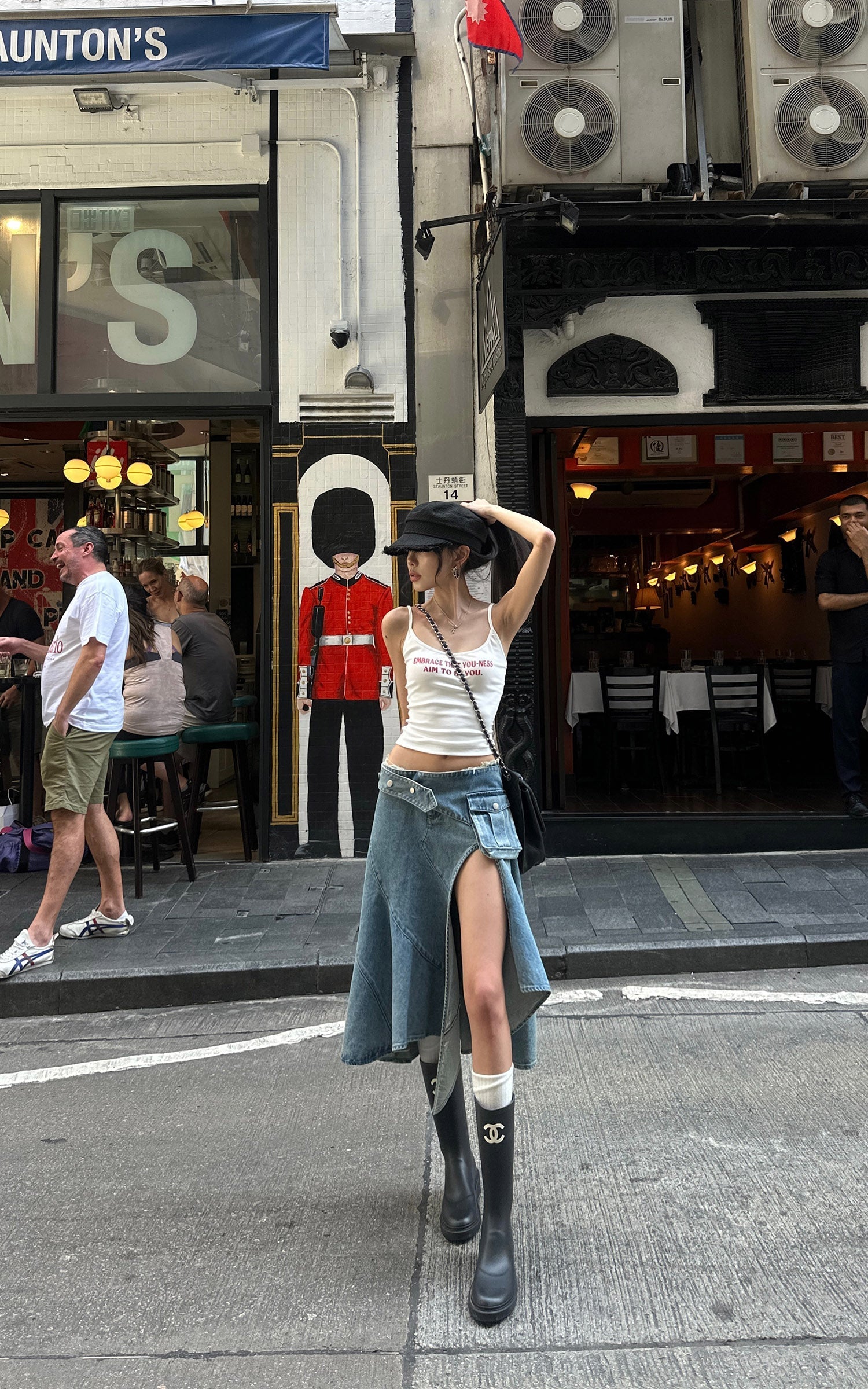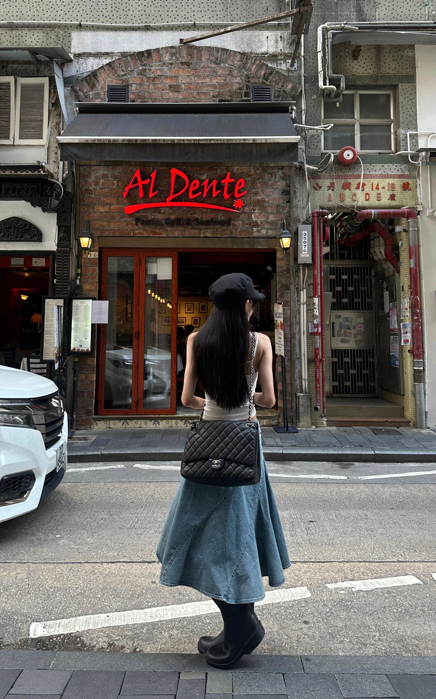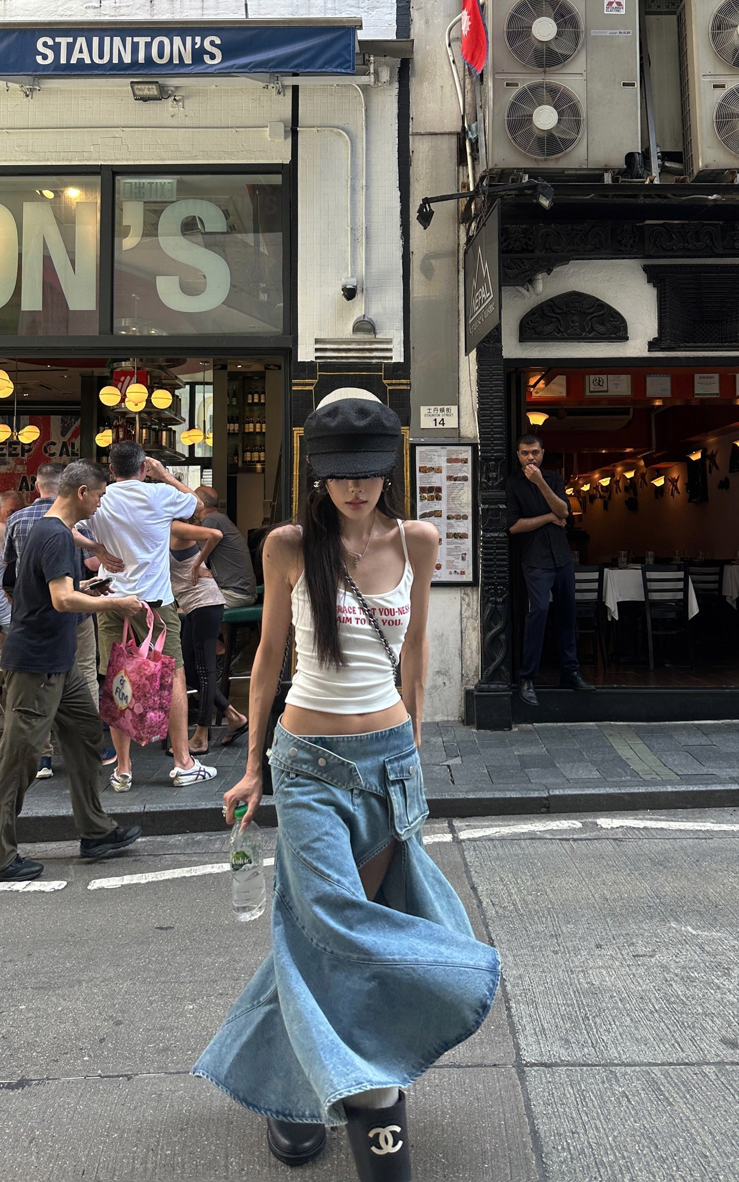 Raw-cut waistband meets architectural silhouette in this A-line denim skirt. A removable flap pocket and angled buttoned belt deliver a utilitarian edge. while the deep front slit breaks symmetry with bold motion. Crafted from washed cotton denim with paneled construction and exaggerated hem flare. Designed for uncompromising street statements.
