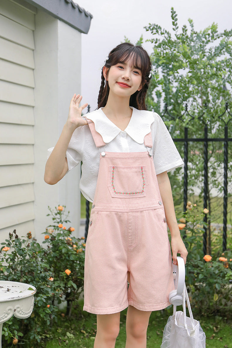 Mono en tonos pastel con un corte amplio y flores bordadas a lo largo del bolsillo del babero. Botones laterales. Bolsillos laterales y bolsillos traseros.
