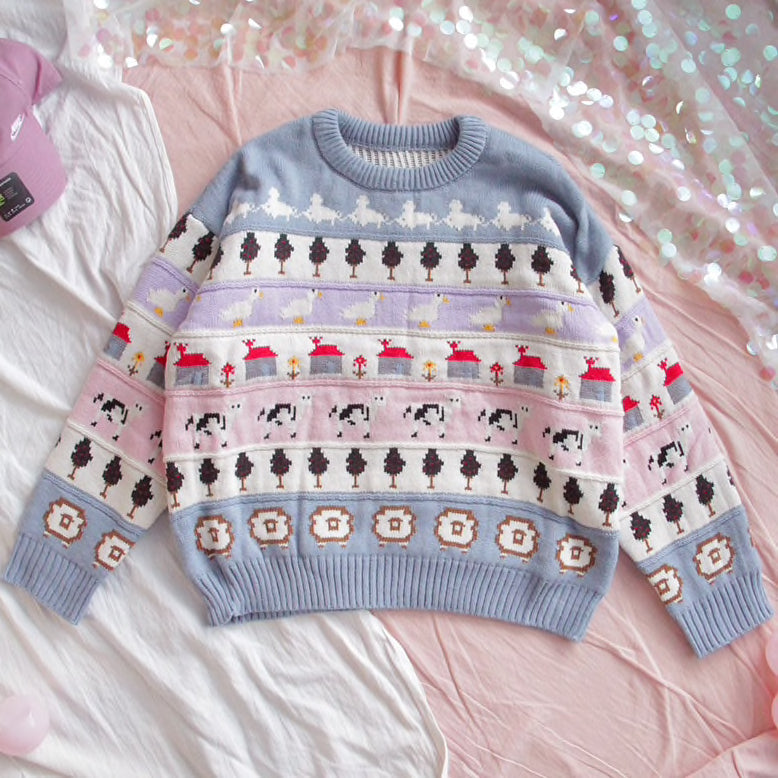 Vive tus fantasías de granja o cottagecore con este suéter con ovejas, vacas, patos, árboles y flores.