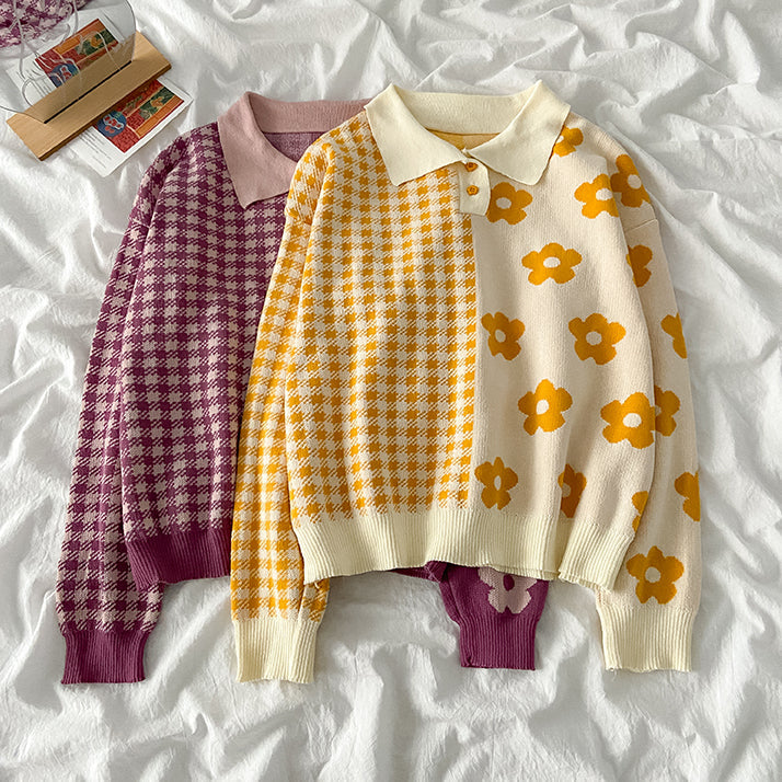 Con margaritas y cuadros vichy, acertarás seguro. Consigue lo mejor de ambos estampados en un solo suéter con un diseño mitad y mitad. Cuello polo y botones de flores.