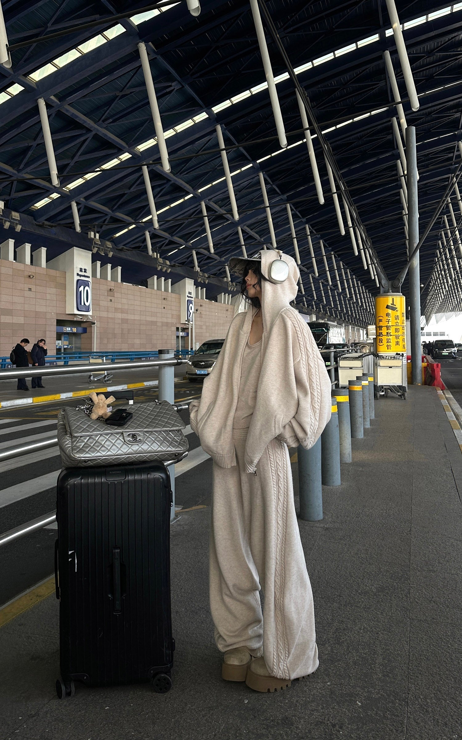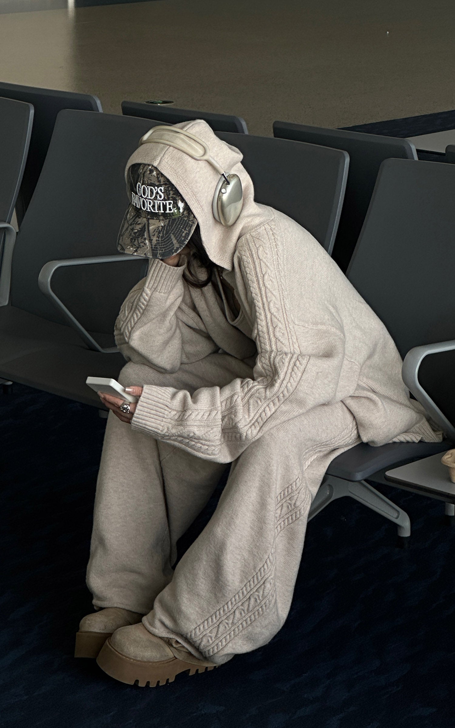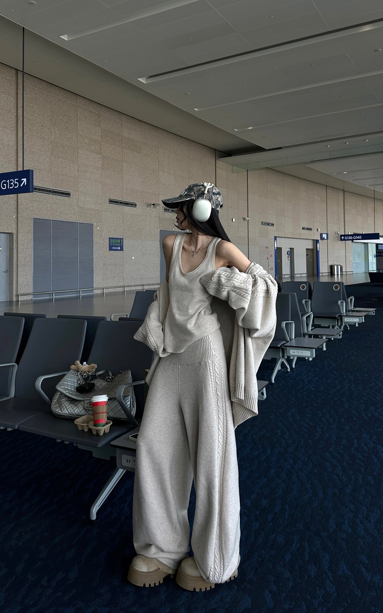 Designed as a complete yet flexible system. this three-piece knit set balances softness with structure. The zip-up cardigan features a relaxed hood and subtle cable detailing along the shoulders and sleeves. A fitted knit tank creates a clean inner layer. while the high-rise wide-leg pants offer effortless movement and proportion. The fabric feels warm and substantial. delivering a quiet. understated look that works from travel to everyday city wear.