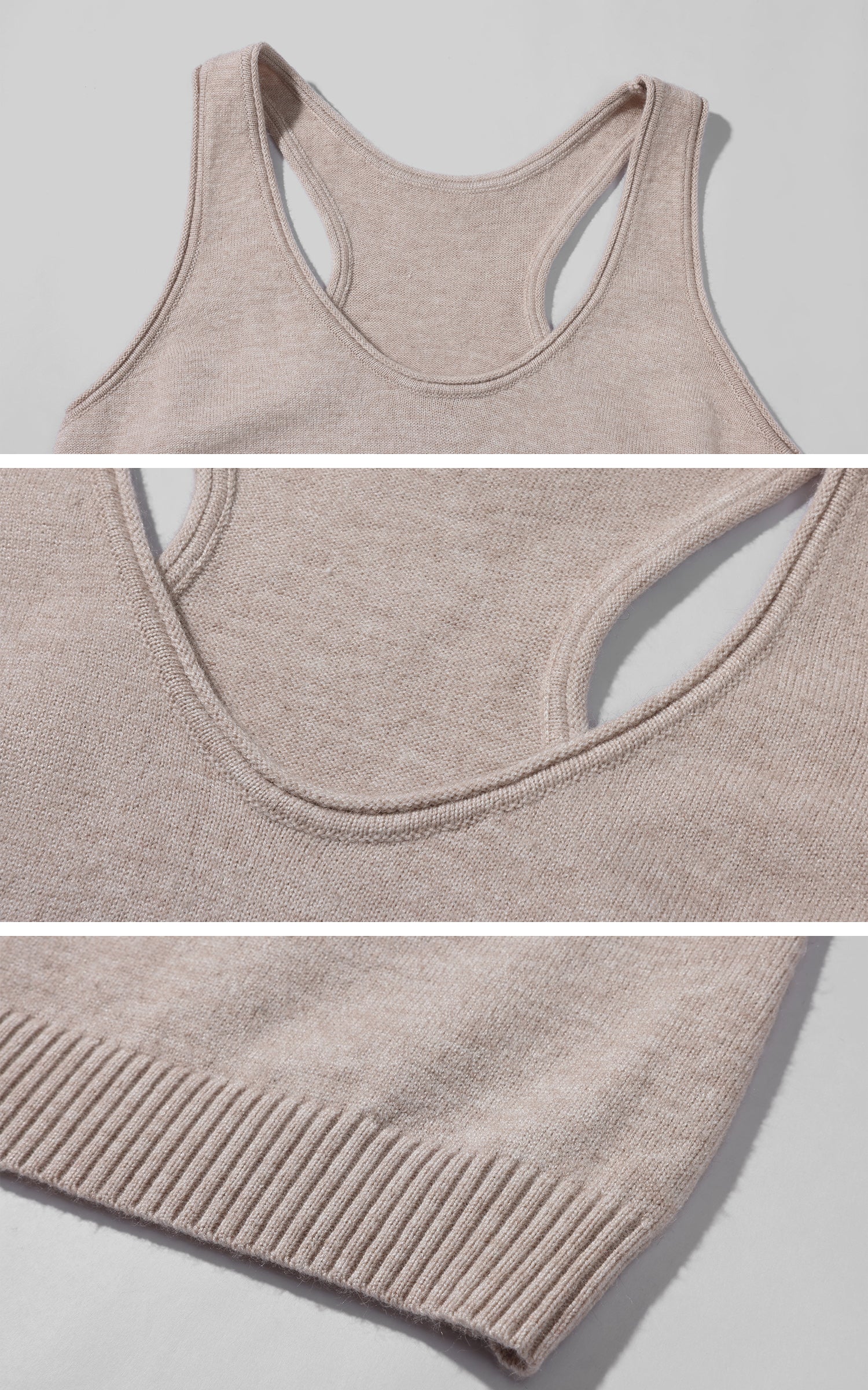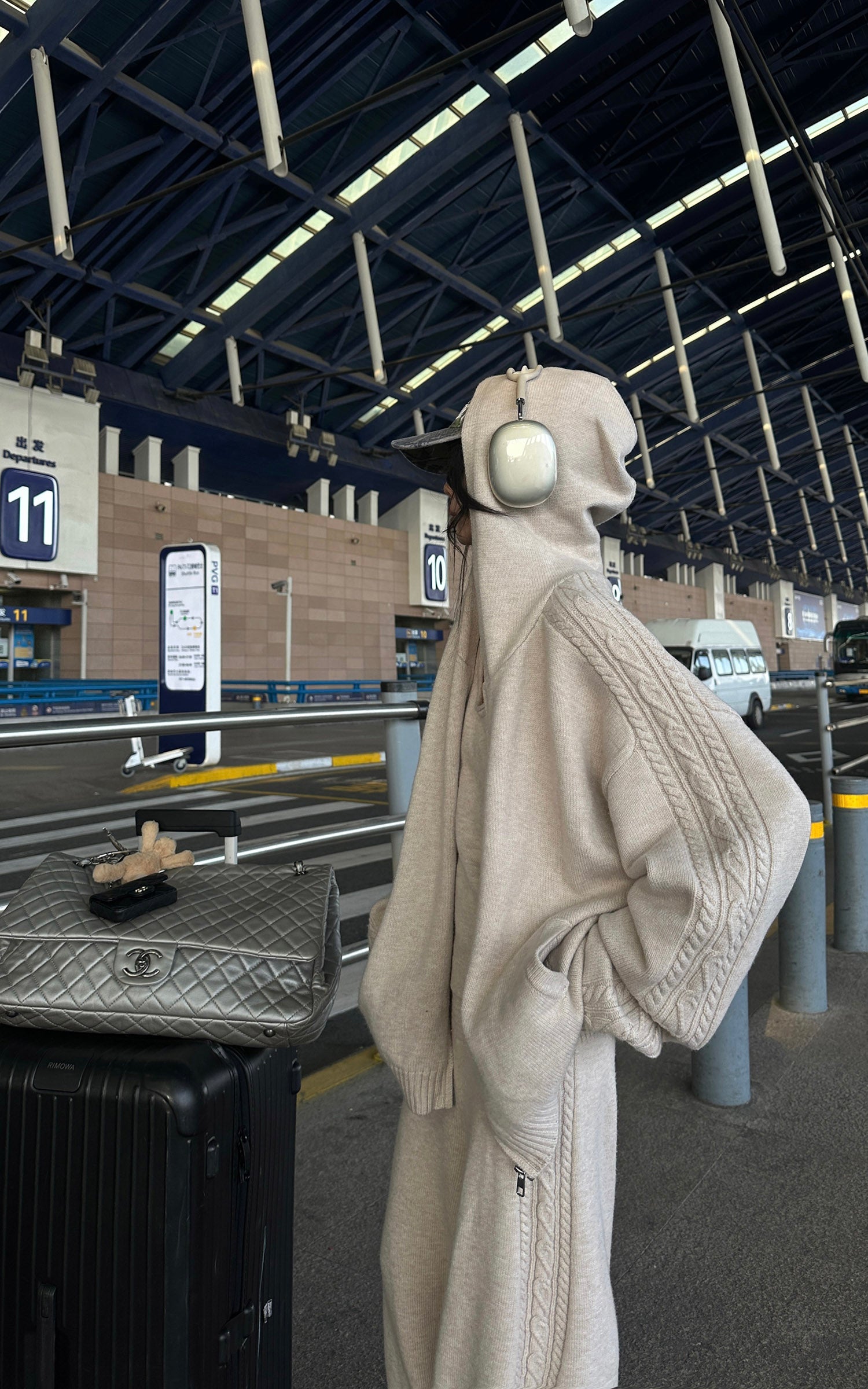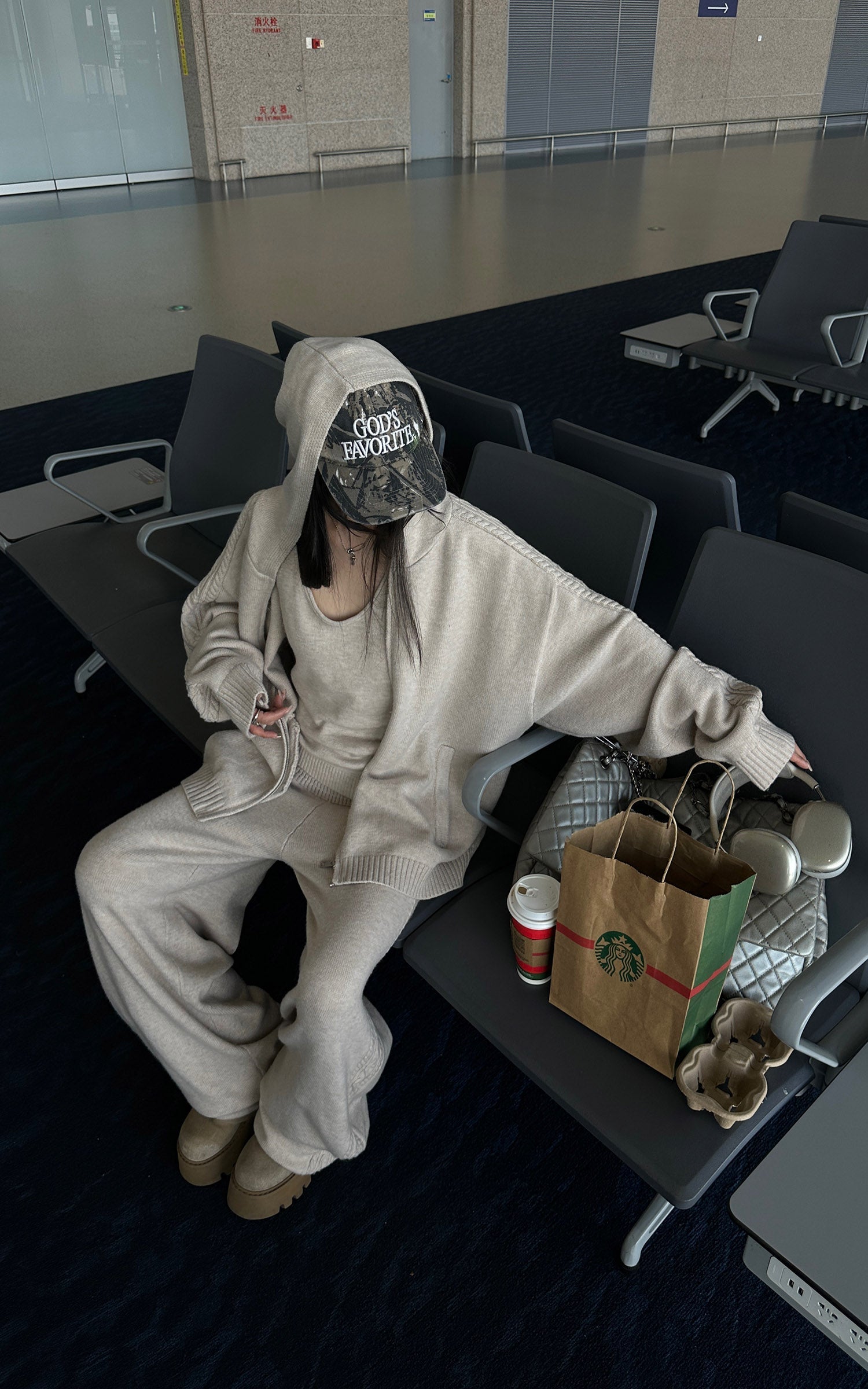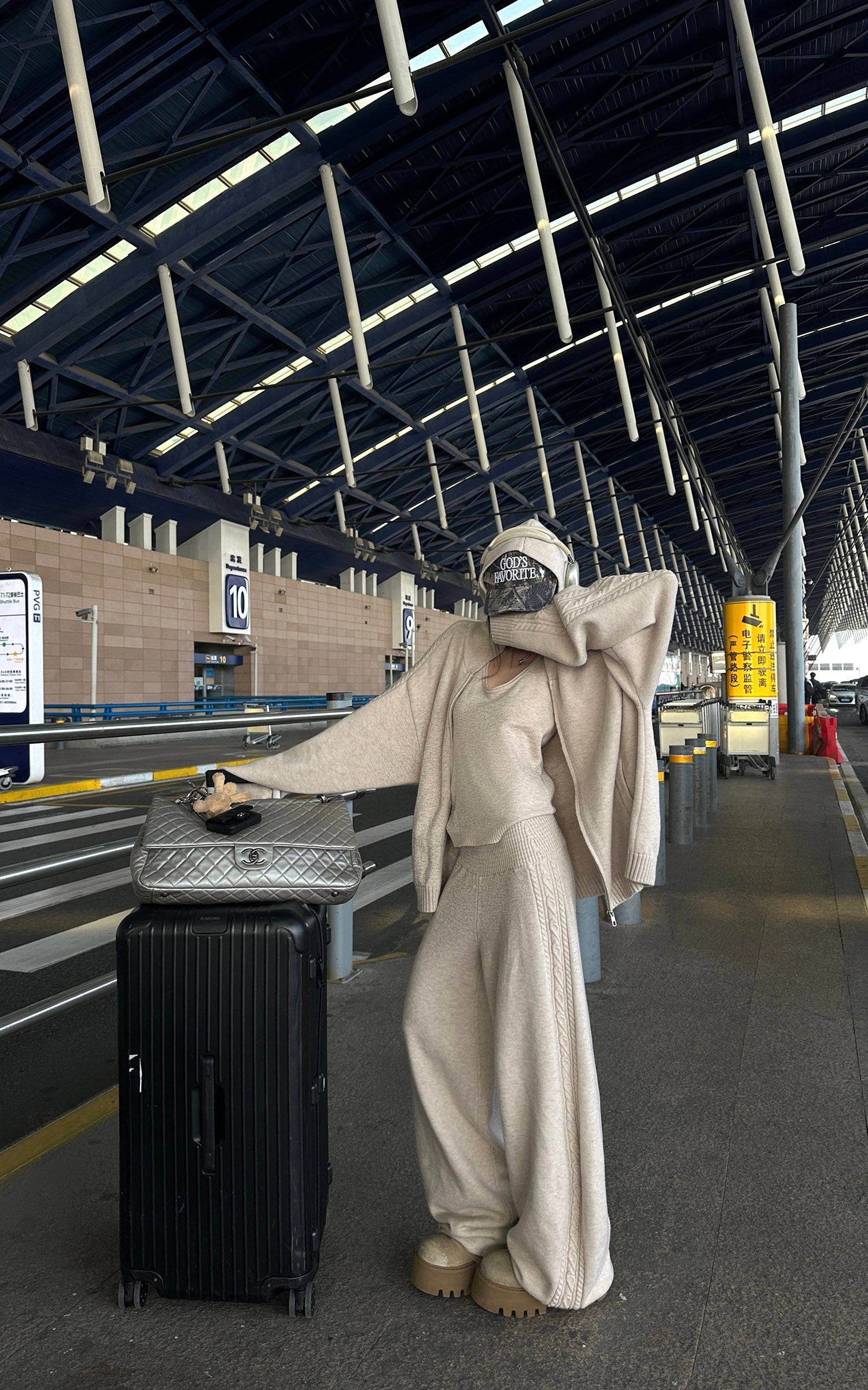 Designed as a complete yet flexible system. this three-piece knit set balances softness with structure. The zip-up cardigan features a relaxed hood and subtle cable detailing along the shoulders and sleeves. A fitted knit tank creates a clean inner layer. while the high-rise wide-leg pants offer effortless movement and proportion. The fabric feels warm and substantial. delivering a quiet. understated look that works from travel to everyday city wear.