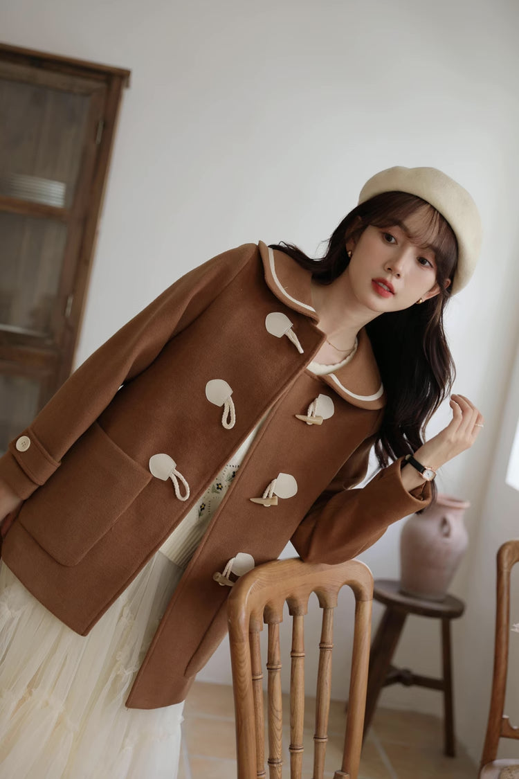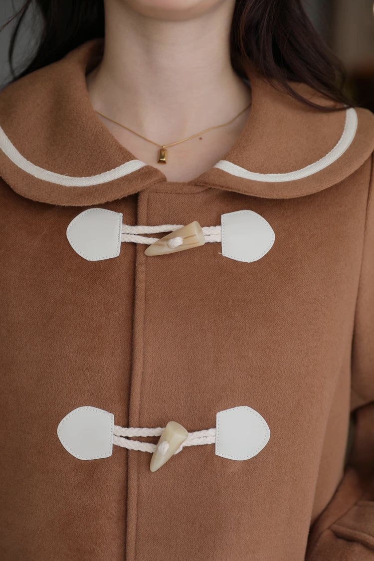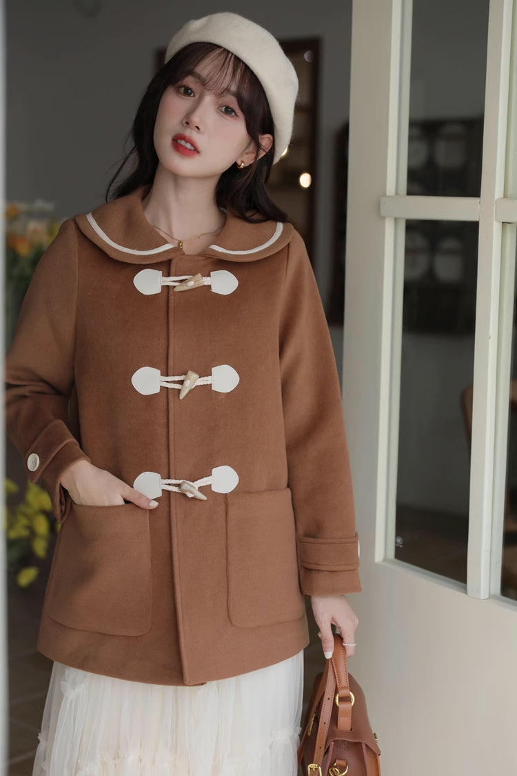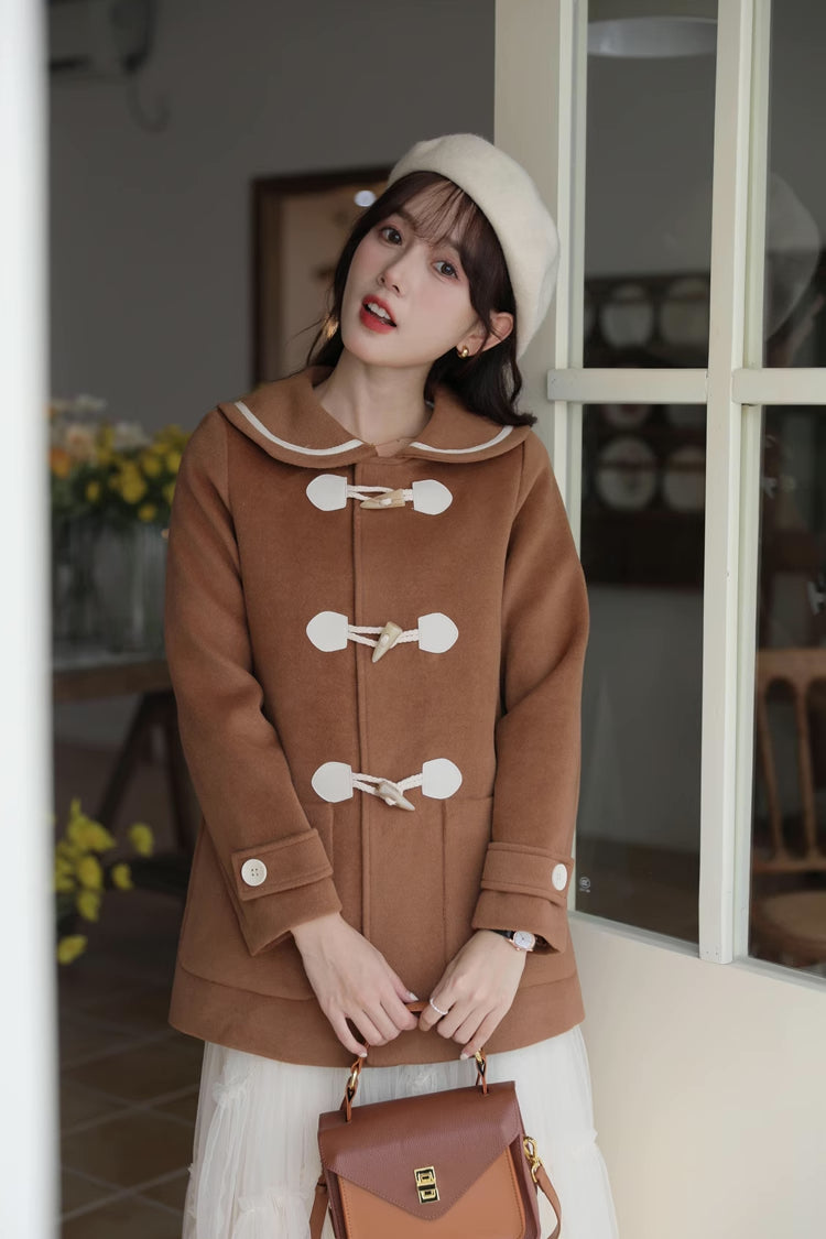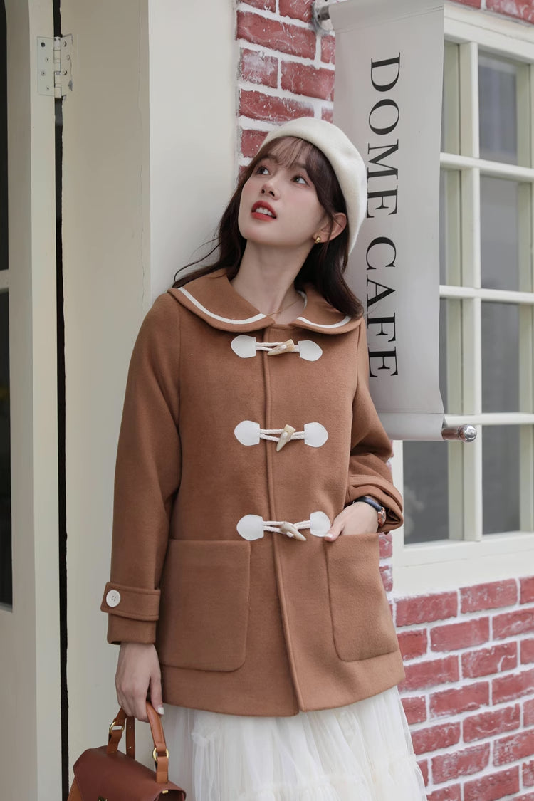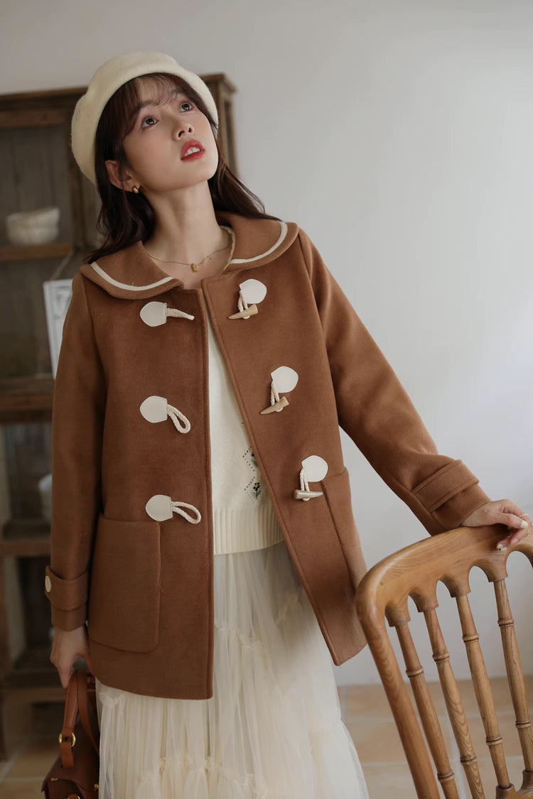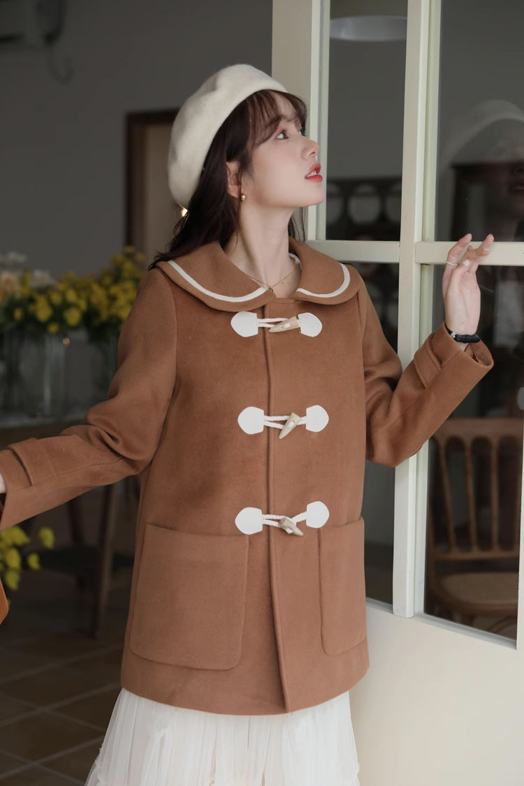 Chaqueta corta tipo trenca con cuello Peter Pan redondeado. Botones de palanca y amplios bolsillos laterales. Forrada.