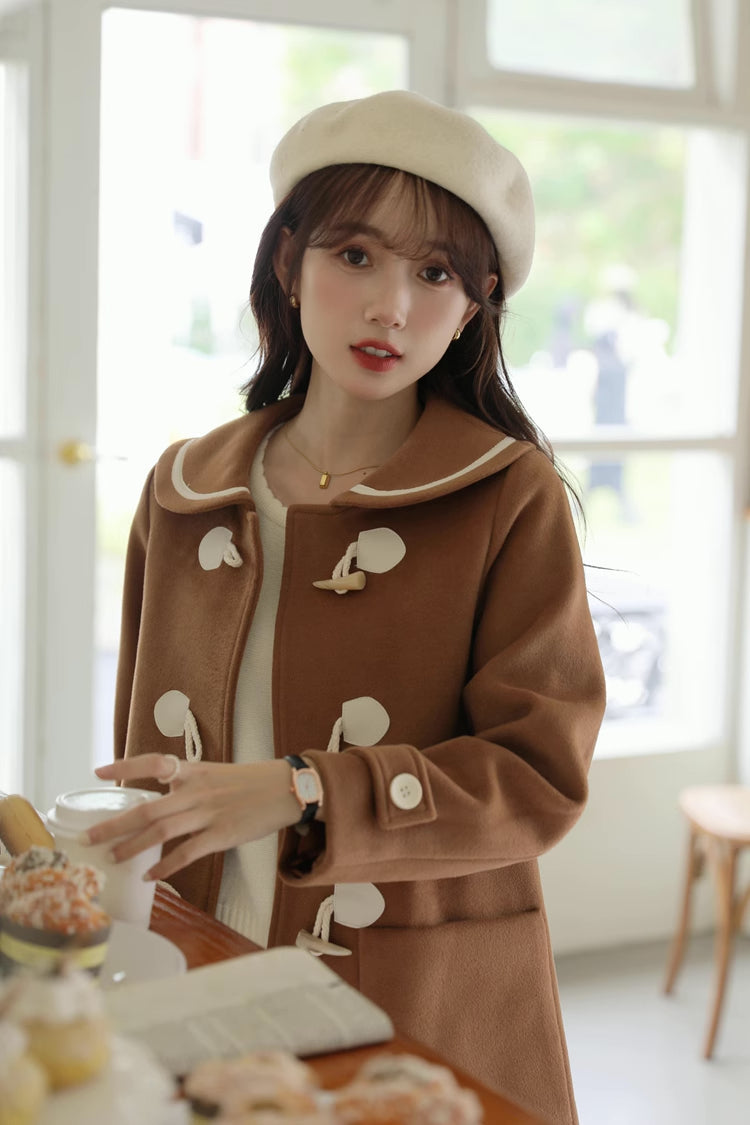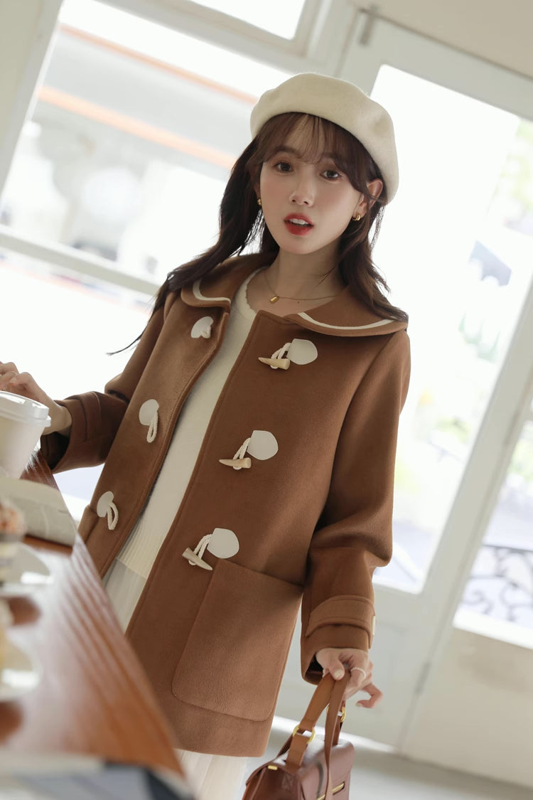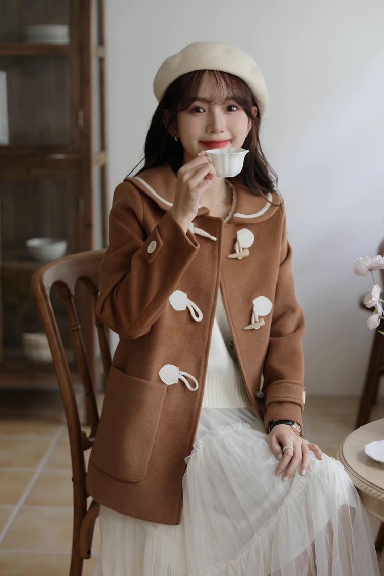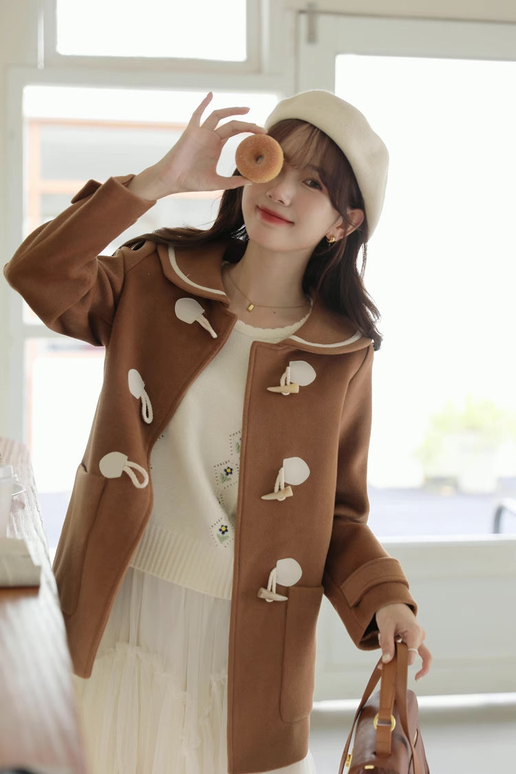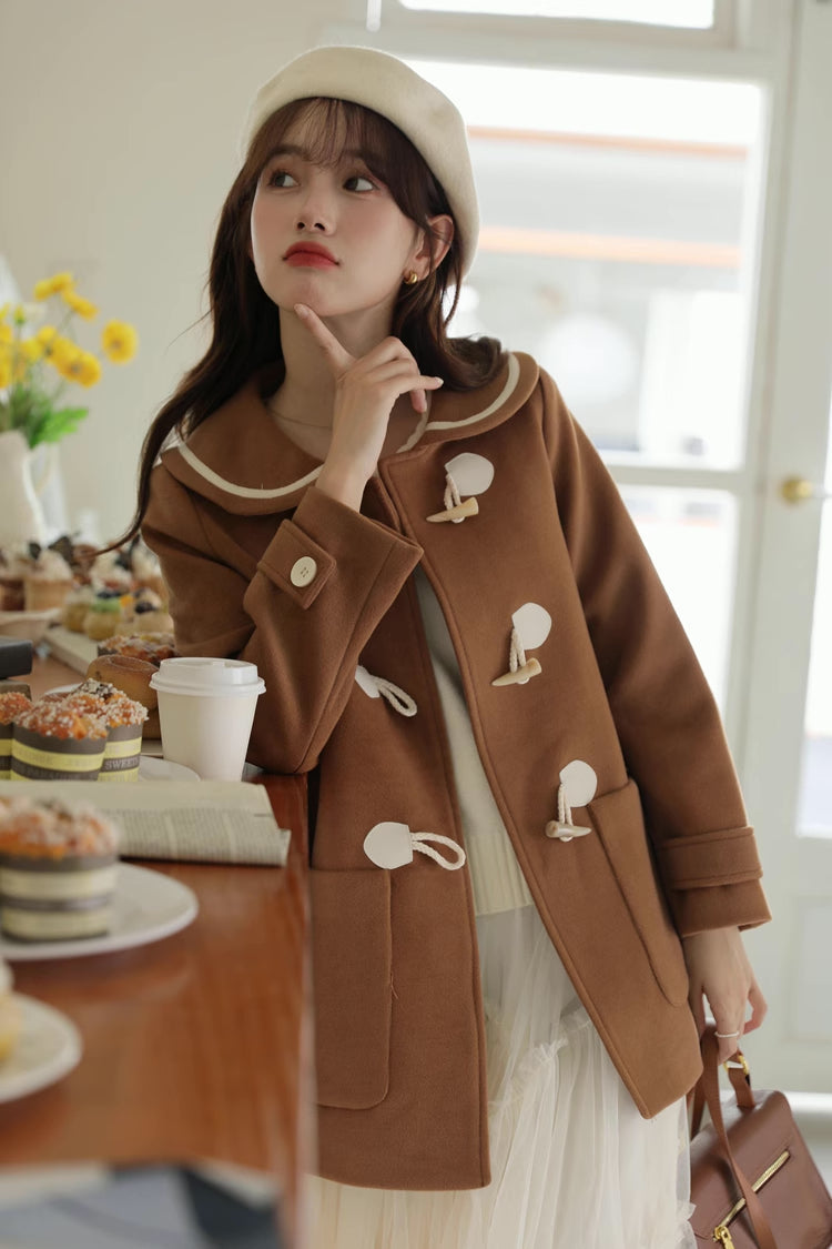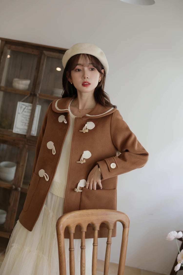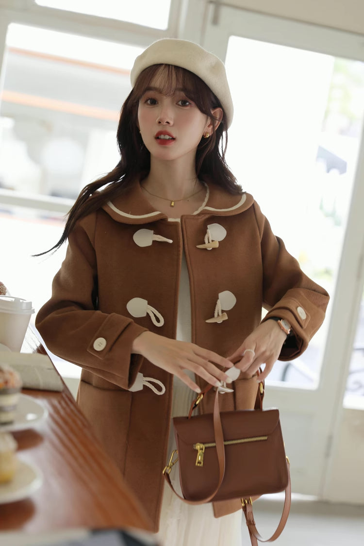 Chaqueta corta tipo trenca con cuello Peter Pan redondeado. Botones de palanca y amplios bolsillos laterales. Forrada.