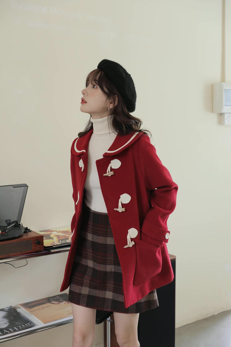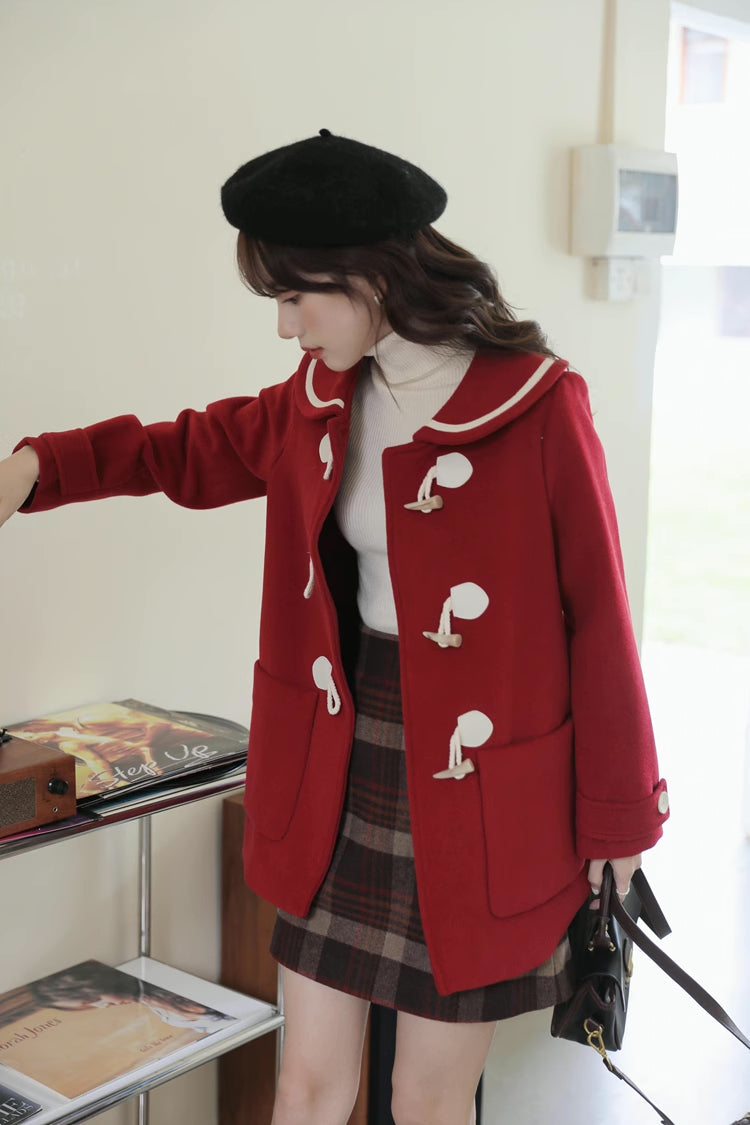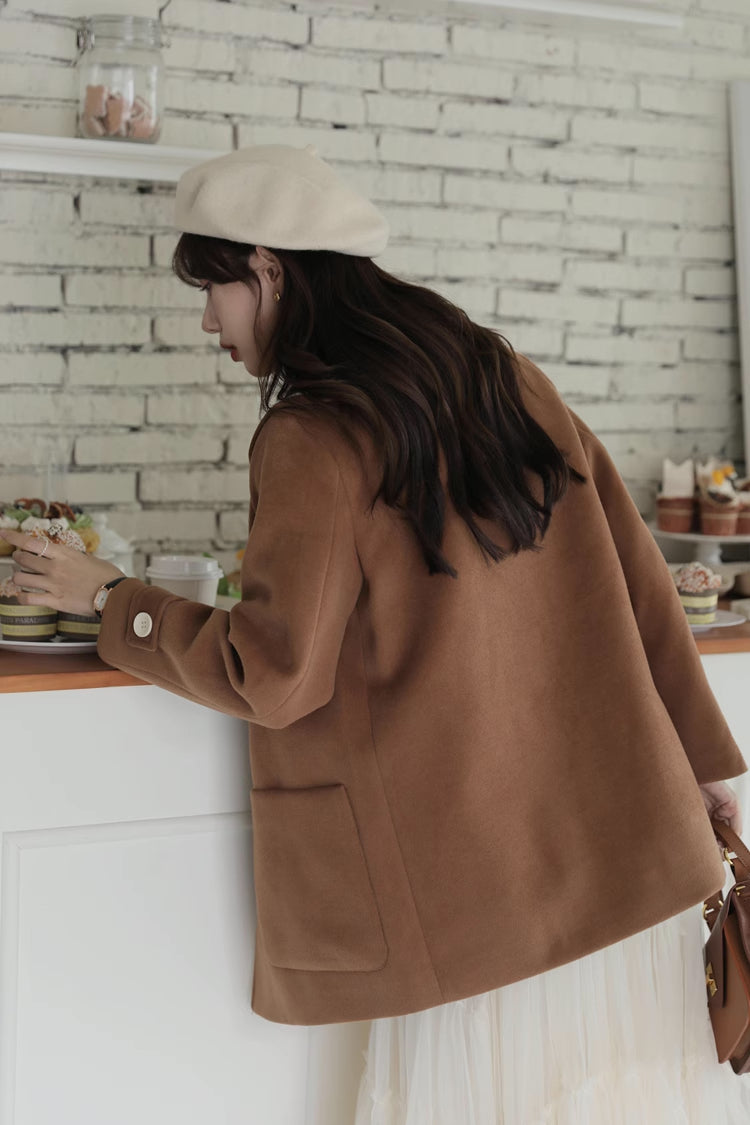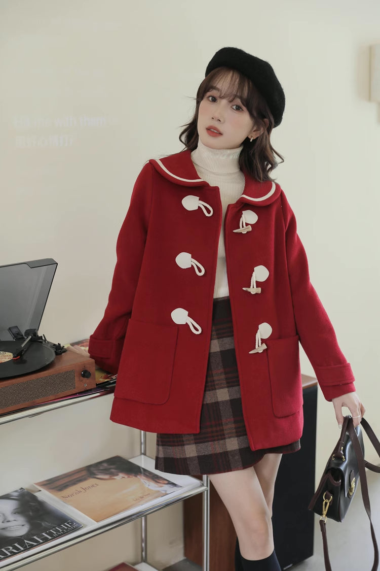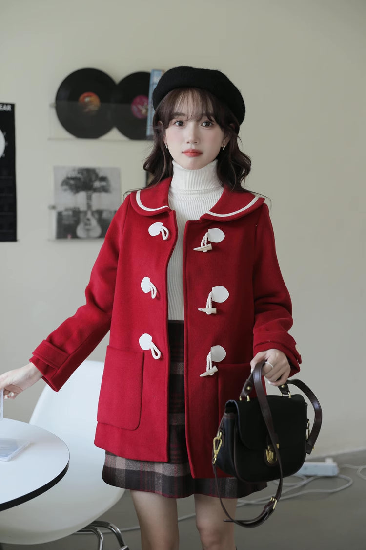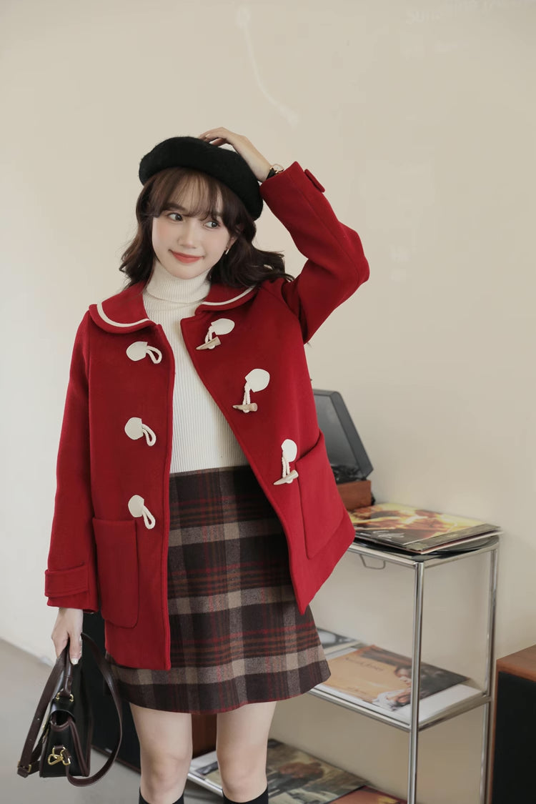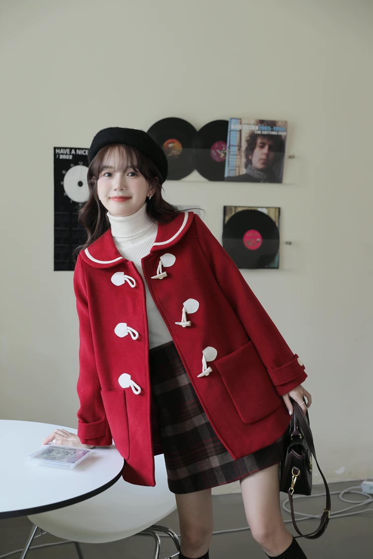 Chaqueta corta tipo trenca con cuello Peter Pan redondeado. Botones de palanca y amplios bolsillos laterales. Forrada.