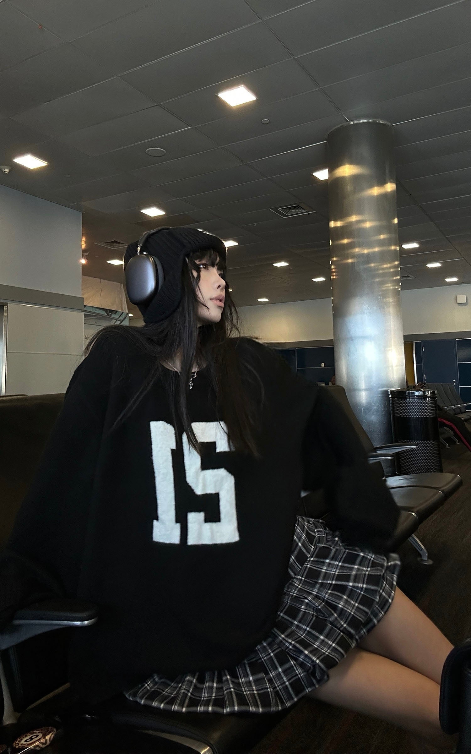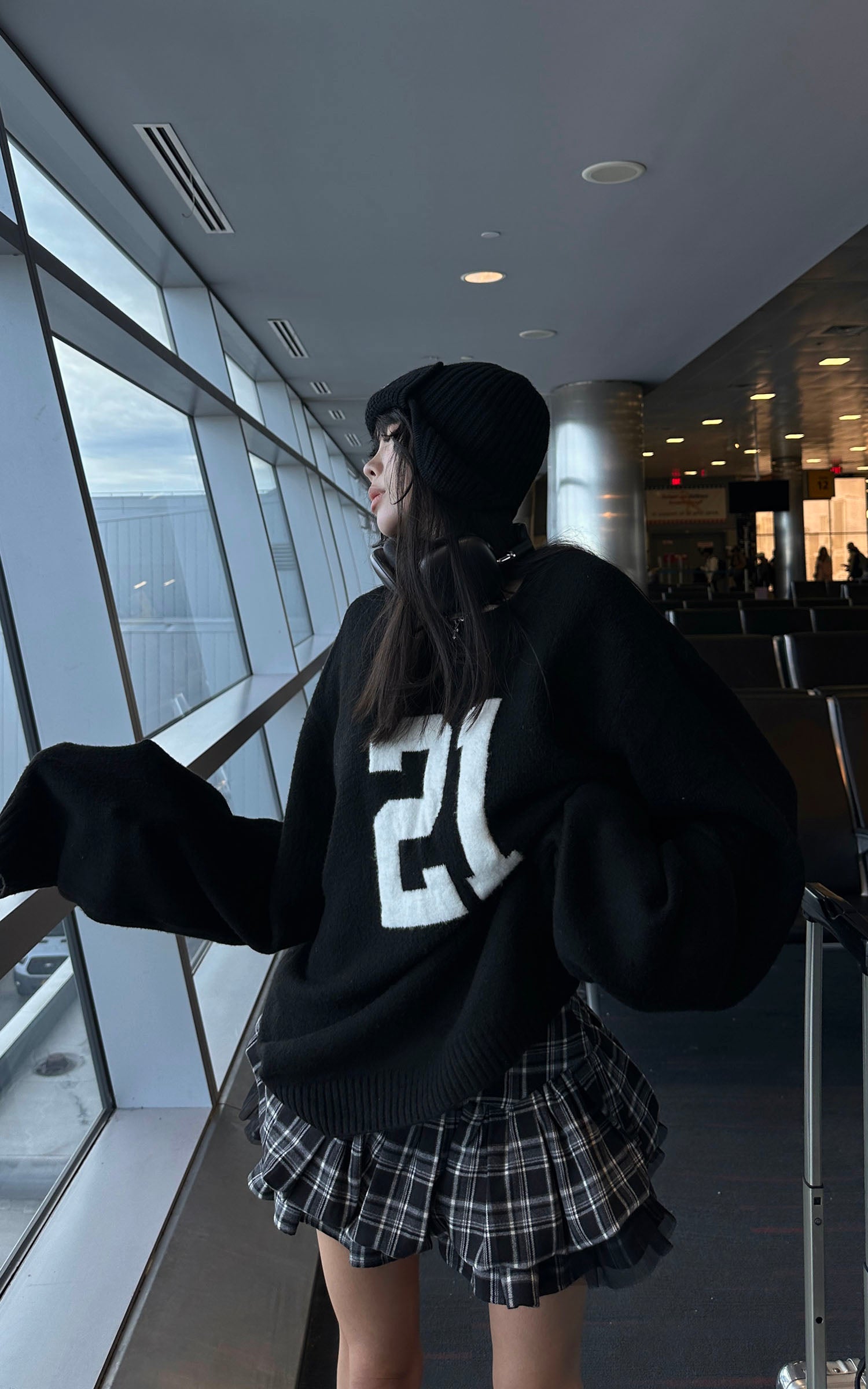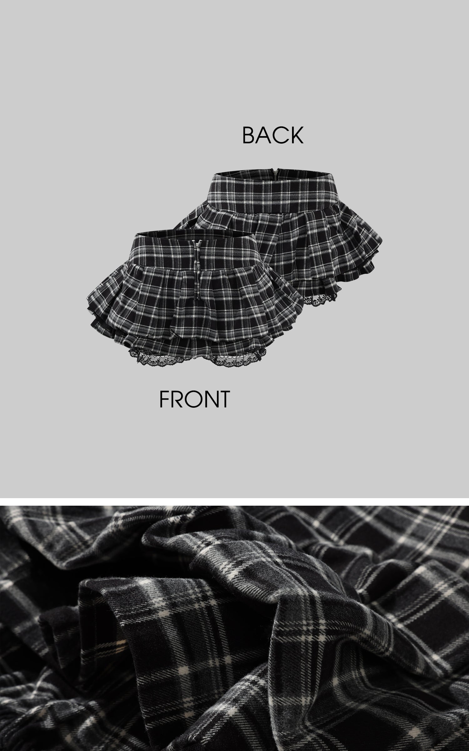 A layered plaid mini skirt that merges grunge energy with feminine detailing. The voluminous cut adds movement. while delicate lace trim at the hem softens the edge with subtle contrast. Designed with a mid-to-high waist and a clean back zip for effortless wear. Styled solo. it brings attitude; paired with oversized knits or structured outerwear. it completes a layered street-ready silhouette.