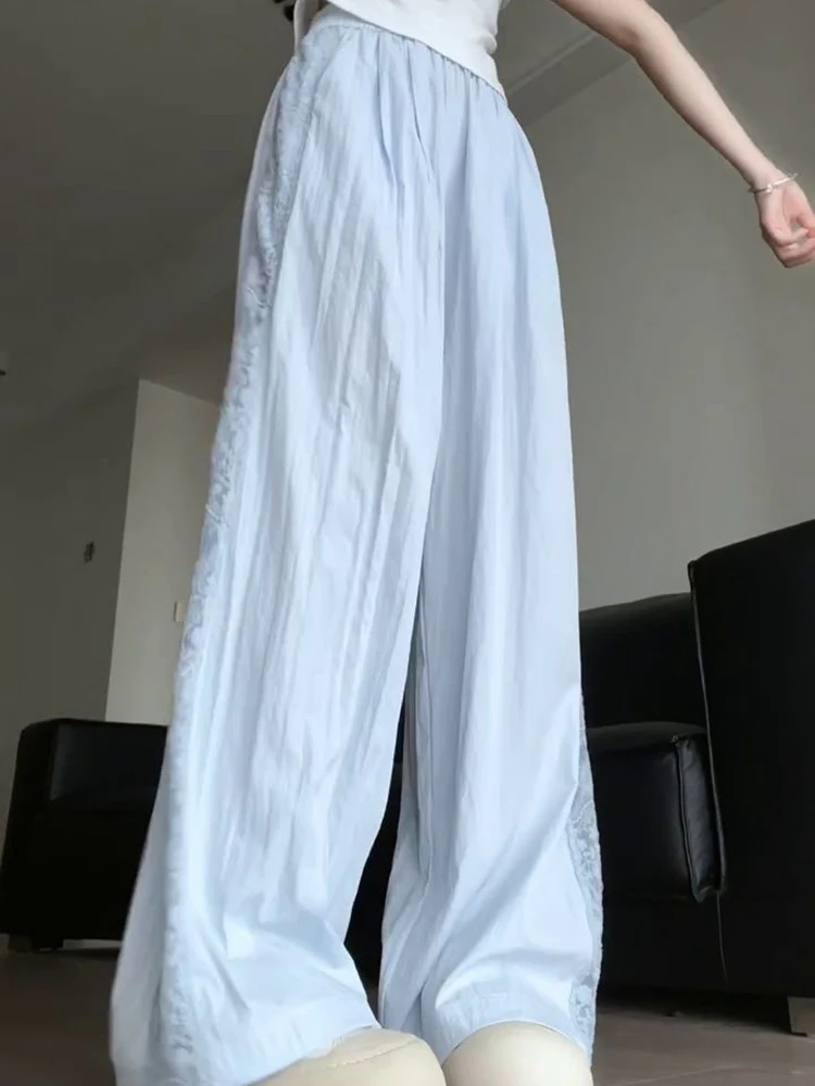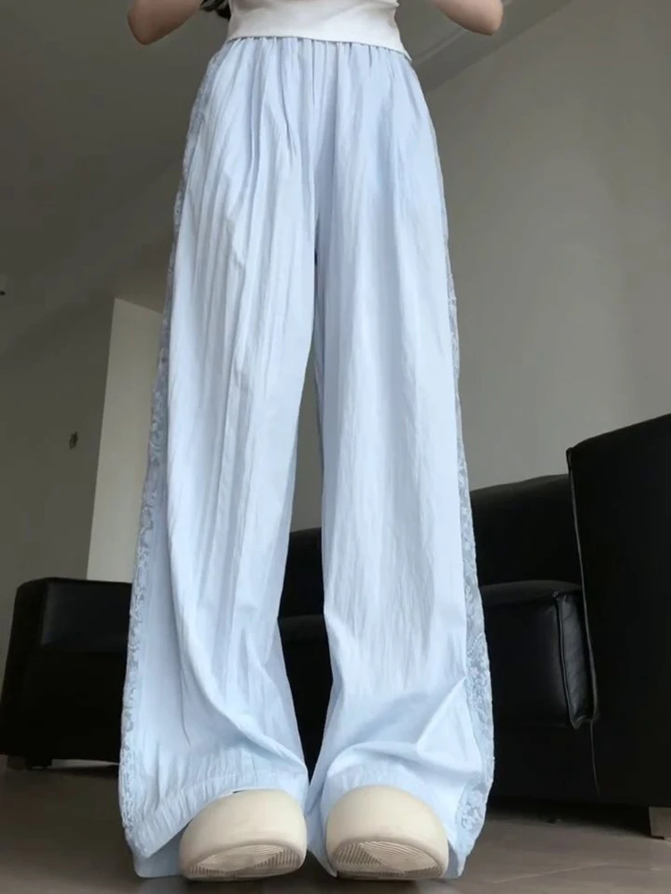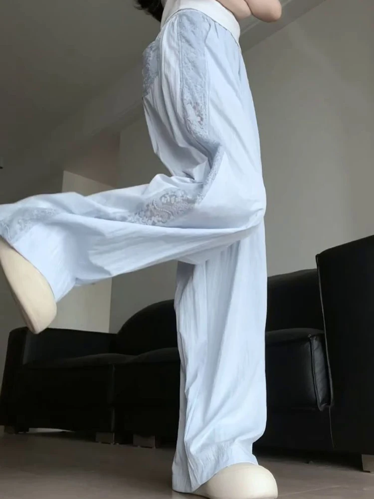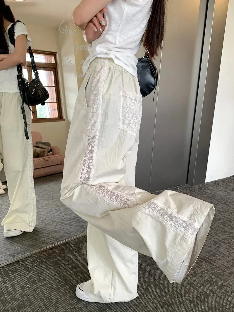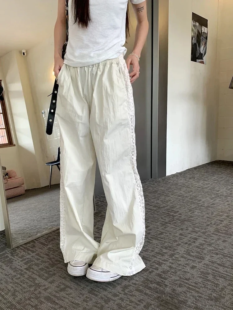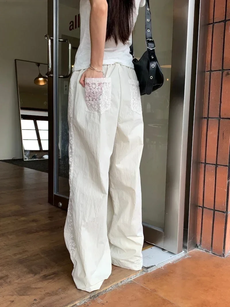 Sweet Lace Patchwork White Pants Y2K High Waist Preppy Thin Wide Leg Pants Korean Chic Loose Jogging Quick Drying Trousers New