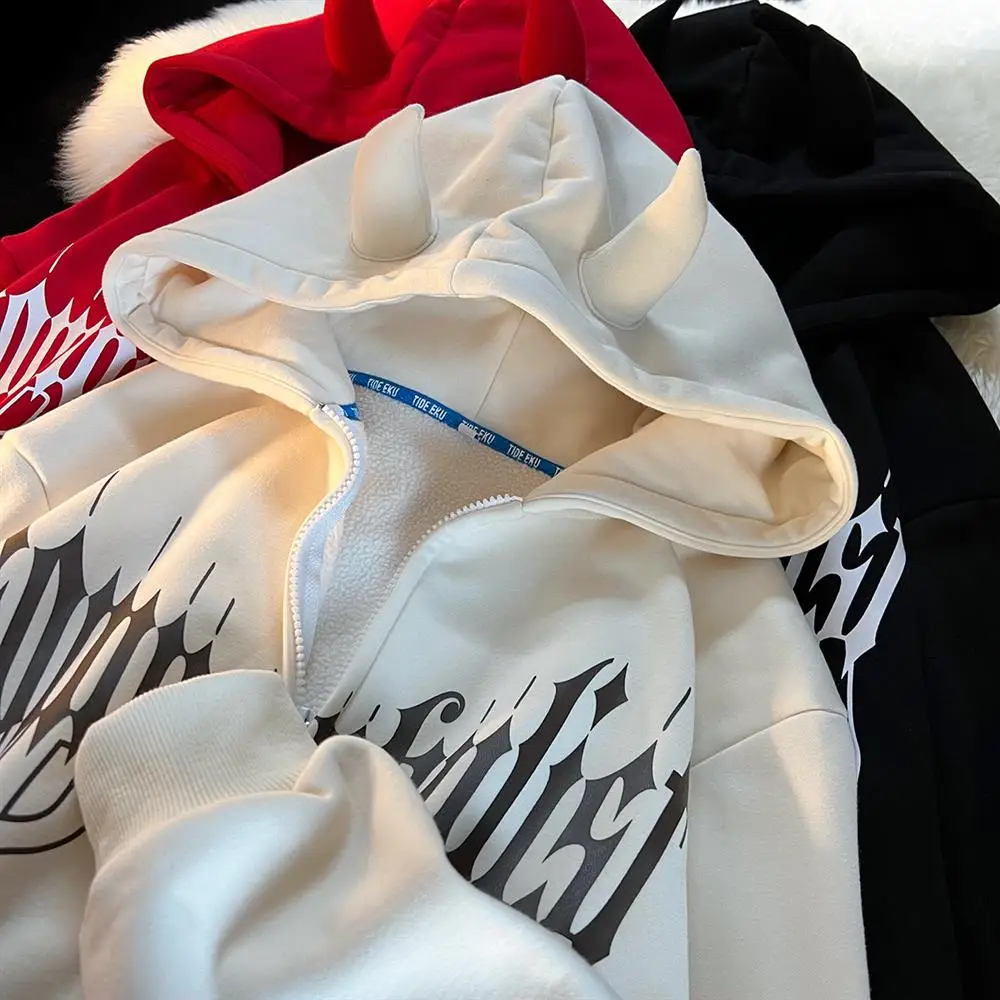 Dark Designer Devil Horn Tail Zip Up Hoodies Jackets Teenage Y2K Top Goth Print Oversized Sweatshirt Loose Casual Winter Clothes