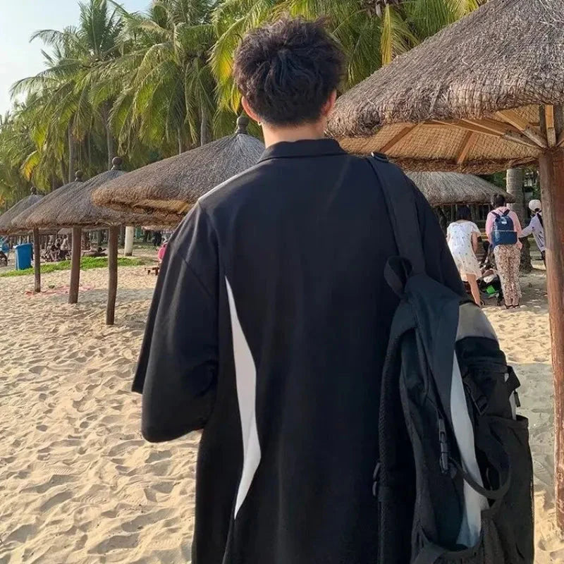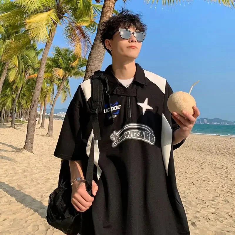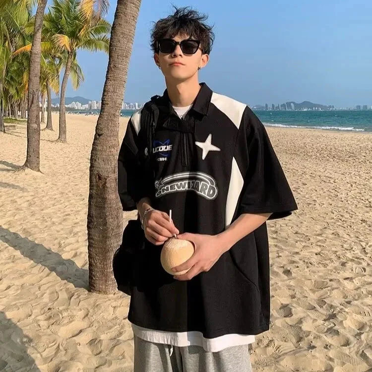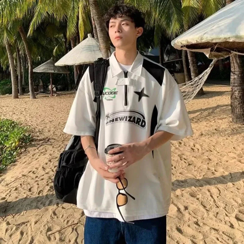 American Retro Short Sleeved Y2k Motorcycle Style Polo Collar Simple Versatile Loose Vintage Summer Couple T-shirt Casual Top