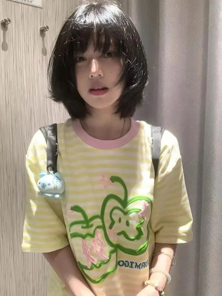 Apple Embroidery T Shirt Women Korean Style Striped Short Sleeved T-shirts Summer Y2k Clothes Gentle O Neck Tees Top