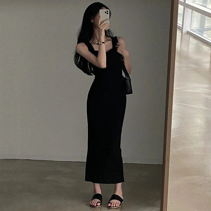 Basic Knit Long Dress Korean Fashion Square Collar Sleeveless Women's Dresses Summer Casual Y2k Vintage All-match Outftis