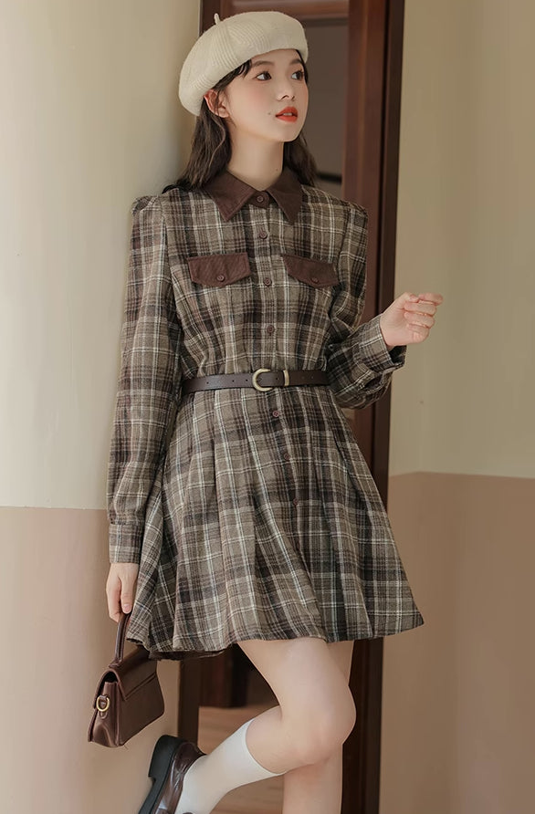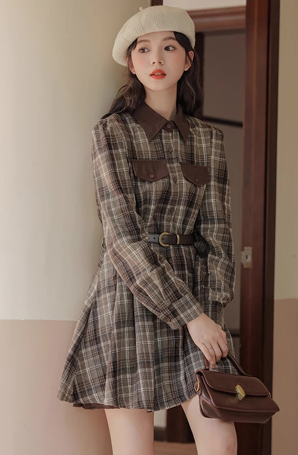 Long sleeve button front shirt dress with a classic collar. faux chest pockets. belted waist and mini pleated skirt in a plaid flannel fabric. Lined. Only top half of buttons are functional with a concealed side zipper closure. Belt included.