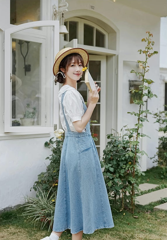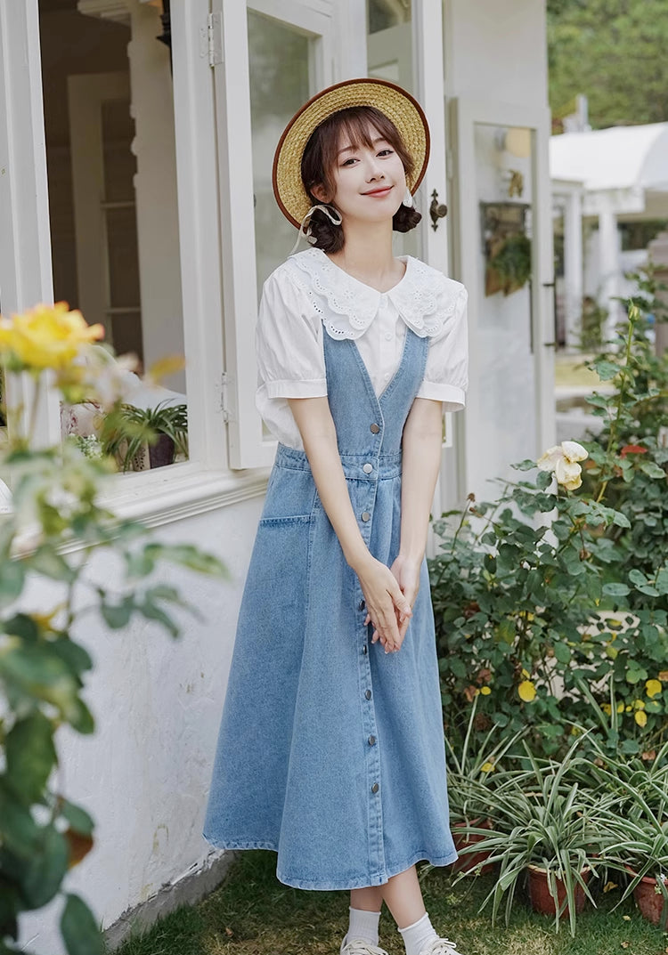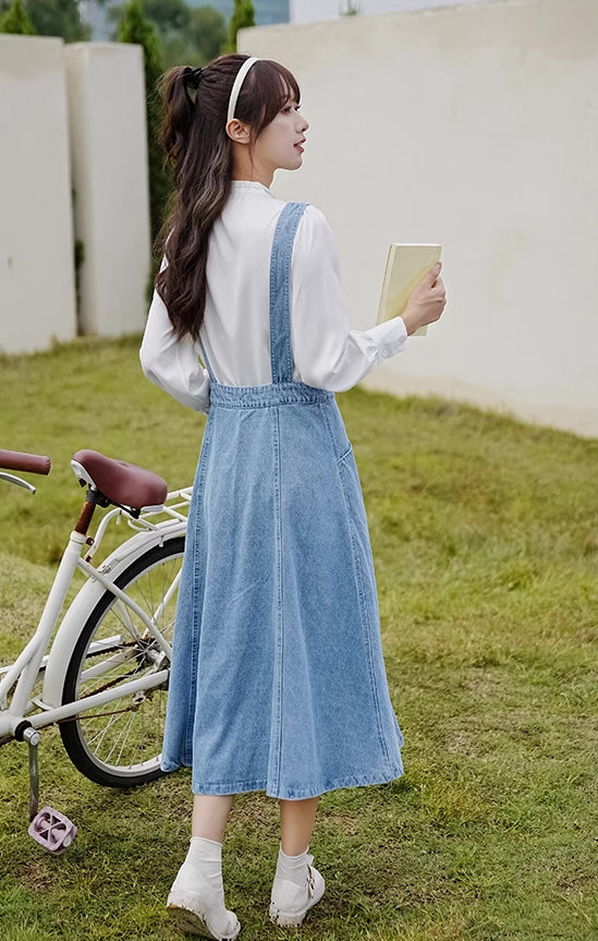 Button down pinafore dress with a v-neckline. thick shoulder straps. side pockets and swing midi skirt - perfect for layering with your favorite blouse or sweater.