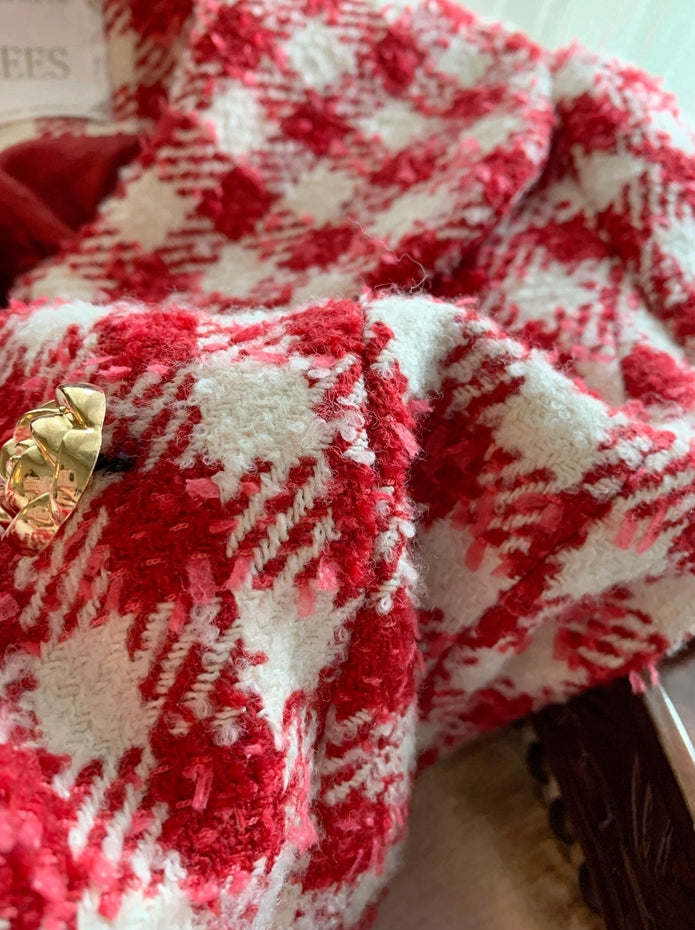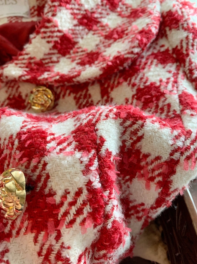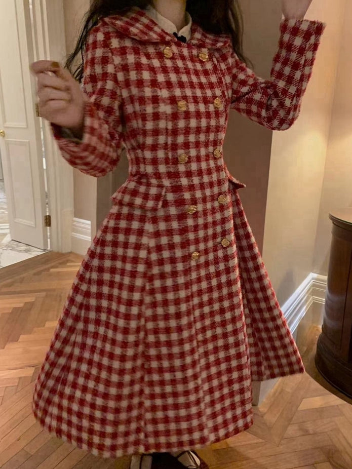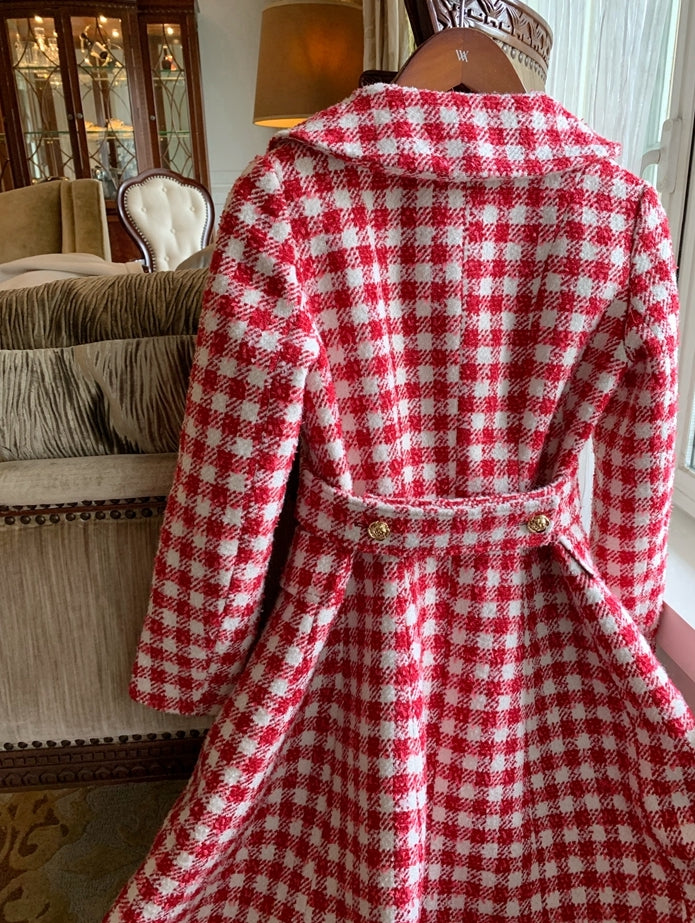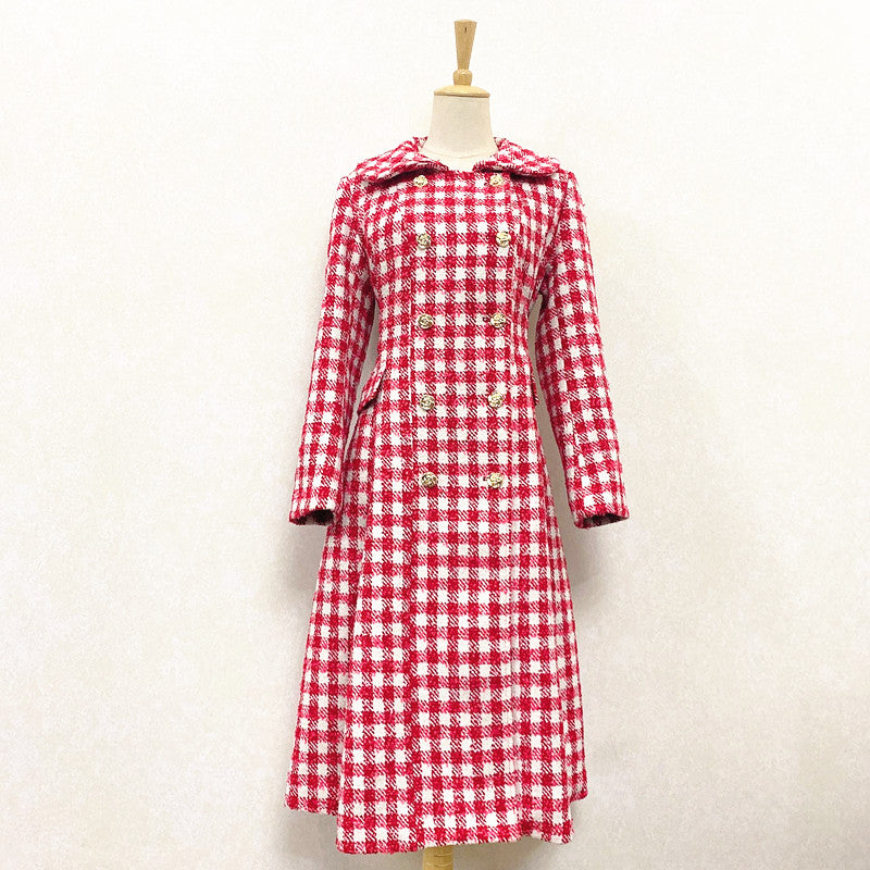 Premium vintage-inspired fit and flare swing coat in a stunning red and white gingham check pattern. This coat features a unique rounded peter pan collar. double breasted golden rose buttons. faux pocket flaps. belted waist back for a cinching effect. and pleated skirt hem. The entire jacket is padded heavily to give it a total weight of about 2kg/4.4lbs
