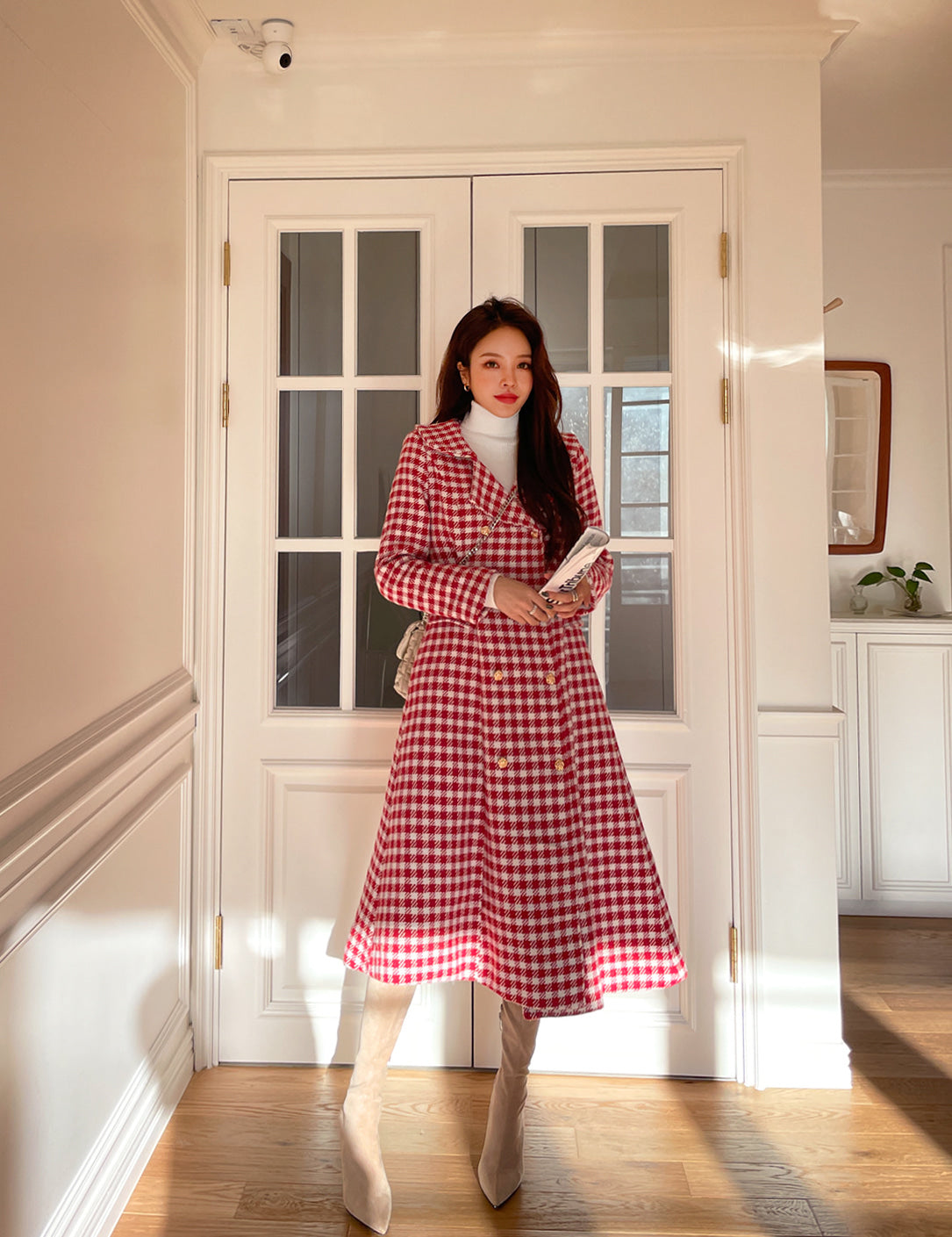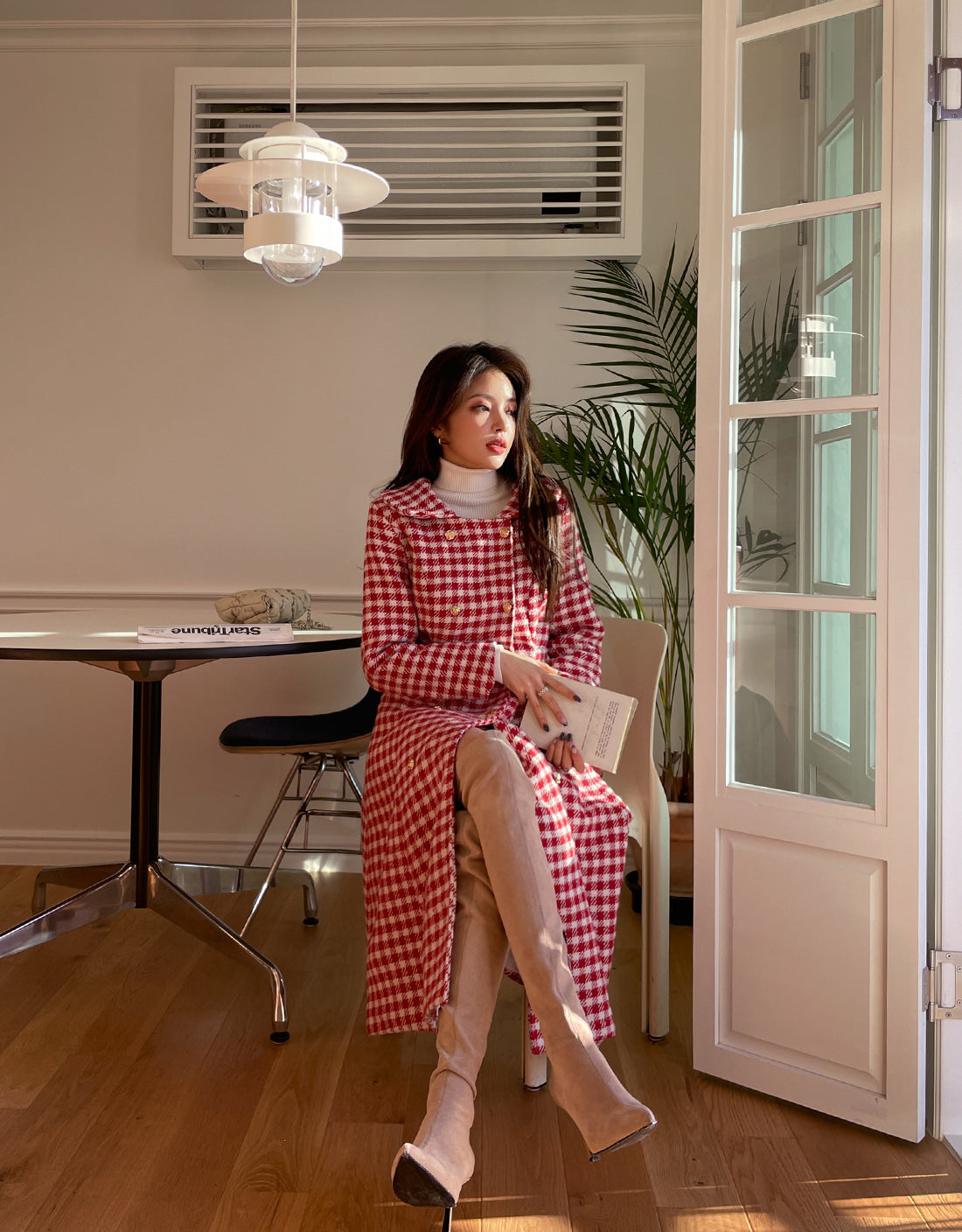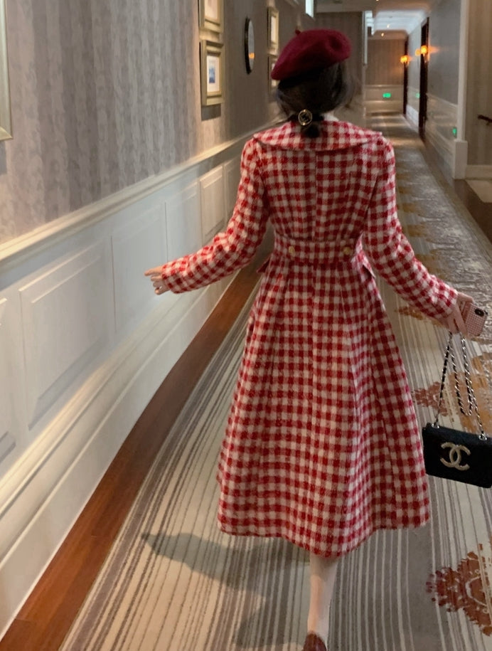 Premium vintage-inspired fit and flare swing coat in a stunning red and white gingham check pattern. This coat features a unique rounded peter pan collar. double breasted golden rose buttons. faux pocket flaps. belted waist back for a cinching effect. and pleated skirt hem. The entire jacket is padded heavily to give it a total weight of about 2kg/4.4lbs