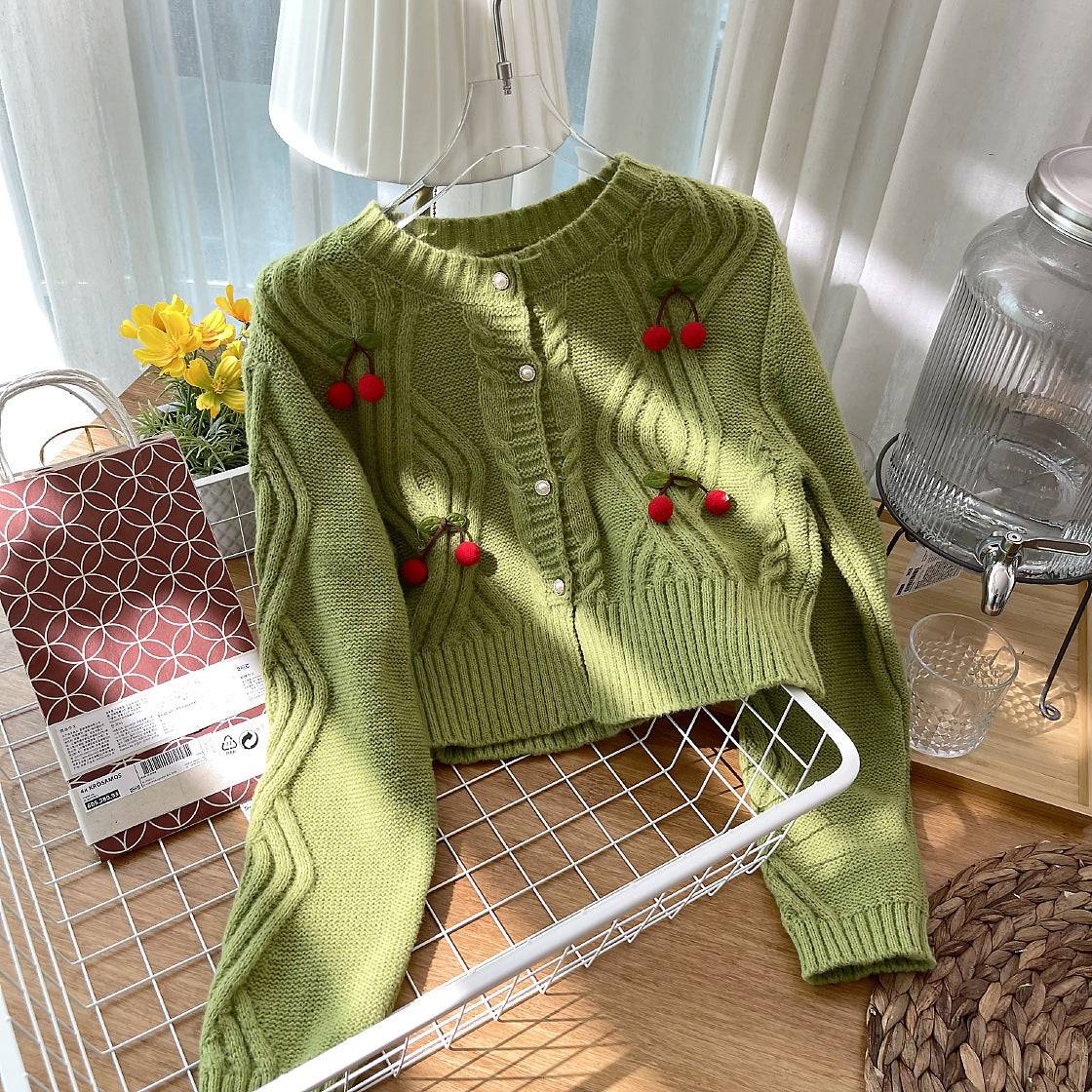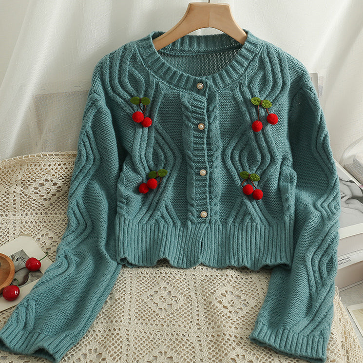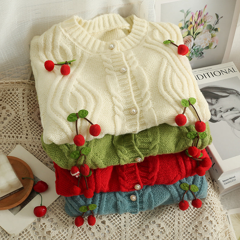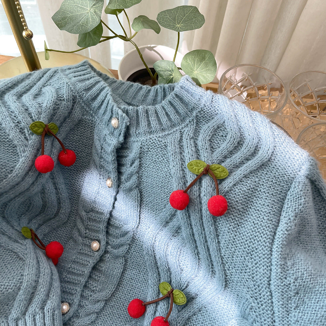 Round neck cropped knit cardigan with diamond chevron texture and pin-on cherry pom poms for full customisation.