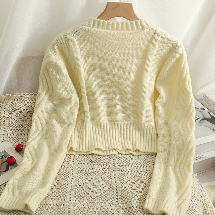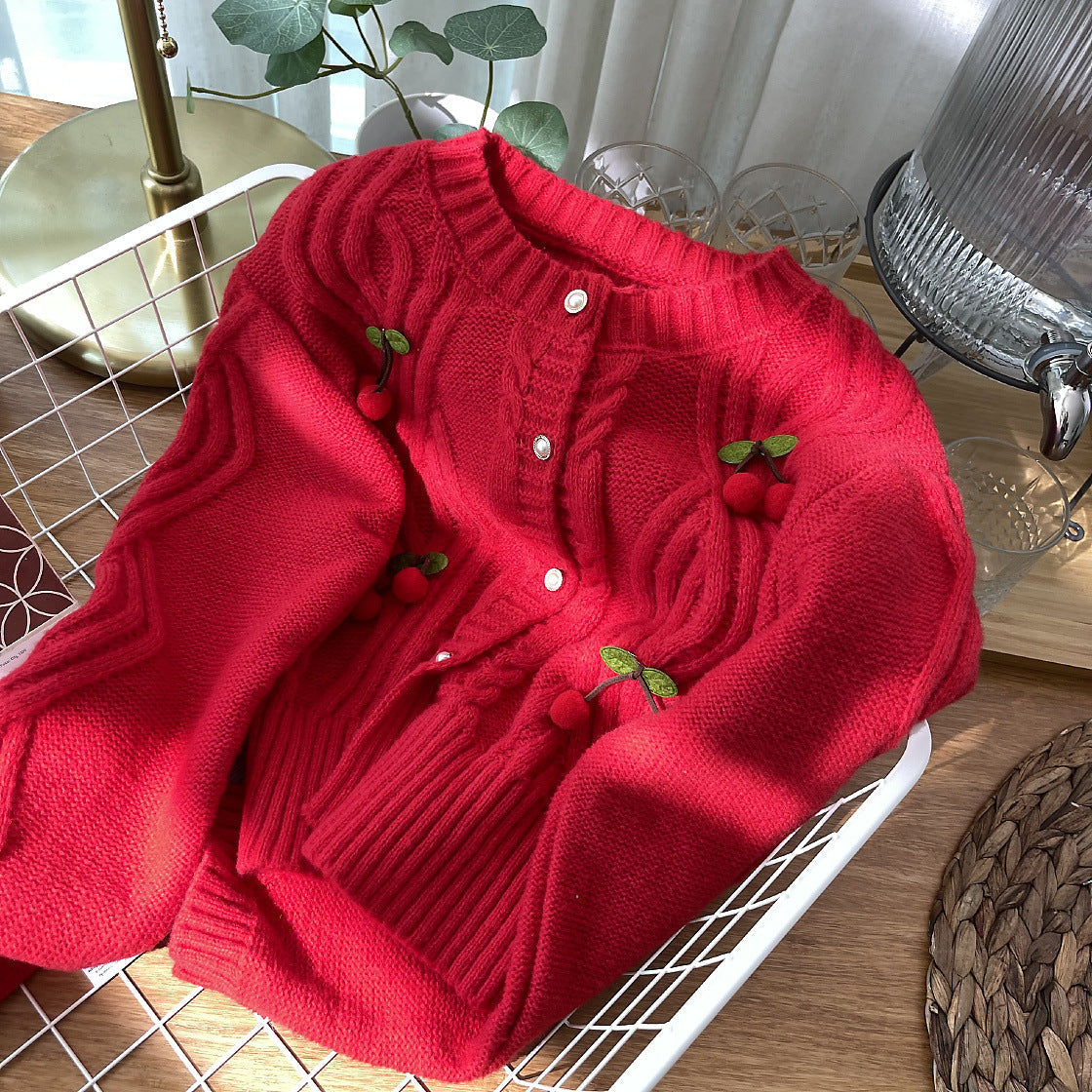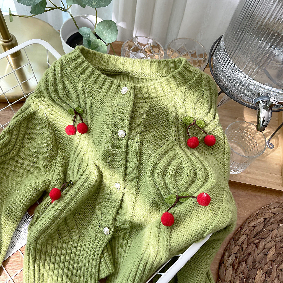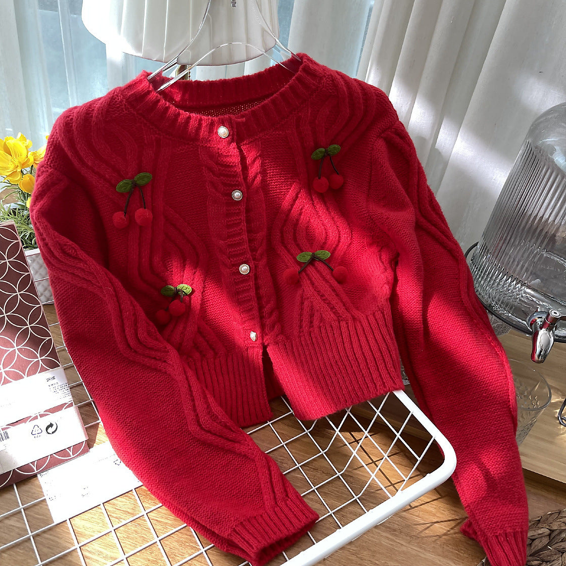Round neck cropped knit cardigan with diamond chevron texture and pin-on cherry pom poms for full customisation.